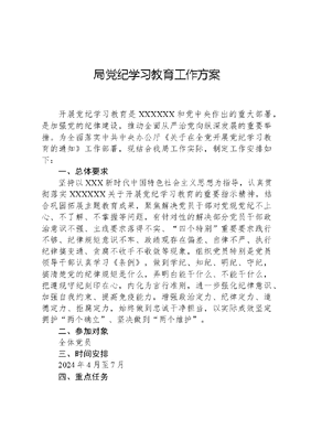 局党纪学习教育工作方案开展党纪学习教育是XXXXXX和党中央作出的重大部署,是加强党的纪律建设,推动全面从严治党向纵深发展的重要举措。为全面落实中共中央办公厅《关于在全党开展党纪学习教育的通知》工作部署,现结合我局工作实际,制定工作安排如下:一、总体要求坚持以XXX新时代中国特色社会主义思想为指导,认真贯彻落实XXXXXX关于开展党纪学习教育的重要指示精神,结合巩固拓展主题教育成果,聚焦解决党员干部对党规党纪不上心、不了解、不掌握等问题,有针对性的解决部分党员干部政治意识不强、主线要求落得不实、四个特别重要要求践行不够、纪律规矩意识不牢、政绩观存在偏差、自律不严、执行纪律搞变通、贪腐不收手不收敛等现象,组织党员特别是党员领导干部认真学习《条例》,做到学纪、知纪、明纪、守纪,搞清楚党的纪律规矩是什么,弄明白能干什么、不能干什么,把遵规守纪刻印在心,内化为言行准则,进一步强化纪律意识、加强自我约束、提高免疫能力,增强政治定力、纪律定力、道德定力、拒腐定力,始终做到忠诚干净担当,以实际成效坚定拥护两个确立、坚决做到两个维护。二、参加对象全体党员三、时间安排2024年4月至7月四、重点任务(一)潜心学纪,推动条例入脑入心聚焦解决纪律规矩意识不强,《条例》入脑入心不够的问题,采取领导干部研讨学,广大党员普遍学的方式,深入学习贯彻《条例》,使全局党员干部全面理解党的纪律的严肃性和权威性,切实增强纪律意识。1.以自学为基本形式打好理论基础。党组班子成员要制定个人的自学计划,基层党组织要对党员、干部自学《条例》在内容、进度、质量等各个方面提出具体要求,普通党员要以承诺书的形式明确学习目标和学习任务,基层党支部书记要适时通过谈心谈话等形式了解党员学习实际情况并加以督促指导。2.以党组理论学习中心组、党支部三会一课为主要形式深化学习研讨。局机关及下设二级单位要通过理论学习中心组、基层党支部通过党员大会持续开展针对党的政治纪律、组织纪律、廉洁纪律、群众纪律、工作纪律、生活纪律等6个专题的学习研讨,深入检视查摆自身存在的问题及刚刚冒头的苗头性倾向性问题,在学习中找准解决及预防方法,在讨论中明确产生问题的根源并及时加以整改;党支部委员要在支委会会议上先学一步、学深一层,党小组要针对学习中的难点重点不断加强学习;党组书记要在党纪学习教育启动初期和七一期间各讲一次纪律党课,基层党支部书记结合本支部工作开展情况适时讲一次纪律党课。3.以读书班为重要形式开展专项辅导。局党组要在4月底前专门安排至少5个工作日,举办党纪学习教育读书班,对班子成员实现全覆盖式强学强记,重点章节现场学、难点内容辅导学。深刻领悟XXXXXX关于党的自我革命的重要思想,并与实际工作紧密联系、追踪落实。4.以主题党日为创新形式提升学习质效。各基层党支部在党纪学习教育开展期间,结合本单位实际就近就便利用好廉政文可居文库——海量学习资料,手机电脑均可下载www.wenkeju.com教育、警示教育基地等资源,开展1次警示教育主题党日活动,党员领导干部以普通党员身份参加,让广大党员把遵规守纪刻印在心。要善于与其它学习形式相结合,聚焦统筹深化,兼顾党员、干部及员工群众等不同群体特点。(二)开展警示教育,强化自觉遵纪聚焦解决党员干部存在的警醒不足、敬畏不够、底线不明守纪不严问题,开展干部队伍警示教育行动、正风肃纪行动和廉洁文化建设行动,强化全局广大党员的纪律观念,坚决守住纪律底线,在工作中严格遵守党的纪律,做到忠诚干净担当。1.持续开展警示教育行动。局党组要用好违纪违法干部警示录、忏悔录、警示教育片和警示教育基地等资源,强化警示威慑,让党员干部受警醒、明底线、知敬畏。深入剖析巡视巡察发现的问题,加强对整改落实和成果运用情况的汇总分析,举一反三,认真排查廉政风险点,推动以改促建,以减促治,组织召开警示教育会,推动以案为鉴、以案促学、以案促改促治。发挥典型案例活教材作用,通过典型案例等集中警示,引导广大党员干部对照检视、自查自省,做到防微杜渐。2.强化开展正风肃纪行动。结合群众身边不正之风和腐败问题集中整治以及干部不作为、慢作为、乱作为问题全面整肃,推动干部转变工作作风,有效解决群众反映强烈的突出问题。3.广泛开展廉洁文化建设行动。将纪律教育和家风教育相结合,督促领导干部从严管好亲属子女,通过廉政家访、廉政座谈等方式,广泛开展党员干部家属廉政教育,推动形成廉荣贪耻的社会氛围。(三)深化《条例》理解运用,做到知行合一坚持学用结合、知行合一,通过多维度培训、全方位自检确保学到深处、用到实处,并及时发现整改存在的各类问题。1.重点开展四类培训。主要针对党组班子成员开展读书班;文可居文库——海量学习资料,手机电脑均可下载www.wenkeju.com针对新提拔干部