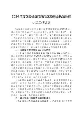 2024年度区委全面依法治区委员会执法协调小组工作计划2024年区行政执法工作要全面贯彻落实党的XXX精神,深刻领悟两个确立的决定性意义,增强四个意识、坚定四个自信、做到两个维护,深入贯彻落实自治区第十三次党代会和市委X次党代会精神,紧紧围绕区委全面依法治区委员会工作部署,持续深化行政执法体制改革 ,全面推进严格规范公正文明执法,强化行政执法监督机制和能力建设,扎实推进依法行政,奋力推进区行政执法工作高质量发展。一、持续学习贯彻落实XXX法治思想(一)深入学习贯彻落实党的XXX精神和XXX法治思想。深入学习贯彻落实党的XXX精神和XXX法治思想,坚守法治初心、增强法治信心、强化责任担当,切实运用XXX法治思想武装头脑、指导实践、推动工作。严格落实《党政主要负责人履行推进法治建设第一责任人职责规定》,各级行政执法机关主要负责同志要切实担负起履行推进法治建设第一责任人职责,适时组织培训,带头对XXX法治思想进行解读,召开会议听取执法工作情况,找准工作着力点,确保各项工作任务落实。(责任单位:各乡镇、各行政执法部门)(二)不断加强依法行政能力和水平。认真贯彻落实中央、自治区、中卫市《关于进一步加强市县法治建设的意见》,不断加强区依法行政能力和水平,加强各行业领域法律法规政策学习,不断增强运用法治思维和法治方式解决问题的能力和水平,做到依法行政,不断推动区法治政府建设率先突破。(责任单位:各乡镇、各行政执法部门)二、健全完善行政执法体制机制建设(三)深化综合行政执法体制改革 。严格落实《中卫市深化市辖区跨领域跨部门综合执法改革实施方案》,不断完善协调联动机制,实现违法线索互联、执法标准互通、处理结果互认。贯彻落实《中卫市开展县乡综合执法联动改革试点工作实施方案》,不断完善乡呼县应执法联动机制。开展城市管理、市场监管、生态环境保护、文化市场、交通运输、农业 、应急管理等领域综合行政执法改革推进情况督促检查,理顺综合行政执法体制机制,严格落实有关改革任务要求。(责任单位:区委编办、区司法 局、区住建和交通局、区农业 农村局、区旅游和文体广电局、区卫健局、区应急管理局、区综合执法局、区生态环境分局、区市场监管分局、各乡镇)(四)完善基层综合执法体制机制。加强对下沉乡镇执法事项的指导和监督,推动行政处罚事项评估和调整。将点多面广、基层管理真正迫切需要并且确实能有效惩戒的审批服务执法等权限赋予乡镇,确保放得下、接得住、管得好、有监督,不断提升基层治理能力和水平。(责任单位:区委编办、区政府办、区司法 局、区直有关部门、各乡镇)(五)保障行政执法经费。行政执法经费由区同级财政予以保障,严格贯彻罚缴分离和收支两条线管理制度。罚没收入完全与作出行政处罚的行政执法机关的经费脱钩,与作出行政处罚的行政执法人员的考核、考评脱钩。(牵头单位:区财政局;责任单位:各乡镇、各行政执法部门)三、不断提升行政执法规范化建设(六)加大力度落实行政执法三项制度。严格落实《关于全面推行行政执法公示制度执法全过程记录制度重大执法决定法制审核制度的指导意见》《自治区行政执法三项制度规定》,逐步实现行政执法三项制度乡镇全覆盖。按照谁执法、谁公示谁执法、谁录入、谁负责的原则,全面准确及时依法向社会主动公开行政执法信息,做到应公开尽公开,主动接受社会监督。严格执行《中卫市行政执法音像记录设备配备办法》,明确音像记录的关键环节、记录方式以及应进行全过程音像记录的现场执法活动和执法场所,将行政执法的启动、调查取证、审核决定、送达执行等执法过程信息通过文字、音像等形式进行全程记录,注重对行政执法全过程记录信息的保存和管理,推行一户式集中储存,做到执法全过程留痕和可回溯管理。对查封扣押财产、强制拆除等直接涉及人身自由、生命健康、重大财产权益的现场执法活动和执法办案场所,实行全程音像记录。不断健全法制审核工作机制,各级行政执法机关明确具体负责本单位重大执法决定法制审核的工作机构,将政治素养高、业务能力强、具有法律专业背景的人员充实到法制审核岗位。重大执法决定作出前均严格进行法制审核,原则上负责法制审核的人员不少于本单位执法人员总数的5%。积极发挥法律顾问、公职律师作用,加强法制审核力量。(责任单位:各乡镇、各行政执法部门)(七)全面提升行政执法质量。开展行政执法质量提升三年行动。健全完善行政执法投诉举报制度,积极受理行政执法投诉举报案件,及时查处群众举报的违法行为,杜绝行政执法不作为、乱作为、一刀切等突出问题。建立行政执法案卷评查长效机制和通报制度,常态化开展案卷评查工作,切实提高执法人员办案水平,规范行政执法程序。全面、严格落实行政执法告知制度,依法保障行政相对人陈述、申辩、提出听证申请等权利。(牵头单位:区司法局;责任单位:各乡镇、各行政执法部