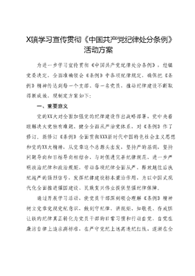 X镇学习宣传贯彻《中国共产党纪律处分条例》活动方案为进一步学习宣传贯彻《中国共产党纪律处分条例》,经镇党委决定,全面准确领会《条例》中各项纪律规定,确保把《条例》精神传达到每一个支部、每一名党员,推动纪律建设不断取得新成效,现制定方案如下:一、重要意义党的XX大对全面加强党的纪律建设作出战略部署,党中央着眼解决大党独有难题、健全全面从严治党体系,对《条例》作了修订。新修订《条例》全面贯彻XXX新时代中国特色社会主义思想和党的XX大精神,从党章这个总源头出发,坚持严的基调,坚持问题导向和目标导向相结合,与时俱进完善纪律规范,进一步严明政治纪律和政治规矩,带动各项纪律全面从严,释放越往后执纪越严的强烈信号,发挥纪律建设标本兼治作用,为以中国式现代化全面推进强国建设、民族复兴伟业提供坚强纪律保障。通过开展学习活动,使党员干部深刻领会理解《条例》精神树立党章党规党纪意识,做到守纪律、讲规矩、知敬畏、存戒惧让铁的纪律真正转化为党员干部的日常习惯和行动自觉,自觉在廉洁自律上追求高标准,在严守党纪上远离违纪红线,逐渐在全局形成尊崇制度、遵守制度、捍卫制度的良好风尚,推动全面从严治党向纵深发展。二、目标任务站位新时代,从旗帜鲜明讲政治的高度认真学习、深入领会准确把握《条例》的核心要义,对比新旧《条例》,详细学习新修订《条例》,力求准确把握其内涵要义和实践要求,切实做到学深学透。把学习贯彻《条例》与学习贯彻XXXXXX关于全面从严治党、加强纪律建设的重要论述结合起来,与学习党章党规、宪法和监察法结合起来,要充分认识学习宣传贯彻《条例》的重大意义,以高度的政治责任感,以对党和人民事业高度负责的精神切实抓好《条例》的学习宣传和贯彻落实。三、活动内容(一)深入动员广泛宣传。镇机关充分运用宣传媒体广泛开展宣传工作,及时发布全镇各级与《条例》相关的新闻报道,权威解读《条例》修订的背景意义、条文内涵等内容,帮助党员干部加深对《条例》的认识与理解,着力营造浓厚的学习氛围,迅速掀起学习贯彻的热潮。在学习期间及时总结学习宣传贯彻《条例》的举措、成效、经验等情况,积极向略阳电视台、略阳发布兴州先锋、嘉陵清风微信公众号等主流宣传媒体报送信息稿件。(二)开展专题集中学习。结合实际制定学习计划,及时将《条例》纳入党委会、理论学习中心组学习内容,作为党员领导干部必修课,推动党员领导干部带头深入学习、带头贯彻执行。各级党支部以三会一课、主题党日、集中学习日等活动为载体,采取线上学+线下学集中学+个人学的方式,组织广大党员干部联系实际学,深入思考学,切实筑牢思想和纪律防线。集中学习研读《条例》原文及释义读本、学习问答等辅导读物,全面准确领会《条例》中各项纪律规定,确保把《条例》精神传达到每一个支部、每一名党员。(三)知识测试检验成效。七一前夕,镇党委组织全镇党员干部及公职人员开展一次《条例》知识测试活动,以考促学督促党员干部加深对《条例》基本内容的理解和掌握。各党支部通过开展演讲、知识竞赛、主题征文、专题访谈、交流研讨等多种形式,推动《条例》学习宣传贯彻工作走深走实。四、工作要求(一)严密组织,全面覆盖。成立《条例》学习宣传贯彻活动领导小组,镇党委书记任组长,纪委书记组织委员任副组长,镇纪委副书记、纪检专干为成员,具体负责活动日常工作。思想上高度重视,把纪律建设作为全面从严治党的治本之策,切实履行好管党治党的主体责任,切实加强对《条例》学习宣传贯彻工作的组织领导,对本单位学习宣传贯彻《条例》工作作出安排部署,列入重要议事日程,确保实现教育对象全覆盖。(二)学用结合,抓好落实。切实把自己摆进去,把职责摆进去,把工作摆进去,坚持原原本本学、联系实际学、深入思考学,真正把《条例》刻在心上、握在手中,切实增强贯彻执行《条例》的思想自觉和行动自觉。充分发挥《条例》对加强纪律建设标本兼治的利器作用,使铁的纪律真正转化为党员、干部的日常习惯和自觉遵循。(三)督促检查,确保实效。镇纪委自觉做学习贯彻的表率将学习宣传贯彻《条例》情况纳入日常监督、专项监督重要内容定期对各党支部《条例》学习贯彻情况开展监督检查。对监督检查中发现的问题,要跟进督促整改,对敷衍塞责、弄虚作假、工作不力、流于形式的,要严肃追责问责。本文密:档编辑码gwsx2024
