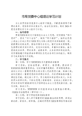 市局党委中心组理论学习计划为认真贯彻落实党委中心组学习制度,不断提高领导干部理论素养、党性修养和决策水平,结合队伍实际,制定2024年度党委理论学习中心组学习计划。一、指导思想贯彻XXX新时代中国特色社会主义思想,切实增强四个意识、坚定四个自信、做到两个维护,始终在思想上政治上行动上同以XXX同志为核心的党中央保持高度一致。紧跟理论创新成果、紧贴形势任务变化、紧盯改革发展需要,弘扬理论联系实际学风、优化知识结构、丰富知识储备,着力提高政治素养、理论素养、战略素养、业务素养和科技素养,切实增强履行职能使命和带领队伍完成各项任务的能力,确保学习成果指导工作实践。二、学习重点第一专题:学习XXXXXX系列重要讲话精神学习目标:坚持读原著、学原文、悟原理,跟进学习XXXXXX最新重要讲话,切实学懂弄通做实、学深悟透用活,深刻认识这一重要思想是全党全国人民的思想之旗、精神之魂,深刻把握这一重要思想的科学理论体系、内在逻辑脉络和重大原创性贡献。通过深入学习,努力做到知其言更知其义,知其然更知其所以然,不断在思想上有新感悟、在政治上有新升华,更加自觉地用XXX新时代中国特色社会主义思想武装头脑、指导实践、推动工作。学习资料:XXXXXX系列重要讲话及重要指示精神,《XXX谈治国理政(第四卷)》。第二专题:学习贯彻党的XXX精神学习目标:深入学习掌握党的XXX提出的新思想、新观点新论断、新任务、新举措,正确运用党的XXX精神指导推动消防工作和部队建设。跟进学习应急管理部、部消防救援局党委有关学习贯彻党的XXX精神的部署要求,中央主流媒体关于党的XXX的重要报道和社论,不断增强四个意识,确保绝对忠诚、绝对纯洁、绝对可靠,切实将党的XXX精神宣贯工作抓紧抓好、抓出实效。学习资料:中国共产党第二十次全国代表大会公报。第三专题:深入学习贯彻反腐倡廉和作风建设有关规定学习目标:通过学习充分认识党风廉政和作风建设的长期性复杂性艰巨性,牢固树立持续整改、长期整改的思想,切实把党风廉政建设和纪律作风建设紧紧抓在手上,坚持抓常、抓细、抓长,以锲而不舍、驰而不息的决心和毅力,持续努力、久久为功,形成抓党风廉政和作风建设的新常态。切实找准落实党委主体责任的着力点和关键点,建立健全党员干部不敢腐、不能腐、不想腐的监督制约机制,为促进消防工作和队伍建设创新发展提供坚实的政治保证和纪律保障。学习资料:《XXX关于党风廉政建设和反腐败斗争论述摘编》中收录的重要讲话、文章和批示要求,中央、应急管理部和部局党委关于党风廉政和作风建设的有关规定、会议精神。第四专题:深入学习领会XXXXXX关于党的百年奋斗重大成就和历史经验的重要论述。学习目标:持续深化党史学习教育成果,深刻认识从建党的开天辟地,到新中国成立的改天换地,到改革开放的翻天覆地以来党和国家事业取得历史性成就、发生历史性变革,根本原因在于我们党始终坚守为中国人民谋幸福、为中华民族谋复兴的初心和使命,按照XXXXXX的新要求新部署,不忘初心,牢记使命,永不懈怠,继续前进,不断交出新时代坚持和发展中国特色社会主义的合格答卷。学习资料:《党史》《新中国史》《改革开放史》《社会主义发展史》。第五专题:深入学习领会党内法规制度及规范文件深入学习领会XXXXXX全面依法治国新理念新思想新战略,坚持党对全面依法治国的集中统一领导,贯彻落实党中央关于全面依法治国的决策部署。深入学习领会《中国共产党章程》《中国共产党支部工作条例(试行)》《中国共产党党和国家机关基层组织工作条例》《关于加强和改进中央和国家机关党的建设的意见》等已出台或即将出台的党内法规制度、规范文件,深刻认识党中央根据新的形势、任务和要求,对制定以及修订完善党内法规的重要意义,准确把握主要内容。通过系统深入学习,牢固树立政治意识、大局意识、核心意识、看齐意识,使党内法规、规范要求转化为日常习惯和自觉遵循,切实担负起全面从严治党政治责任,自觉抓好党内法规、规范文件的学习宣传和贯彻落实,着力增强系统治理、依法治理、综合治理、源头治理的意识和能力,推动各项规定落到实处。学习资料:《中国共产党章程》《中国共产党支部工作条例(试行)》《中国共产党党和国家机关基层组织工作条例》《关于加强和改进中央和国家机关党的建设的意见》第六专题:学习全国两会精神学习目标:认真学习贯彻全国两会工作报告精神,中央和应急管理部党委、部局党委有关两会的领导讲话和文件精神,中央主流媒体关于两会的重要报道和社论,深刻理解、准确把握两会的主题、指导思想、奋斗目标和各项工作部署,把思想统一到两会精神上来,把力量凝聚到实现两会提出的各项任务和奋斗目标上来。学习资料:全国两会上的《人大工作报告》《政府工作报告》《政协工作报告》,中央、应急管理部、部局、总队有关学习贯彻
