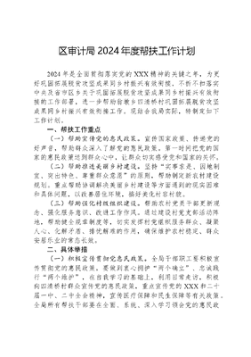 区审计局2024年度帮扶工作计划2024年是全面贯彻落实党的XXX精神的关键之年,为更好巩固拓展脱贫攻坚成果同乡村振兴有效衔接,不折不扣落实中央及省市区乡关于巩固拓展脱贫攻坚成果同乡村振兴有效衔接的工作部署,进一步帮助翁墩乡四清桥村巩固拓展脱贫攻坚成果同乡村振兴有效衔接工作。现结合我局实际,特制定如下工作计划。一、帮扶工作重点(一)帮助宣传党的惠民政策。宣传国家政策、传递党的好声音,帮助群众深入了解党的惠民政策。第一时间把党的国家的惠民政策送到群众心中,让群众切实感受党和国家的关怀。(二)帮助推进美丽乡村建设。坚持实事求是、因地制宜、突出特色、尊重群众意愿的原则,帮助制定新农村建设规划。重点帮助协调解决美丽乡村建设等方面遇到的现实困难和具体问题,以改善居住环境,搞好美化村容村貌。(三)帮助强化村级组织建设。帮助农村党员干部更新观念、强化服务意识、改进工作作风。通过建设村党支部活动阵地,帮助健全规章制度等,切实发挥村党组织服务群众、凝聚人心、化解矛盾、排忧解难的作用,确保维护农村稳定、群众安居乐业的常态长效。二、具体举措(一)积极宣传贯彻党惠民政策。全局干部职工要积极宣传贯彻党的惠民政策,要做到衷心拥护两个确立、忠诚践行两个维护,在自我学习的基础上,利用日常走访,积极向四清桥村群众宣传党的惠民政策,重点宣传党的XXX和二十届一中、二中全会精神,宣传医疗保障和民生保障等有关政策。全局所有帮扶干部要在全面、系统、深入学习领会党的惠民政策的基础上,积极向群众宣传,驻村工作队要利用日常工作和走访,利用主题党日活动和村民代表大会等,向四清桥村干部群众宣传,增强群众致富信心。(二)扎实做好日常走访工作。按照区委、区政府的要求部署,局主要负责人和分管负责人每季度到村走访调研一次,要听取村和驻村工作队工作汇报,帮助解决村当前存在的问题。全局帮扶干部要定期到村走访帮扶户,风险未消除监测户每月至少一次,脱贫户每季度至少一次,由单位统一组织或自行前往。驻村工作队要发挥驻村帮扶作用,制定完善帮扶工作台账,细化具体帮扶举措,保证帮扶措施及时有效落实,积极化解群众存在的问题。(三)大力发展村级产业和群众就业。乡村要振兴产业必先行,农民要致富就业是前提。一是帮助村发展壮大村级集体经济。积极帮助村劳务公司承揽相关业务,增加村劳务公司收入。持续关注村投资入股新皋城合作社等资XX全,确保年底收益能顺利到账。持续关注蔬菜大棚出租工作,及时协助村解决出租过程中遇到的困难。二是帮助村民就业。鼓励有就业意愿就业能力未就业的脱贫人口、边缘易返贫人口就业,积极联系区内企业,带领他们到企业现场参观,争取能在区内就业。同时,帮助在省外就业的脱贫人口申报一次性就业补助。三是鼓励农户发展特色种养殖业。向农户宣传我区特色种养殖业相关政策,鼓励他们积极发展特色种养殖业,帮助他们申报特色种养殖奖补。(四)认真做好环境卫生提升工作。切实帮助提升四清桥村环境卫生,打造干净整洁美丽的四清桥。一是助力加快美丽乡村建设。在2023年完成四清桥村小型污水处理设施的基础上进一步打造中心村建设,,提供2万元资金,用于打造村部周边环境,建设停车场等。积极帮助协调村在建设过程中遇到的困难,帮助村协调完成工程结算审计等。二是指导村时刻保持村容村貌整洁。在村开发公益性岗位和辅助性岗位的基础上,文可居文库——海量学习资料,手机电脑下载www.wenkeju.com要求他们定期清理道路两侧及公共场所卫生,引导群众保持家庭整洁干净。(五)全力做好为民服务工作。大力落实帮扶工作,持续做好为民服务工作。协助村申报雨露计划职业教育补助,人均每学期增收1500元,减轻脱贫户子女受教育成本,教育得到保障。做好重大节日走访慰问工作,组织帮扶干部到结对帮扶对象家中开展慰问和志愿服务活动,帮助他们解决具体困难,让他们感受到党和政府的关怀,增强生产生活的信心。全年计划共慰问约20户脱贫户和贫困老党员,共计6000元。(六)履行审计监督职责。围绕审计工作职责,在安排乡(镇)政府主要负责人经济责任审计时,要求延伸该乡(镇)所有村(街),重点关注衔接资金管理情况、巩固拓展脱贫攻坚成果同乡村振兴衔接相关政策措施落实情况及衔接资金绩效情况,揭露发生在群众身边的腐败和作风问题,推动政策措施落实更加精准,有效维护衔接资XX全,促进提高资金使用绩效,充分发挥审计在乡村振兴中的作用。三、工作要求(一)提高认识,加强领导。主要负责人亲抓亲管,把帮扶工作当做一项政治任务来完成。积极开展调查走访,强化政策落实,确保结对帮扶工作落地见效。(二)强化责任,增进感情。认真贯彻落实帮扶工作要求部署,立足区委、区政府中心工作,全心全意地为群众服务。(三)明确任务,狠抓落实。要深入调研,认真落实帮扶措施,扎实开展工作,健全结对帮扶长效机制,防止