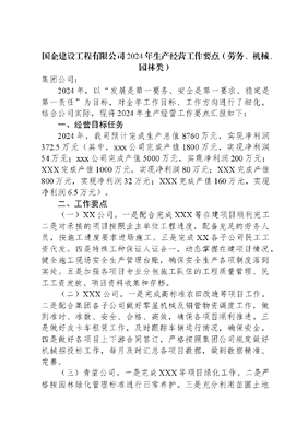 国企建设工程有限公司2024年生产经营工作要点(劳务、机械、园林类)集团公司:2024年,以发展是第一要务、安全是第一要求、稳定是第一责任为目标,对全年工作目标、工作方向进行了细化。结合公司实际,现将2024年生产经营工作要点汇报如下:一、经营目标任务2024年,我司预计完成生产总值8760万元,实现净利润372.5万元(其中,xxx公司完成产值1800万元,实现净利润54万元;xxx公司完成产值5000万元,实现净利润200万元;XXX完成产值1000万元,实现净利润80万元;XXX完成产值800万元,实现净利润32万元;XXX完成产值160万元,实现净利润6.5万元)。二、工作要点(一)XX公司。一是配合完成XXX等在建项目顺利完工二是对承接的项目按照业主单位工程进度,配备充足的劳务人员,按施工进度要求进场施工。三是完成XX各子公司民工工资代发。四是特殊工种保证人证合一,动态掌握在建项目情况,健全施工现场安全生产管理台账,确保安全生产各项制度落到实处。五是加强各项目专业分包施工队伍的工程质量管理、民工工资发放、项目资料收集和存档。(二)XXX公司。一是完成高标准农田改造等项目工作。二是配合集团各子公司做好零星机械及钢管物资调度工作,做到准时、准数、安全、合格、高效,确保各项目顺利推进。三是做好皮卡车租赁工作,及时跟踪车辆运行情况,确保安全。四是做好各项目上下游合同签订,严格按照集团公司规定做好机械招投标工作,每月及时汇总各项目数据,做到数据精准、完善。(三)青苗公司。一是完成XXX等项目绿化工作。二是严格按园林绿化管理标准进行日常养护。三是充分利用苗圃土地资源进行经济作物种植和苗木扦插培育。四是积极外部拓展业务。(四)铁拓公司。一是按照集团公司要求,加强管理,严格执行公司各项规章制度。二是完成XXX等项目施工。三是建立一支稳定性好、专业性强、反应迅速的防水材料施工队伍。(五)顺为公司。一是按照集团公司要求,加强管理,严格执行公司各项规章制度。二是做好各项目钢管扣件等物资供应工作。三是完成好塔吊报审报检及租赁工作。四是抓好原有开展业务,积极拓展对外业务。五是全面做好机械物质出入场吊装安全工作。(六)党建工作。XXX支部在集团党委的正确领导下,坚持高标准、严要求,积极开展全体员工精神文明建设活动,狠抓干部员工思想政治工作,提高政治素质。进一步细化职责权限,确保一岗双责落到实处。(七)内部管理。一是强化内部管理。综合部将进一步做好沟通协调工作,履行后勤保障职能,提高工作效率及工作质量,保障各项目高效运转;采购监督部将严格监督机械及劳务招投标流程,严格核对民工工资发放及款项支付,通过市场询价、成本控制,在材料的质量、价格等方面做好监督、管控。二是素质提升。鼓励员工自主参加各类专业技术考试,为公司持续健康发展提供良好的人才和技术支持。三是合理分配岗位。根据岗位职责,合理分配人员,提高工作效率。(八)安全生产工作。始终把安全生产工作放在第一位,坚持安全第一,预防为主的方针,认真贯彻执行国家安全生产法令、法规,落实上级部门安全生产文件精神。一是严格督查督导。不定期组织对各项目进行安全检检,切实加强对重点工程、要害部位、关键环节的安全排查,发现问题,立即整改,并做好资料留存。二是筑牢思想防线。将安全生产工作提上议程,传达学习集团公司各类安全生产文件及会议精神,强化安全意识。文可居文库——海量学习资料,手机电脑均可下载www.wenkeju.com