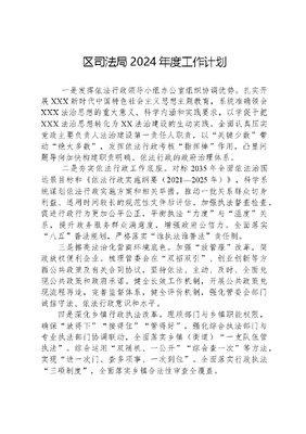 区司法局2024年度工作计划 一是发挥依法行政领导小组办公室组织协调优势。扎实开展XXX新时代中国特色社会主义思想主题教育,系统准确领会XXX法治思想的重大意义、科学内涵和实践要求,以学促干把XXX法治思想转化为XX法治建设的生动实践。全面认真压实党政主要负责人法治建设第一责任人职责,以关键少数带动绝大多数,发挥依法行政考核指挥棒作用,凸显问题导向加快构建职责明确、依法行政的政府治理体系。 二是夯实依法行政工作底座。对标2035年全面依法治国远景目标和《依法行政实施纲要(2021—2025年)》,科学系统谋划依法行政实施方案和相关举措。推动一批关系群众切身利益、适用时间较长的规范性文件后评估。加强执法督查检查,促进行政行为更加公平公正,平衡执法力度与温度关系,提升政务服务群众满意度,增强政府公信力。全面落实八五普法规划,严格落实谁执法谁普法责任制。三是擦亮法治化营商环境底色。加强放管服改革,简政放权便利企业。梳理管委会在双招双引、创业创新等方面公共政策及有关合同协议,坚持依法、主动、及时、全面兑现公共政策和政府承诺。健全长效工作机制,开展公共政策兑现流程再造,完善监督体系,健全评价机制,强化管委会部门诚信守法、依法行政意识和水平。四是深化乡镇行政执法改革。理顺部门与乡镇职能权限,确保放得下接得住管得好,强化综合执法部门与专业执法部门协调联动,全面落实乡镇(街道)一支队伍管执法。综合运用双随机、一公开综合查一次等方法,实现进一次门、查多项事、一次到位。全面落实行政执法三项制度,全面落实乡镇合法性审查全覆盖。