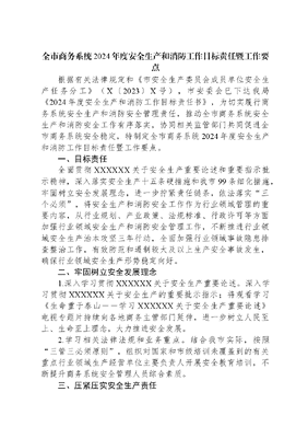 全市商务系统2024年度安全生产和消防工作目标责任暨工作要点根据有关法律规定和《市安全生产委员会成员单位安全生产任务分工》(X〔2023〕X号),市安委会已下达我局《2024年度安全生产和消防工作目标责任书》,为切实履行商务系统安全生产和消防安全管理责任,推动全市商务系统安全生产和消防安全工作有序落实,协同相关监管部门共同促进全市商务系统安全稳定,特制定全市商务系统2024年度安全生产和消防工作目标责任暨工作要点。一、目标责任全面贯彻XXXXXX关于安全生产重要论述和重要指示批示精神,深入落实安全生产十五条硬措施和我市99条细化措施,牢固树立安全发展理念,进一步拧紧责任链条,依法落实三个必须,将安全生产和消防安全工作作为行业领域管理的重要内容,从行业规划、产业政策、法规标准、行政许可等方面加强行业领域安全生产和消防安全管理工作,不断推进行业领域安全生产治本攻坚三年行动,全面加强行业领域事故隐患排查整治工作,有效防范和遏制较大及以上生产安全事故发生,确保行业领域安全生产形势稳定向好。二、牢固树立安全发展理念1.深入学习贯彻XXXXXX关于安全生产重要论述。深入学习贯彻XXXXXX关于安全生产的重要批示指示;将观看学习《生命重于泰山--学习XXXXXX关于安全生产重要论述》电视专题片持续向各地商务主管部门延伸,进一步树立人民至上、生命至上理念,大力推进安全发展。2.学习相关法律法规和业务重点。结合我市实际,按照三管三必须原则,组织对国家和市级培训未覆盖到的有关重点行业领域生产经营单位主要负责人开展安全教育培训,不断提升商务系统安全管理人员综合素质。三、压紧压实安全生产责任3.落实行业安全生产管理责任。始终把商务系统安全生产和消防安全管理工作作为行业领域管理的重要内容,纳入到产业促进政策、行业发展规划、法规标准和行政许可工作中去;进一步完善全市商务系统安全生产工作机制,定期召开安全生产管理专题会议,统筹规划和部署安全生产管理工作重大问题和推进事项,按照职责分工,将具体任务分解下达并逐项抓好落实。4.推动开发区落实安全生产监管责任。持续督促省级以上开发区完善安全监管体制,明确安全监管机构和人员,继续把生产安全事故防范作为重要指标,纳入年度开发区综合发展水平考核评价工作。5.指导督促企业落实安全生产主体责任。指导督促直属企事业单位切实担负起安全生产主体责任,紧盯事故易发的重点场所和薄弱环节,深入排查治理,着力从根本上消除风险隐患,严防各类事故发生;积极配合行业领域安全生产监管相关部门,指导督促相关经营主体落实安全生产主体责任,推动企业主要负责人落实第一责任人的责任;推动对外投资合作企业境内主体落实安全生产责任,加强境外投资合作项目安全生产工作。6.制定完善各类应急预案和专项规划。进一步制定或修订完善行业领域各类应急处置预案和专项规划,落实首报、续报、终报等要求,明确具体责任人和责任事项,力争把隐患风险消除在萌芽状态,确保突发事件总体可控。四、扎实推进各类安全生产专项整治7.深入开展安全生产大检查。积极配合有关部门深入开展全市商务领域安全生产大检查,发现违法行为及时抄告有关监管部门督促企业整改、落实防范措施,坚决防范遏制重特大事故。五、加强重点行业领域风险防范8.推进燃气安全排查整治。持续开展全市餐饮经营场所燃气安全排查整治工作,按照各地工作分工,加强宣传推动,配文可居文库——海量学习资料,手机电脑均可下载www.wenkeju.com合燃气主管部门推进城镇燃气安全排查整治工作,将餐饮经营单位规范使用燃气、可燃气体报警装置安装并正常使用等方面作为主要内容,对使用管道燃气或瓶装液化气的餐饮经营场所、非星级酒店进行专项排查,强化督导燃气安全措施落实,强化整改治理一批安全隐患问题,坚决防范遏制行业领域发生燃气安全事故。9.加强成品油流通安全风险防控。结合年度专项检查和双随机一公开,指导督促成品油零售企业进一步健全完善安全生产管理制度,加强安全生产培训,应急演练,日常安全巡查,落实安全防范措施,有效提升自身安全管理水平。10.加强报废机动车回收拆解管理。联合公安、交通、市场监管等部门开展报废机动车回收拆解专项整治,规范报废机动车回收企业经营,严厉打击非法回收、拆解、倒卖报废机动车及报废机动车五大总成等违法违规行为,进一步规范报废机动车回收拆解市场秩序。11.配合做好商贸企业消防安全风险防控。配合消防救援、应急管理等部门开展商贸企业安全大检查,指导督促大型商业综合体(商场、超市)、老旧商住混合体等商贸企业贯彻执行消防安全生产法律法规,加强消防安全管理,落实防范措施,加强风险防控和隐患排查整治;配合消防救援部门持续深入推进大型商业综合体标准化管理,重点指导督促大型商业综合体内商贸企业建立完善有关消防安全管理制度。六、夯实安