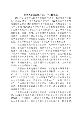 市机关事务管理局2024年工作要点2024年,是中华人民共和国成立75周年,也是实施十四五规划、建设七个XX的关键之年,XX市机关事务管理局将始终坚持以XXX新时代中国特色社会主义思想为指导,深入学习贯彻XXXXXX关于机关事务工作重要指示精神,全面落实党的XXX和二十届二中全会精神及中央、省、市相关会议安排部署,完整、准确、全面贯彻新发展理念,紧紧围绕深化改革、促进发展的工作主线,从改革要动力,着力推进机关事务治理体系和治理能力现代化,为落实三高四新美好蓝图、建设好社会主义现代化七个XX贡献智慧和力量。一是坚决把牢改革任务这条主线。充分认识深化改革的必要性、紧迫性和极端重要性,按照市委办、市政府办《关于贯彻落实党政机关习惯过紧日子要求若干措施的通知》中落实四个暂停、实行公务用车集中统一管理、强化节能考核、推行通用资产集中采购、推行后勤改革的要求,进一步细化相关改革落实方案,有效解决机关事务运营管理中办公用房、用车、通用资产采购、后勤体制等不够规范的问题,力争大幅压减机关机关后勤运行经费。二是坚决扛牢党建统领这面旗帜。自觉把党的领导贯穿工作的全过程各方面,坚持主题教育收尾不收场,持续在学、研、改上下功夫,推动主题教育常态长效。持续开展学习XXX·当好红管家活动,坚持不懈用XXX新时代中国特色社会主义思想凝心铸魂,坚定拥护两个确立,做到两个维护。严格落实意识形态工作责任制,加强对重大事件、重要情况、重要社情民意前瞻性专题分析判断,提前做好防范,牢牢掌握意识形态主动权。三是坚决树牢绿色低碳这根标杆。持续深化节约型机关创建,2024年全市县级以上党政机关节约型机关创建比率达到85%以上,人均能耗、水耗均下降1.5%,并将各单位节能情况纳入年度绩效考核。常态化开展公共机构垃圾分类、限塑降塑、反食品浪费、绿色食堂等监督检查工作,有效规范行为,科学推进落实。大力推广新能源汽车,公务用车更换优先使用新能源汽车,确保在2025年新增公务用车中新能源汽车的比例达到60%。按照省局文件要求,加力推进新能源充电桩建设,逐步达到各单位停车位10%。四是坚决担牢三资改革这份责任。探索创新公物仓管理,加快公物仓物品流转速度,提高资产使用和利用效益。主动克服存量资产不足的影响,进一步统筹规划办公区布局,统筹调剂存量办公用房,实现集中集约,腾挪整合资产;将水面等过去未列入权属登记的资产进行权属登记;加强对经营性资产的精细化管理,持续开展公开拍租,推动经营性资产保值增值等创新举措有效推进资产盘活。五是坚决筑牢拒腐防变这道屏障。传达贯彻中央、省、市纪委全会精神,全力推进清廉建设,打造清廉机关,让以清为美、以廉为荣成为全局风尚。深入查摆廉政风险点,管好关键的事、关键的人。扎实做好以案促改、以案促治工作,强化警示教育,持续净化政治生态。切实抓好日常监督和专项监督,管好八小时之内、八小时之外,持续转变干部作风。六是坚决抓牢队伍建设这个关键。把干部队伍建设作为管根本、管长远的大事来抓,努力建设一支政治上坚强有力、经得起风浪考验、堪当时代重任的高素质干部队伍。针对干部队伍素质不高、活力不足、能力不强等问题,大力实施轮岗交流、教育培训、考核惩戒等办法,激发干部队伍活力。改进绩效考核制度,注重干部平时表现和工作实绩,形成凭能力吃饭、靠业绩说话的鲜明导向,激发机关干部创业干事的热情。文可居文库——海量学习资料,手机电脑均可下载www.wenkeju.com