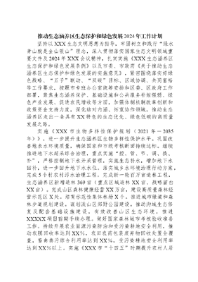 推动生态涵养区生态保护和绿色发展2024年工作计划坚持以XXX生态文明思想为指导,牢固树立和践行绿水青山就是金山银山理念,深入贯彻落实国家生态文明领域重要文件及2024年XXX会议精神,扎实实施《XXX生态涵养区生态保护和绿色发展条例》以及市委、市政府《关于推动生态涵养区生态保护和绿色发展的实施意见》,紧密围绕落实好绿色战略、五子联动、双碳目标、区域协调、共同富裕等工作要求,按照市专班办公室统筹安排和区委、区政府工作部署,聚焦生态涵养保护、基础设施和公共服务补短强弱、绿色产业发展、促进农民增收等方面,加强体制机制改革创新和政策资金支持力度,深化结对内涵、拓宽协作领域,推动生态涵养区走出一条具有XX特色的生态优先、绿色低碳的高质量发展之路。实施《XXX市生物多样性保护规划(2021年-2035年)》,进一步提升生态涵养区生物多样性保护水平。巩固改善地表水环境质量,确保国家和市级考核断面持续达标。继续推进地下水超采综合治理,重点实施控、管、节、调、换、补,严格控制地下水开采管理,实施生态补水,增加地下水回补,进一步回升地下水水位。落实城乡水环境治理行动方案,完成5个村农村污水治理工程。完成新一轮百万亩造林工程,生态涵养区新增造林369亩(重点区域造林XX亩、战略留白XX亩)。完成山区森林健康经营XX万亩,建设高质量森林经营示范区X处。培育示范性集体林场X个。推进城市绿道和森林步道规划建设。谋划浅山区郊野公园建设。推动沟域生态修复及配套基础设施建设,有效改善山区生态环境。推进XXXXX项目前期手续办理。做好国家森林城市考核验收准备工作。持续开展农业面源污染防治和受污染耕地安全利用,推动农膜回收率达到XX%,农田农药包装废弃物回收处置全覆盖,畜禽粪污综合利用率达到XX%,受污染耕地安全利用率达到XX%以上。实施《XXX市十四五时期提升农村人居环境建设美丽乡村行动方案》,开展传统村落保护,启动实施XX个美丽乡村建设。打造XXXX等一批旅游线路,培育提升X个美丽休闲乡村。重点宣传推介优质农产品,打响XXX优农品牌。实施生态涵养区综合性生态保护补偿政策,配合市有关部门开展市对区综合性生态保护补偿资金的预算绩效评价。推进生态涵养区水生态空间划定工作,加强水生态空间的修复和管理,制定河湖水系连通修复方案,改善河流上下游连通状况,逐步恢复河湖生态流量,维护河湖生态功能。建设水库上游生态清洁小流域,完成小流域综合治理工程。加强水库周边地区污水、垃圾的收集处理,因地制宜建设水库入口湿地,削减入库污染源,完善禁渔期、禁渔区制度,依法查处非法捕捞、破坏水库周边环境和设施的行为。开展排污口排查整治和小微水体治理,清理整治河湖管理保护范围内乱占、乱采、乱堆、乱建等危害水环境的行为。加强农村生活垃圾处理。在继续保持生态涵养区垃圾不落地、巡回收集的基础上,强化宣传引导,培养家庭垃圾源头分类习惯,推动厨余分出率保持在XX%以上,居民自主分类率达到并保持在XX%以上。强化镇域空间用途管控,编制完成生态涵养区各镇国土空间规划。深化基本无违法建设区创建,坚定依法有序推进浅山区违法占地违法建设、违建别墅等专项整治,完成生态涵养区X镇基本无违建镇街创建工作。推进XX个图斑的生态修复治理工作。完成X个图斑XX公顷自然恢复的专家认定工作,推动图斑销账。健全生态涵养区突发事件应急管理体系,制定年度防汛、森立防火工作要点,完善1+7+22防汛指挥体系,全面启用互联网+防火督查系统和防火码,科学高效处置洪涝、崩塌、滑坡、泥石流、森林火灾等突发事件。配合市有关部门,推动环线工程实现开工建设。推进路改建工程,力争完成主体工程。推动水库等项目前期手续办理。对生态涵养区管养公路开展每日巡查,发现遗撒、垃圾等及时清理,针对路面坑槽、裂缝等病害及时修复,确保生态涵养区文可居文库——海量学习资料,手机电脑均可下载www.wenkeju.com公路干净整洁及行车安全。推动XXX镇综合文化中心完成主体工程建设、XXX镇中心小学完成竣工验收、XXX镇中心幼儿园实现开工建设。推进XXX社区卫生服务中心迁建工程前期手续办理。协调指导平原区与生态涵养区乡镇学校、卫生院手拉手进行帮带。落实《XXX市农村住房质量提升试点建设工作方案》,研究制定XXX区农村住房质量提升试点建设工作方案和试点村建设实施方案,推进两个农房改善类试点村建设。继续壮大乡医队伍,提升农村医疗水平。完成乡村医生岗位人员订单定向免费培养招生XX人。针对生态涵养区产业发展特点,实施高素质农民培育工程,大力开展订单、定向、定岗等有针对性的农业技术培训,全年培训农民XX人次以上。出台《XXX区促进农村劳动力就业参保若干措施》,持续加强生态涵养区劳动力就业保障,完成劳动力就业参保XX人。稳步推进各项文