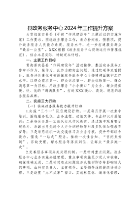县政务服务中心2024年工作提升方案为贯彻落实县委《干部作风建设年主题活动的实施方案》工作要求,围绕政务服务工作,着力补短板、强弱项,提升政务服务人员能力素质、服务水平,进一步打通服务群众最后一公里,XXX根据《政务服务中心现场运行和管理规范》,结合本县实际,特制定本计划。一、主要工作目标贯彻落实县委作风建设年活动精神,整治政务服务工作中不作为、慢作为、乱作为的突出问题,通过软硬件双重提升、服务评价量化考核提振政务服务中心干部精神面貌和工作水平,以群众需求第一、群众诉求第一、群众体验第一、群众满意第一为目标,用政务服务小小窗口为企业、群众提供暖、快、优的满满服务,打造XXX暖心、高效、规范的政务服务品牌。二、实施三大行动(一)实施政务服务能力提升行动1.实施三个一队伍建设行动。一是每月开展一次集中培训,围绕服务礼仪、业务流程、政策文件、专业知识开展培训;二是每月开展一次政风行风作风教育,通过集中观看警示纪录片、表彰当月先进个人并介绍经验等对服务队伍加强教育督导;三是每月组织一次交流学习及业务考核,提升干部综合能力,强化一站式服务,推动一次性告知、首问负责制、容缺受理、帮办服务等落实到位,让群众最多跑一次。2.完善服务事项分类处理机制。一是针对重点问题,政务服务中心业务实施分组管理,重点事项实施至少双人审核制,确保准确无误。二是针对难点问题或涉及接诉即办等影响较大的事项,由科室负责人、主管领导、主要领导逐级提级协调办理。三是设置办不成事窗口,实施标签化、清单化管理,在15日内督办落实到位。以上事项在有必要时充分利用吹哨报到工作机制,协调相关部门共同办理。3.走实便民服务流程。定期由主管领导或其他班子成员到政务服务中心,以普通群众的身份申请办理有关事项,换位体验群众感受,把流程走深、走实,发现真问题,听到真声音,找到事项办理服务中的堵点、漏点,精准提升服务能力。(二)实施政府服务规范提升行动1.制定政务事项便民手册。梳理96项政务服务事项清单一次性告知内容,形成工作手册,明确政策依据、办理流程、工作周期、咨询电话等,为办事群众全面了解政务事项提供指南。2.建立政务服务月报机制。每月梳理政务服务事项办理数据情况、工作亮点举措、检查整改情况、问题建议及先进个人事迹,形成月报报班子成员及区相关部门,寻找典型案例在全景XXX公众号予以宣传。(三)实施政务服务环境提升行动1.提升外部环境。配套中英文标识、无障碍车位,优化卫生间设施环境;每周开展政务服务中心卫生日活动,为办事群众提供干净、舒心办事环境。2.完善内部设施。升级叫号器、自助查询设备、服务评价器配套网络和办公电脑,强化便民服务保障;增设监控设备及录音电话等硬件设施,确保政务服务流程可追溯,服务事项规范有序;结合疫情防控要求,完善一米线、消杀防护设施用品等。三、完善保障机制1.制定评分细则,强化考核。围绕政风行风作风、业务技能与工作实绩、出勤值勤情况等方面制定考核细则,每月进行一次汇总评分,评分结果公示后报主管领导、主要领导审阅,并作为月度考核的主要评价依据(见附件)。2.构建多层次评价体系,强化监督。一是以群众满意度为文可居文库——海量学习资料,手机电脑均可下载www.wenkeju.com核心,结合服务评价器满意度情况、群众投诉或表扬情况、办件数量及质量情况进行评价。二是设置政务服务监督小组,由便民服务中心三名以上同志进行日常监督。三是聘请对政务服务工作有过不满意或提出过意见建议(如拨打过12345提出相关诉求)的群众作为日常监督员,根据提出的问题进行扣分。四是由作风建设年主题活动领导小组、纪委、主管领导对工作情况进行抽查予以评价。3.制定奖惩措施,强化激励。根据考核评价结果,每月在政务服务中心工作人员中评出一名窗口之星,发放流动红旗,给予一定的奖金或奖品奖励,并通过政风行风作风教育会、微信公众号、作风建设年主题活动等途径表彰先进事迹。综合每月考核情况,年度考核情况作为评优评先、职务晋升重要依据。对于考核不合格或长期排名靠后人员,根据实际情况采取批评教育、书面检查、约谈、调岗或辞退等措施。文可居文库——海量学习资料,手机电脑均可下载www.wenkeju.com