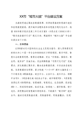 XX市城市大脑平台建设方案为高效贯通汇聚政务数据资源,科学统筹推进智慧城市建设和应用提速提效,提升城市治理体系和治理能力现代化水平,根据《XX市数字经济发展三年行动方案》(X委办发〔XXXX〕X号)数字政务提升行动既定方向,现就XX市城市大脑平台建设提出如下方案:一、总体思路以XXX新时代中国特色社会主义思想为指导,深入贯彻落实党的XX大和二十届一中全会和XXXXXX关于网络强国、数字中国、智慧社会的重要思想、重要论述精神,突出补短板、强弱项、重应用、促共享实施导向,突出保障数据可用可见可控实施要求,深化数据汇聚共享,整合政务数据资源,补齐政务系统短板,完善数据安全保障,着力构建1+2+N城市大脑体系(1个中枢系统《数据底座、时空中台、业务中台、展示中台、视频中台等》,2项基础设施《政务云平台、城市物联网》,N类智慧场景应用《智慧网格、智慧城管、智慧民生、应急指挥、经济监测》),形成结构清晰、体系完备、标准统一、操作性强、便于迭代、深度整合的智慧城市架构体系,不断提升数字XX建设水平,推动实现用数据决策、用数据管理、用数据服务,实现一屏观全域、一网管全城。二、实施原则(一)统筹规划,分步推进。结合我市城市管理实际需求,学习借鉴其他城市先进经验,明确总体目标和阶段性任务,规划建设符合XX城市功能定位、满足群众生产生活需要的城市大脑,坚持先易后难,分步实施推进,探索形成可复制、可推广的城市大脑建设模式。(二)资源整合,协同创新。立足我市现有政务数据基础底座、自然资源一体化平台、智慧网格平台、智慧城管平台等信息系统资源,避免重复投资和资源浪费,推进信息系统平台统筹整合,加快数据资源汇聚共享,深化业务应用融合创新,坚持全市一盘棋管理,构建职责清晰、统筹有力、协同联动的城市大脑建设机制,弥合城乡数字鸿沟,实现数字化协同发展。(三)以人为本,聚焦应用。按照先解决共性、基础性诉求,后解决个性、特殊性诉求的原则,坚持以应用场景为核心以需求为导向,以实效为目标,有序推进城市大脑项目建设重点探索在城市交通、教育、医疗、政务、平安、社区治理等领域的应用场景,以数字化的方式更好地解决城市治理难点和痛点,不断增强人民群众的幸福感、获得感。(四)科学规范,安全可控。严格落实国家信息安全等级保护制度和密码法相关要求,健全网络和信息安全政策、法规、标准体系,提升城市大脑建设安全可控水平,强化网络和信息安全管理,确保管理规范、安全可控。强化关键信息系统和信息基础设施安全保障,加强个人信息保护,确保城市信息基础设施和数据资源自主、安全、可控。三、建设内容(一)搭建城市大脑中枢系统。建立健全系统建设和接入标准规范,按照内外联动、点面结合、上下协同思路,围绕服务指挥决策、行业管理和便民利企,构建城市大脑中枢系统以现有数据底座平台为基础,逐步完善数据通道功能,推动各部门将分散、独立的信息系统整合集成为互联互通、业务协同、信息共享的大系统,实现跨部门、跨层级工作机制协调顺畅。按照协同治理、联动治理思路,推动各部门以城市大脑为基础,整合吸收、升级改造现有成果,丰富智慧化应用场景,为服务企业、市民、指挥决策提供支撑。包括五个部分:1、数据中台。依托上级政务数据汇聚共享平台和本级数据底座,构建数据标准规范,整合接入上级共享数据(提供数据接口《如公安户籍、市场主体、社会保障等》、回流源数据《如标准地址库等》)、本级部门数据(部门数据汇聚本级数据底座),不断完善人口库、法人库、宏观经济库、自然资源和空间地理库规范数据资源归集、治理和共享交换,构建形成全市一体化数据资源体系。2、时空中台。包括地理空间服务、标准地址服务、地址二维码服务3项功能。通过整合地理信息、道路实景、虚拟现实场景等城市地理信息,对接上级公安回流的城市统一标准地址库,面向本级各部门应用平台提供统一的地图图层、标准地址等服务接口提高城市地理图层、地址的唯一性和及时更新率。3、业务中台。通过制定统一的数据接口规范、技术规范和流程规范,统一构建面向业务应用的大数据基础组件、基础服务工具和模型算法,支撑标准高效的应用开发模式,夯实基础支撑能力、通用业务能力,其中,基础支撑能力包括统一认证、消息中心、统一底图、人工智能(如OCR等服务)、短信服务;通用业务能力包括协同处置、协同调度、协同服务、数据追溯等。4、展示中台。即城市管理一张图。整合汇聚数据中台、时空中台不同类型、不同维度的实时数据,通过统计报表和可视化平台形式,对城市管理核心指标进行实时监测与可视分析,实现城市各类数据融合贯通与直观可视,辅助管理者从各个层面洞察城市运行态势,提升监管力度和处置效率。城市管理一张图通过公安应急指挥中心、智慧XX运营管理中心的大屏分类展示,同时,设置手机移动端