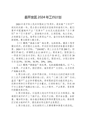县开发区2024年工作计划2024年是中华人民共和国成立75周年,是实施十四五规划的关键一年,是全县全面建设田园城市的奋进之年。我们要牢牢把握城市产业双集中方向及大抓经济的五个原则和五个要领,坚持稳中求进、以进促稳、先立后破,主攻新型工业化,培育壮大新质生产力,奋力打造先进制造业新高地。重点做好七篇文章。(一)围绕强县工程做文章,大抓经济。强县工程首强在经济,经济强在主战场。开发区将坚持经济体量与质量并重。2024年奋斗目标:206182:规上工业总产值200亿,招商引资60亿,新增规上企业10家以上,税收8亿,固投20亿。一季度开门红奋斗目标:规上工业总产值45亿,招商引资20亿,新增规上企业4家,税收2.32亿,固投4亿,分别占目标任务22.5%、33.3%、36.3%、29%、20%。(二)围绕强融合做文章,大抓城镇功能化。以人口集聚、产业集中,园区提标、城市提升为目标,全力促进产城融合发展。1.聚力核心区。把和平路以南、外环线以北的区域作为园区工业产业高质量发展的核心区,深化三清三提三新行动,盘活僵尸企业和存量地块,将有限的空间功能发挥出来;把新材料和汽车零部件产业为重点,打造标准化厂房,形成10平方公里的产城融合核心区,为人口集中、产业集聚、要素集约挖掘发展空间。2.聚力拓展区。以屈原大道与外环线交汇区为拓展区,瞄准绿色城市矿产上下游产业,延长产业链,提升含金量、含新量,增加附加值。结合盘活群威装饰等闲置低效土地,将拓展区打造为城市矿产、绿色建材等优势产业集聚区。3.聚力商业区。依托曲阳河人文景观带和黄香大道沿线,推动商业商务、文化、娱乐休闲向左岸商业区集中,打造左岸不夜城商业综合体和步行街,形成特色消费中心。加快推进五星级长海山水酒店项目建成投用,提升城市品位和吸纳力、承载力,促进产、城、景、商、住、游一体化。4.聚力生活区。以打造三个一为抓手,建设高品质15分钟便民生活圈。一是打造一条清丽河。深化新云河黑臭水体治理,实施岸线复绿、生态护坡及景观提升工程,联片推动和平生态公园和府河支流景观带建设,形成人水相亲的靓丽风景线。二是打造一条升级线。围绕制造焕新,着力提升和平路沿线凯立扬汽车、森宇齿轮、腾胜光电等11个企业迭代升级;三是打造一条景观带。将曲阳河人文景观带、祥云湾景区结合起来,形成一线串珠,打造片区化、小型化核心景观带,推动城市发展由外向拓展向内涵提升转变。(三)围绕强产业做文章,大抓工业。坚持政府主导与市场驱动并举。以园聚产,以产兴园,奋力打造新质生产力产业集群。一是突出主产能在量上突破。2024年全力实现产值200亿,规模以上工业企业个数由现在的37家增加到48家。二是突出主功能在质上突破。发挥园区平台引擎带动作用,持续实施园区路、电、气、网等基础设施提档升级工程;招商盘活群威装饰、佳洁食品等4家闲置低效资产。三是突出主产业在效上突破。推动中一铜箔二期竣工投产、开特电子提质增效,确保新材料产业产值突破100亿。推动中再产业园、玖隆科技增资拓产,延长产业链条,实现城市矿产100亿产值。推动美林药业高端发展,雅琪生物向细分领域进军冠军,推动生物大健康产业产值突破20亿。(四)围绕强底盘做文章,大抓项目。坚持抓项目与争资金并进。发扬学拼抢敢快干精神,做大项目底盘支撑。 一是坚持项目招引推动。抓牢招商引资一号工程,突出聚链集群、平台拓展、新质产业招商,形成一批县域新质生产力项目。加快科创园建成投产,重点推动玖隆科技、雅琪生物、高金食品、腾胜光电等企业增资扩能;借力北京(陈杰灵)、苏州(骆鹊桥),芜湖(汪步云博士团队),建立XX离岸科创中心,全年奋力实现招商引资60亿,力争新引进工业项目19个,5亿元以上项目4个,过亿元项目15个,招商纳统率100%。二是坚持项目投资带动。以三库为载体做实项目前期。围绕中省政策、产业发展、现有资源、功能阵地、民生十位需求、市场主体和争优创先等多元路径争取项目投资。全年计划投资入库项目23个,投资额30亿元以上。三是坚持项目建设牵动。对标市委211工作要求,压实各方责任,倒排工期,挂图作战,凝聚项目建设第一力度。全年开工项目14个,建成工业项目10个。秀东路、步云路、凌云路等4个政府投资项目建成投用。(五)围绕强动能做文章,大抓改革创新。一是紧盯改革创新激活力。坚定市场化模式,深化园区+公司路径,从科创园着手,做优做强玖隆新材料园、开特电子园、汇宇科技园、高金食品园、雅琪生物园、腾胜光电光学镜片园等七大专业园,着力打造项目落户、产业集聚的强磁场。二是紧盯主体培育激活力。紧盯首季黄金期,坚持统筹发展与安全,按照先立后破原则,把市场主体培大育强。①从基础产业