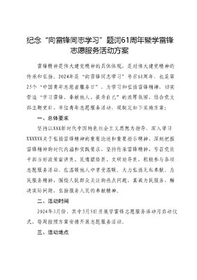 纪念向雷锋同志学习题词61周年暨学雷锋志愿服务活动方案雷锋精神是伟大建党精神的具体体现,是对伟大建党精神的传承和弘扬。2024年是向雷锋同志学习号召61周年,也是第25个中国青年志愿者服务日,为学习和弘扬雷锋精神,切实营造学习雷锋、奉献他人、提升自己的浓厚氛围,结合党支部主题党日、单位青年志愿服务活动,现制定如下实施方案:一、总体要求坚持以XXX新时代中国特色社会主义思想为指导,深入学习XXXXXX关于弘扬雷锋精神的重要论述和重要指示精神,深刻把握雷锋精神的时代内涵和实践要求,坚持传承雷锋精神,号召党员干部当好政策宣讲员、民情联络员、文明劝导员,积极参与各项志愿服务活动,在温暖他人中享受温暖。大力弘扬无私奉献、为民服务精神,围绕人民群众关注的热点问题,真诚为民服务,解决实际问题,弘扬服务人民的奉献精神。二、活动时间2024年3月份,其中3月5日开展学雷锋志愿服务活动月启动仪式,每周按照方案安排开展志愿服务活动。三、活动地点学雷锋志愿服务活动月启动仪式在局会议室,各项志愿服务活动在相应社区、企业、单位开展。三、活动安排(一)学雷锋志愿服务活动月启动仪式。3月5日学雷锋日,举办主题为续写新时代雷锋故事学雷锋志愿服务月活动启动仪式。启动仪式由党委书记主持,宣读学雷锋志愿服务月活动主要内容等事项。大力弘扬奉献、友爱、互助、进步的志愿精神,动员党员干部积极参与志愿服务活动。启动仪式先后组织党员到联系社区支部参与政策宣传、垃圾分类、交通引导等志愿服务活动。(二)开展学习雷锋精神宣传教育。结合党支部三会一课,组织党员干部观看纪录片《我们的雷锋》,共同追寻那段岁月中雷锋闪光而又平凡的生活历程,学习雷锋扶危济困、乐于助人的光荣事迹,领悟雷锋全心全意为人民服务,敢于为国家、为集体牺牲,不计较个人得失的精神,引导党员干部继续传承雷锋精神,通过实际行动,带动更多人参加志愿服务,让雷锋精神在新时代绽放更加璀璨的光芒。(三)结合单位职责,开展形式多样的志愿服务活动。一是垃圾清理志愿活动。对辖区内的卫生死角、街边杂草、绿化带白色垃圾、暴露垃圾和小区内的配电箱、电杆等处张贴的各种小广告以及沿街门店乱堆乱放、车辆乱停乱放等行为进行全面清理规范。二是文明交通志愿活动。在辖区交通情况复杂路口,协助交警维护道路交通秩序,对行人闯红灯、不走斑马线、非机动车越线行驶等不文明交通行为进行提醒和劝导纠正,为老弱病残等特殊群体过马路提供帮助,引导非机动车辆和行人自觉遵守交通规则,文明出行,提升群众出行安全意识,营造文明和谐的交通氛围。三是法律知识宣传志愿活动。向居民群众发放《民法典》《法律援助法》《反电信网络诈骗法》《未成年人保护法》等宣传资料,引导群众结合自己的实际工作和家庭生活,提出自己需要了解和咨询的法律问题。重点宣传与群众生活相关的劳动合同、债务纠纷等法律知识,讲解了民法典中的《合同法》常用的法律条文,倡导遇到任何问题都要依法行事,通过理性、合法的途径来解决问题。四是开展慰问困难群众、独居老人志愿活动与联系社区联系,到独居老人、困难群众家中慰问,帮助打扫卫生、整理房间,认真清扫卫生死角。(四)结合党支部双报到双服务制度要求,开展为群众办实事活动。每位党员落实党支部双报到双服务要求,同步开展发扬雷锋精神践行为民办实事活动。党员到联系支部和所在社区报到后,主动联系社区,询问群众关心的民生问题、群众反应的诉求等,上报党支部汇总。党支部根据党员上报为民办实事事项,研究解决问题的可行性,对接相关单位,提出解决措施。确定可解决民生实事事项后,由各支部书记带队,到所在社区走访调研,推动问题解决,并及时回访,询问群众问题解决满意度。四、活动要求(一)精心组织,认真落实。要深刻把握弘扬雷锋精神的深刻内涵和时代意义,更好发挥党员、先进志愿者的模范带头作用常态化开展志愿服务,不断发展壮大学雷锋志愿服务队伍,让学雷锋在党员干部中蔚然成风。把开展志愿服务活动作为文明单位创建的重要内容,认真谋划、精心安排,严密部署,广泛动员,确保各项活动认真落实到实处。(二)广泛传播,加强引领。引导党员干部传承雷锋精神,积极参与文明单位建设。充分利用网站、公众号等宣传阵地报道努力营造践行雷锋精神、争当先进模范的良好氛围。深刻把握雷锋精神的时代内涵,让学雷锋活动融入日常、化作经常,让雷锋精神在新时代绽放更加璀璨的光芒,(三)提高质量,务求实效。党员干部要积极参与学雷锋活动,注重志愿者风貌的建设,在开展活动时,要听从统一指挥,严守活动纪律,确保高质量开展学雷锋志愿服务活动