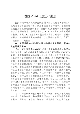 国企2024年度工作要点2024年是中华人民共和国成立75周年,是实现十四五规划目标任务的关键一年,也是X集团成立十周年。X党委将在城投集团党委的坚强领导下,坚持以XXX新时代中国特色社会主义思想为指导,全面贯彻落实XXXXXX考察上海重要讲话精神,围绕XXX考察上海时提出的新定位、新论断、新要求、新任务,积极践行人民城市理念,以实际行动当好主力军突击队先行者。一、学深悟透XXX新时代中国特色社会主义思想,厚植企业发展政治保障(一)深入学习贯彻XXXXXX考察上海重要讲话精神和深入推进长三角一体化发展座谈会精神。把学习宣传贯彻XXXXXX考察上海重要讲话精神和在深入推进长三角一体化发展座谈会上的重要讲话精神同学习党的XX大精神、学习XXXXXX历次考察上海重要讲话精神和对上海工作重要指示要求结合起来,作为学习贯彻XXX新时代中国特色社会主义思想主题教育的重中之重,作为水务两级党组织理论学习中心组学习的核心内容,作为水务党员干部培训的必修课。严格落实第一议题制度,制定学习计划,用好X讲堂、三会一课、主题党日等形式载体,引领广大党员干部职工系统学习领会,一体贯彻落实。开展形式多样的集中宣讲,注重对象化、分众化、互动化,推动习XXX重要讲话精神进基层、进车间、进班组。积极回应市委市政府关切的水务重点任务,主动思考研讨一体化管理、降本增效等工作,更好把握技术逻辑、市场逻辑、治理逻辑,切实拿出X方案。(二)持续巩固拓展主题教育学习成果。持续加强党的理论武装,在系统全面、融会贯通上下功夫,教育引导党员干部悟规律、明方向、学方法、增智慧。学习贯彻《党史学习教育工作条例》,围绕中心、服务大局,以史鉴今、资政育人,引导党员干部学史明理、学史增信、学史崇德、学史力行。继续用好X讲堂等宣教平台,用活杨树浦水厂党史学习教育基地、杨戌雷党代表工作室等红色资源,在打造X思源奋进党建品牌中探索拓展党建阵地。常态化开展调查研究,聚焦发展所需,持续推动急难愁盼问题的解决和改革发展重大任务的落地落实。围绕建设世界一流企业、数字化转型、市场化体系建设等目标要求,问诊把脉,进一步明确企业发展路径。持续改进作风,用好四下基层等机制,驰而不息正作风、治歪风、树新风。持续夯实基层基础,充分发挥好基层党组织的战斗堡垒作用和党员先锋模范作用。持续抓好落实,重实干,做实功,求实效,将主题教育成果转化为践行两个确保使命任务,推动水务高质量发展的成效。二、在践行人民城市理念中展现新担当新作为(一)全力服务发展大局。服务长三角一体化建设,持续向临港新片区、长三角示范区进行技术服务输出,助力实现示范区整体高品质供水目标;探索流域协同、行业监管、企业行动的饮用水安全保障业务化管理模式,提升核心区域供水整体安全韧性和保障能级。参与五个新城建设,探索研究城郊供排水一体化路径,深化青浦供水一体化研究,制定运营提升方案,为年内实现青浦自来水运营接管打好基础。持续开展青草沙水库高水位运行、污水厂超负荷运行,助力韧性安全城市建设。全力落实环保督察和长江经济带生态环境整改要求,持续推进白龙港扩建三期等一批重点项目建设。结合竹园调蓄池、竹白连通管等新工设施投运,优化排水一体化运行调度,科学精准做好溢流管控。优化营商环境,更好实现方便客户、服务企业、推动发展,为本市供水行业迎接世行营商环境及国家版营商环境评估奠定良好的基础。贯彻落实常态化过紧日子和国有企业减亏要求,群策群力实施降本增效。(二)全力履行两个确保使命任务。推进原水保障项目建设,确保青草沙-陈行库管连通等工程年内开工,陈行水库挖潜等工程按期完工。加快水厂深度处理工艺全覆盖,推进杨树浦、长桥、居家桥、迎宾等4座水厂改造工程基本建成,一批工程项目年内具备通水条件,如期完成市委市政府交办任务。常态化保障水源地安全,强化对三大水库藻类等治理措施,做实做细水厂深度处理改造建运协同和一网调度,确保供水平稳。持续推进老旧管网改造,二次供水接管,提高智能水表覆盖率,提升供水服务管理水平。强化高效运营能力和联动功能,做好综合单价模式下的排水生产统筹调度,优化运营策略,提升服务质量,实现污水高效处置。高标准开展泵站雨污混接排查任务,进一步强化设施运维和泵站放江管控,统筹做好防汛安全和水环境改善。三、深化夯实三基建设,全面加强基层党建工作(一)规范组织建设,夯实党建基础。层层压紧压实党建工作责任,强化党支部建设示范引领作用。坚持抓基层强基础,持续推进固本强基三年行动计划(2023-2025),督促指导各基层党组织夯实基层党建基础,高标准完成年度发展党员计划,加强党员教育培训管理,规范组织设置和换届选举工作,严格党费收缴使用管理。开展新一轮X集团党支部建设示范点创建评选,推动结对提升工作。规范做好