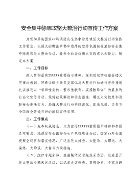 安全集中除患攻坚大整治行动宣传工作方案为贯彻落实国家xx局消防安全集中除患攻坚大整治行动宣传工作要求,以强大的舆论声势和浓厚的宣传氛围助推消防安全集中除患攻坚大整治行动,提升全社会抗御火灾的意识和能力,制定本方案。一、工作目标深入贯彻落实XXXXXX重要指示精神,深刻吸取学校宿舍楼火灾事故教训,积极协调各级各类媒体对大整治行动进行宣传报道扎实推进以常识性宣传、警示性教育、实操性培训为重点的社会化宣传活动,做好政策解读和动态报道,曝光火灾隐患和消防安全违法行为,助推大整治行动持续深化、落地见效,为春节全国两会营造良好的消防宣传氛围。二、工作重点(一)发布权威消息。大力宣传XXXXXX重要指示精神和李强总理要求,跟进发布全国安全生产电视电话会议、国家xx局全国视频会议贯彻落实情况,广泛宣传大排查、大整治、大曝光、大演练、大约谈、大督导六项措施。(二)组织专题采访。邀请媒体记者组成采访团,赴基层开展大整治专题采访活动,以记者走访调查、案例分析、专家点评等各种形式,拍摄、采写专题新闻。对大整治行动进行全过程、全方位宣传报道,及时发布大整治行动工作动态。(三)集中曝光隐患。制作典型火灾案例警示宣传资料和新媒体产品,分场所、分媒介广泛发放、张贴、展播。协调各类媒体平台集中曝光典型隐患、突出问题和严重违法行为,发动企业员工和公众举报身边的火灾隐患和消防违法行为。(四)普及安全知识。聚焦九小场所、多业态混合经营人员密集等三类重点场所,以七类重点人群三支处置队伍为重点,通过推进消防宣传五进,着力普及消防安全知识,强化群众消防安全意识,提高群众自防自救能力。三、工作措施(一)传统媒体宣传1.电视。全省每周在省电视台播出大整治行动相关新闻共计不少于3条,消防科普专题节目共计不少于1个。2.广播。全省每周在省广播电台通过记者调查、现场连线等形式播出大整治行动相关新闻共计不少于3条。3.报刊。全省每周在黑龙江日报刊登大整治行动相关新闻共计不少于3条,报道整治行动工作动态,曝光火灾隐患和整治结果针对群众举报投诉的火灾隐患和违法行为公布处理结果等。4.网站。总队已联合省台《极光新闻》媒体客户端开设黑龙江消防除患攻坚集中整治行动宣传专栏,报道整治行动工作动态针对群众举报投诉的火灾隐患和违法行为公布处理结果等,具体要求前期已下发各地,各地要严把投送稿件质量,推出系列优秀作品。同时要积极协调相关网站播出消防安全公益广告、知识短片等,普及消防安全知识。(二)新媒体宣传1.及时权威发布。做好消防安全集中除患攻坚大整治行动具体内容宣传,解读其重要意义、具体措施,及时处理发布举报火灾隐患处理结果,回应公众对消防安全工作新期盼,动员全社会广泛参与。围绕重点场所消防安全治理、行业消防安全标准化管理,持续发布内容精准的消防安全知识和消防安全管理规范。对网络上出现的误解误读质疑,组织专家进行解疑答惑,做好正确引导,凝聚社会共识。2.丰富传播载体。针对重点整治内容,结合春节、全国两会设置话题,策划制作图文、视频类新媒体作品,注重采用随手拍等多种形式,利用网络直播和短视频开展宣传活动、教育培训、文艺演出等,引导公众参与大整治行动。春节期间,各地要积极组织开展消防科普直播活动。3.强化互动服务。运用大数据及时掌握公众对消防安全的新需求,加强与各类社会新媒体和新媒体平台的沟通联系,争取更多资源支持。用好消防科普教育基地预约平台,在春季开学时,组织学校、培训机构等参观体验。(三)社会化宣传1.抓好常识性宣传。针对冬季火灾特点,组织群众学习消防法律法规、火灾基础知识、消防标志标识等内容,掌握家庭和公众聚集场所火灾预防和逃生知识。聚焦宾馆饭店、集市庙会、车站码头等人员密集场所,做好消防安全三提示。联合教育部门策划组织中小学生消防安全开学第一课。2.抓好警示性教育。结合入冬以来典型火灾案例,及时开展警示性教育,制作火灾警示教育片、复盘演示动画等,利用各类媒体广泛刊播。发动群防群治力量,常态化开展三清三关活动。坚持以案说法,采取监督员讲隐患、火调员讲教训、法制员讲责任的办法,进一步提高群众消防安全意识。3.抓好实操性培训。采取向重点行业部门发出冬季防火建议函、提示信的形式,推动行业部门开展实操性消防安全培训。用好应急消防科普教育基地,加强重点行业领域单位消防安全责任人集中培训。利用xx站开放日、消防科普教育基地等搞好体验培训,提高公众自救互救能力。四、工作要求(一)严密组织推动。各地要将宣传工作贯穿大整治行动始终,制定宣传工作方案,细化落实措施,与业务工作同部署、同推进,切实做到工作有抓手、推进有措施、落实有保障。(二)搞好统筹协调。要主动向当地党委宣传部门汇报并争取支持,积极协调新闻媒体单位等帮助开展宣传策划,制作主题宣传作品,开展集中宣传,形成全省联动的规模声
