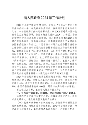 镇人民政府2024年工作计划2024年是新中国成立75周年,是实现十四五规划目标任务的关键一年,也是我镇争先进位,赓续高质量发展的奋进之年。今年镇政府工作的总体要求是:以XXX新时代中国特色社会主义思想为指导,全面贯彻落实党的XXX、二十届二中全会精神和中央经济工作会议精神,深入贯彻落实XXXXXX视察广东重要讲话、重要指示精神,认真落实省委十三届四次全会暨省委经济工作会议、江门市委十四届六次全会暨市委经济工作会议以及市委十四届六次全会暨市委经济工作会议部署要求,细化落实省委1310具体部署、江门市委1+6+3工作安排以及市委六大行动,坚持发展第一要务不动摇,坚决扛牢开平主战场、主城区、主力军的使命担当,紧紧围绕市委改革攻坚年目标任务,持续深化强载体、重招商、优环境工作主线,以敢闯敢试、敢为人先的改革精神加快构建现代化产业体系,推动经济实现质的有效提升和量的合理增长,奋力打造镇域经济高质量发展XX样板,为开平在推进中国式现代化建设中再造一个现代化新开平贡献XX力量。2024年全镇经济社会发展主要预期目标是:地方一般公共预算收入增长6%;规模以上工业产值增长5.5%;固定资产投资增长4%,其中工业投资增长4%;社会消费品零售总额增长5%,全国千强镇排名突破400强,经济综合实力进一步增强。要实现以上目标,重点要抓好五方面工作:一、千方百计优存量、扩增量,全力构建现代化产业体系始终把产业发展作为重中之重,统筹推进传统产业、新兴产业发展壮大,强化高质量发展的产业根基。(一)实施产业平台扩容提质行动。加快开平市国际卫浴创新基地建设,用好用活平台资本金、EOD项目政策资源、地方政府专项债资金,高标准推进基地东片区、产业综合配套、通用厂房及园区配套设施工程建设,全力打造江门市承接产业有序转移主平台。加快泮南片区土地征收工作,整合片区工业资源,打造科创研发基地。继续盘活沙冈工业园周边村级留用地,探索代建返租统一开发模式,形成规模优势,主动衔接周边业态布局,引育优势互补业态集聚,推动村级留用地由零散、低效使用向集约、规模转化提升。加快推进后溪工改工试点项目落地见效,树立低效工业用地提质增效典型示范,进一步释放发展空间。主动对标省级高新技术产业开发区要求,持续完善园区路网、管网、燃气、绿化、商住等生产性服务配套设施,提升工业平台承载力、吸引力。(二)实施重大项目提速增效行动。牢固树立项目为王理念,坚持制造业当家,严格落实领导干部挂钩联系企业(项目)机制,全力协调缇派卫浴、澳佳卫浴、宝伦卫浴、顶尖管业、雅固卫浴、意尼家居、产业智谷等项目建成投产,推动欧陶卫浴、文达卫浴、库兰卫浴、博美卫浴、蒙克卫浴等项目加快动工建设,力促项目早落实、快建设、速达效。全力支持培育产业龙头企业发展壮大,推动依利安达年产值突破50亿元、泰宝聚合物年产值突破45亿元,稳住经济发展大盘。发挥好政府投资的带动放大效应,加快推进开平市国际卫浴创新基地东片区基础设施、沙冈工业园道路等项目建设。同时,鼓励支持企业增资扩产,以广合腐乳、广中皇、康力食品为主体,加快打造食品加工产业集群。积极引导企业实施设备更新、智能化改造、绿色化转型等技术改造项目,推动企业向高端化、智能化、绿色化转型升级。强化项目发展资源要素保障,向辖区内发展潜力强、效益增长快的优质企业、项目进行倾斜支持,激发企业发展新动能。(三)实施产业集群做大做强行动。加大对产业集群的支持培育力度,建立三级企业梯度培育体系,依托开平市国际卫浴创新基地招大引强,聚集龙头企业资源,深化以强引强、以强引链;依托泮南片区工业发展平台,集聚发展基础好、潜力大的中型水暖卫浴企业,进一步壮实行业中坚力量;以后溪工改工项目为试点,逐步推动、铺开村级工业集中区升级改造,建设高标准工业厂房,引导小微企业上楼,加快培育一批链主企业、骨干企业和专精特新企业,努力构建大中小企业协作发展的大卫浴发展模式,积极申报水暖卫浴省级中小企业特色产业集群。同时,深化XX与佛山产区的联动合作,探索开展研发+制造总部+基地产地飞地等跨区域产业合作,共建高端卫浴产业园。大力实施创新驱动战略,推动高新技术企业、专精特新企业提质增量,支持企业组建技术研发创新中心,助力企业转型升级。依托XX卫浴SHUIKOU集体商标和水暖卫浴产业链党委平台,加大对产业集群的宣传推广,进一步擦亮XX卫浴区域品牌。二、多措并举夯基础、抓协调,推动百千万工程加速提效把实施百千万工程作为推动XX经济高质量发展的总抓手,全力推动城乡区域协调发展向更高水平、更高质量迈进。(一)提升村级集体发展。对26个行政村(含东方红)进行精准分类,推动全镇村级集体发展持续向好。支持各村继续走好宜工则工、宜农则农、宜商则商、宜游