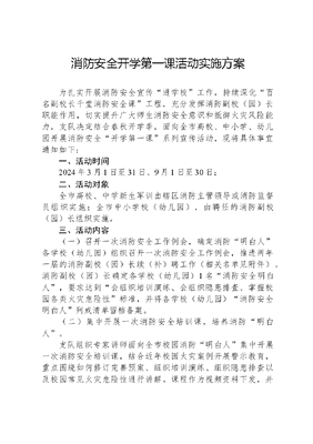 消防安全开学第一课活动实施方案为扎实开展消防安全宣传进学校工作,持续深化百名副校长千堂消防安全课工程,充分发挥消防副校(园)长职能作用,切实提升广大师生消防安全意识和抵御火灾风险能力,支队决定结合春秋开学季,面向全市高校、中小学、幼儿园开展消防安全开学第一课系列宣传活动,现将具体事宜通知如下:一、活动时间2024年3月1日至31日、9月1日至30日;二、活动对象全市高校、中学新生军训由辖区消防主管领导或消防监督员组织实施;全市中小学校(幼儿园),由聘任的消防副校(园)长组织实施。三、活动内容(一)召开一次消防安全工作例会,确定消防明白人各学校(幼儿园)组织召开一次消防安全工作例会,推进两年一届的消防副校(园)长续(补)聘工作(相关名单见附件)。消防副校(园)长确定各学校(幼儿园)1名消防安全明白人,要求达到会组织培训演练、会组织隐患排查、掌握校园各类火灾危险性标准,并将各学校(幼儿园)消防安全明白人列成清单留档备案。(二)集中开展一次消防安全培训课,培养消防明白人。支队组织专家讲师面向全市校园消防明白人集中开展一次消防安全培训课,结合近年校园火灾案例开展警示教育,重点围绕如何修订完善预案、组织培训演练、组织隐患排查以及校园常见火灾危险性进行讲解。课程作为视频资料下发,并由消防明白人组织校园消防安全相关人员学习掌握。(三)开展一次全流程疏散逃生演习,建立长效机制。演练前就相关流程、消防知识、操作要点进行讲解演示,从火灾报警、初起火灾扑救、组织疏散逃生、集结讲评等各环节入手,明确各岗位人员职责任务,落实好校园灭火和应急疏散制度,结合场地适时组织实操体验,同时建立响铃为号长效机制,确保消防副校(园)长或校园消防明白人每学期能够至少组织开展1次疏散逃生演练,确保逃生自救常识覆盖率百分之百。以游戏形式进行消防安全实验互动,生动地讲解学校火灾案例、学校火灾特点、原因及预防措施,针对火灾防范常识与师生进行互动答疑,并就如何扑灭初期火灾、组织人员疏散及火场逃生自救等消防安全知识进行生动示范。其后消防员从严从实假定火情、有人员被困,组织师生开展疏散逃生及初起火灾扑救,让广大师生身临其境,掌握逃生基本技能,亲自动手操作消防器材,提升疏散逃生和自救能力。消防宣传员针对演练过程中发现的问题提出合理化意见,指导学校完善应急预案,同时大队组织辖区学校来和祥路消防救援站开展队站开放参观活动。(四)开展一次消防安全主题班会,交流我眼中的消防安全。以班级为单位组织学生观看全民消防学习平台(通过支付宝搜索全民消防学习平台小程序即可进入学习),召开消防安全主题班会,交流分享消防安全学习心得以及日常生活中发现的消防安全隐患、参观消防队站感受等,消防副校长或校园消防明白人可随机走进班级参与其中。各地区可组织有艺术特长的学生参与主题为我眼中的消防安全文化作品创作,适时开展评选展览活动。四、活动要求(一)各大队要切实提高思想认识,积极对接属地教育部门,提前沟通、科学统筹、联合部署,结合学校场地实际及学生的特点做好活动计划安排,活动结束后将开展情况(文字、图片、视频)及时反馈至支队新闻宣传处,第一阶段截至3月10日、9月10日,第二阶段截至3月31日、9月29日。(二)消防副校(园)长要认真履行《全市消防安全副校(园)长管理制度规定》要求,以高度的责任感和使命感,培养学校(幼儿园)消防安全明白人,督促校园全面开展消防安全培训演练工作,创造良好的校园消防安全环境。(三)活动开展要坚持以结果为导向,以提高师生消防安全素质为主、以关注消防救援队伍为辅,开展培训课程、消防演练等活动要突出重点、突出实效,确保可操作性强、覆盖面广,压实各级责任、筑牢消防安全防线。