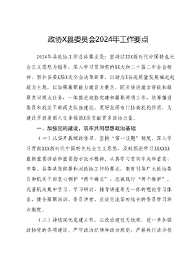 政协X县委员会2024年工作要点2024年县政协工作总体要求是:坚持以XXX新时代中国特色社会主义思想为指导,深入学习贯彻党的XX大和二十届二中全会精神,紧扣县委X届X次全会决策部署,以助力X县高质量发展崛起赶超为主题,以加强履职能力建设为重点,同步推进建言资政和凝聚共识两大任务,一体推进政协党建和履职两项工作,统筹推进委员和机关干部两支队伍建设,更好发挥专门协商机构作用,为建设开放美丽人文幸福新X县贡献更多政协力量。一、加强党的建设,筑牢共同思想政治基础(一)扎实开展理论学习。坚持第一议题制度,深入学习贯彻XXX新时代中国特色社会主义思想,及时跟进学习XXXXXX最新重要讲话和重要指示批示精神。认真学习贯彻中央和省委、市委、县委决策部署和对政协工作的要求,教育引导广大政协委员和机关干部衷心拥护两个确立、忠诚践行两个维护。完善机关集中学习、学习研讨、辅导讲座等为一体的理论学习体系,健全履职培训、委员讲堂、座谈交流等相结合的委员学习培训制度。(二)持续深化党建工作。以政治建设为统领,进一步加强政协党的各项建设。严守政治纪律和政治规矩,严格执行请示报告制度,把准政协工作正确方向。继续推进党建和履职深度融合坚持在全体会议、外出培训、重大调研活动中成立临时党组织;建立由县政协办党支部牵头、委员所在党支部配合、党员委员和党外委员参与的大党建活动实施办法;探索建立党员委员带头调研、带头建言、带头联系界别群众的机制,切实发挥党员委员的先锋模范作用。(三)严格落实工作责任。持续加强县政协党组自身建设,认真履行全面从严治党主体责任,督促班子成员积极履行一岗双责,加强对县政协机关党组、办公室党支部的领导指导,层层压实党建工作责任。严格落实党建、意识形态和党风廉政建设责任制,推动县政协全面从严治党向纵深推进。二、聚焦主责主业,围绕中心大局建言献策(四)认真做好民主协商。围绕积极融入大黄山建设加快方解石资源整合做大红色产业规范民宿产业发展等课题,开展重点民主协商;围绕美丽公路建管护社区养老服务站点运营大查济景区建设发挥知联会和新联会作用等课题,开展对口协商;围绕建立健全送文化下乡长效机制培育众创空间等课题,开展界别协商;鼓励乡镇联络组、委员工作室开展微协商微监督,努力形成一批高质量协商建言成果。(五)深入开展民主监督。围绕县委、县政府决策部署和惠民政策落实,重点围绕政府基金投资运营情况国储林建设情况公共体育设施开放情况多元化调解劳动争议情况餐饮油烟整治轻微免罚政策执行情况等课题,开展专项民主监督。鼓励界别、乡镇联络组、委员工作室围绕全县发展大局和民生举措落实,广泛开展民主监督。积极组织委员通过参加各类听证会、座谈会、评议会,担任特邀监督员、监察员等形式开展常态化监督。(六)扎实开展视察活动。健全全体会议、常委会会议、主席会议、专委会、界别和乡镇联络组等多维一体的调研视察体系围绕云岭园区建设和方解石矿山整治工作电机泵阀产业发展民宿产业发展城市绿地绿道建设农村基础设施建设县医院医疗应急中心建设革命纪念设施保护情况非遗研学基地建设农村生活污水治理等主题,开展专题视察活动。鼓励界别、乡镇联络组、委员工作室立足本领域、本区域,组织委员开展视察活动。三、坚持团结联谊,广泛凝聚推动崛起赶超的强大合力(七)紧密团结委员。持续开展新春访委员,助力解难题访委员,鼓干劲,促发展访委员听心声,找差距促履职活动,广泛联系委员,加强思想引领。鼓励专委会、界别和乡镇联络组以委员活动为纽带,加强互动,增进团结。坚持把加强思想政治引领、广泛凝聚共识作为履职工作的中心环节,融入调查研究、协商监督、视察考察等履职活动。(八)广泛联系群众。深化界别工作,完善委员联系界别群众工作机制,继续开展委员访民情活动,深入了解民情,及时反映民意。鼓励委员立足岗位、发挥特长,积极开展送文化下乡、捐资助学、义诊服务等公益活动,在服务群众中团结群众,有效协助县委和县政府做好稳人心、暖人心、聚人心的工作。(九)加强联络联谊。通过联合举办活动、共同开展调研、邀请座谈交流等方式,密切与县政协各参加单位、知联会、新联会、侨联等的团结联谊,努力把社会各界人士的思想和行动统一到建设开放美丽人文幸福新X县上来。充分发挥政协联系广泛、智力密集的优势,主动加强与沪苏浙地区政协的交流联系、与X县籍在外人士的沟通联络,积极做好宣传推介,讲好X县故事,助力X县发展。四、强化开拓创新,在打造履职品牌上持续用力(十)提升委员工作室知名度。增设2个委员工作室。鼓励工作室打破驻室委员限制,积极吸纳其他委员参加,切实发挥小平台大载体的作用。引导委员工作室围绕群众的衣食住行身边事,