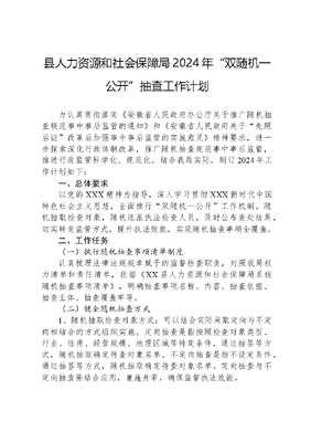 县人力资源和社会保障局2024年双随机一公开抽查工作计划为认真贯彻落实《安徽省人民政府办公厅关于推广随机抽查规范事中事后监管的通知》和《安徽省人民政府关于先照后证改革后加强事中事后监管的实施意见》精神要求,进一步探索深化行政体制改革,推广随机抽查规范事中事后监管,推进行政监管科学化、规范化,结合我局实际,制订2024年工作计划如下:一、总体要求以党的XXX精神为指导,深入学习贯彻XXX新时代中国特色社会主义思想,全面推行双随机一公开工作机制。随机抽取检查对象,随机选派执法检查人员,及时公布查处结果,切实转变监管方式,提升执法效能,实现随机抽查事项全覆盖。二、工作任务(一)执行随机抽查事项清单制度认真梳理法律法规规章赋予的监督检查职责,对照我局权力清单和责任清单,依据《XX县人力资源和社会保障局系统随机抽查事项清单》,明确抽查事项名称、内容、抽查依据、抽查主体、抽查覆盖率等。(二)健全随机抽查方式1、随机抽取检查对象方式:可以结合实际采取定向与不定向相结合的方式组织实施。定向抽查是指按照检查对象类型、行业、性质、经营规模、地理区域等特定条件,通过抽签等方式,随机抽取确定待查对象名单。不定向抽查是指不设定条件,通过抽签等方式,随机抽取确定待查对象名单。定向抽查与不定向抽查要结合应用,兼施并举,确保监督执法效能。2、随机选派执法人员方式:可以采取科学编组、随机匹配的方式,实施全局内随机,各股室、二级机构随机从《XX县人力资源和社会保障局系统随机抽查事项清单》中随机选派。被抽取的行政检查人员与被抽取的检查对象有利害关系的,应当回避,并重新抽取行政检查人员。每次行政检查抽取的检查人员不得少于2人。(三)合理确定随机抽查比例和频次按照既要保证必要的抽查覆盖面和工作力度,又要防止检查过多和执法扰民的要求,以不影响公正与效率为前提,可以合理确定随机抽查的比例和频次,但随机抽取检查对象的比例不得低于《XX县人力资源和社会保障局系统随机抽查事项清单》规定的抽查比例要求;采取区域定向与行业定向相结合方式抽取检查对象的,可以结合实际适当提高比例。对社会关注度高、投诉举报多、风险等级高、有严重违法违规记录等情况的,要加大随机抽查力度,提高抽查比例和频次。对于法律法规规章有规定的,按规定实施;合理安排抽查时间,抽查对象较多的同一抽查事项可分几个时间段开展抽查。(四)强化随机抽查结果应用各股室、二级机构组织实施双随机一公开监管工作,应当按照谁登记、谁检查、谁录入、谁公开的原则开展抽查工作,按照全程留痕、责任可溯要求,及时做好抽查结果记录和工作台账归集,并在行政检查结束后10个工作日内在监管系统网站上公布双随机一公开执法检查结果,确保随机抽查过程的公平、公正、公开和规范。要对抽查发现的违法行为,依法依规及时查处,及时向社会公开行政处罚案件信息,接受社会监督。属于其他部门管辖的,及时移送相关部门查处;涉嫌构成犯罪的,依法及时向公安机关移送。三、工作要求(一)加强组织领导文可居文库——海量学习资料,手机电脑下载www.wenkeju.com各股室、二级机构务必高度认识此项工作的重要性和必要性,切实加强对随机抽查工作的重视和学习,确保随机抽查工作取得明显实效。(二)严格落实责任制定抽查计划清单表,明确工作进度要求,落实责任分工强化过程管控,确保此项工作落到实处,抓出成效。(三)强化公平公正执法意识随机抽查是行政执法监管方式的探索和创新,在开展双随机工作中执法人员要加强规范执法意识,加快转变执法理念,不断提高执法能力。 文可居文库——海量学习资料,手机电脑下载www.wenkeju.com