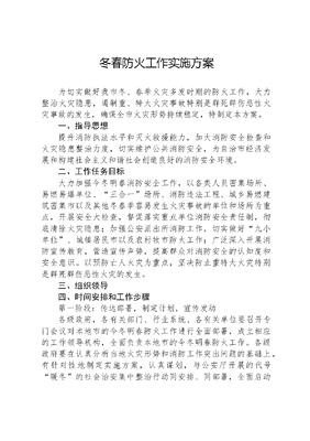 冬春防火工作实施方案为切实做好我市冬、春季火灾多发时期的防火工作,大力整治火灾隐患,遏制重、特大火灾事故特别是群死群伤恶性火灾事故的发生,确保全市火灾形势持续稳定,特制定本方案。一、指导思想提升消防执法水平和灭火救援能力,加大消防安全检查和火灾隐患整治力度,切实维护公共消防安全,为自治市经济发展和构建社会主义和谐社会创造良好的消防安全环境。二、工作任务目标大力加强今冬明春消防安全工作,以各类人员密集场所、易燃易爆单位、三合一场所、消防违法工程、城乡易燃建筑密集市以及其他冬春季容易发生火灾事故的单位和场所为重点,开展安全大检查,督促落实重点单位消防安全责任制,彻底清除火灾隐患;加强公安派出所消防工作,切实做好九小单位、城镇居民市以及农村牧市防火工作;广泛深入开展消防宣传教育,营造宣传声势,提高群众对消防安全的认知度和安全意识。以预防亡人火灾为重点,坚决防止重特大火灾特别是群死群伤恶性火灾的发生。三、组织领导四、时间安排和工作步骤第一阶段:传达部署,制定计划,宣传发动各级政府,各有关部门、行业系统、各有关单位要召开专门会议对本地市的今冬明春防火工作进行全面部署,成立相应的工作领导机构,全面负责本地市的今冬明春防火工作。各级政府要在认真分析当地火灾形势和消防工作突出问题的基础上,有针对性地制定实施方案,认真谋划,与公安厅开展的代号暖冬的社会治安集中整治行动同安排、同部署,全面启动今冬明春防火工作。要紧密结合今冬明春防火工作,在119消防宣传日期间,开展形式多样、内容丰富的宣传活动,形成浓厚的冬春季防火宣传氛围。第二阶段:突出重点,加强检查,落实措施(一)集中开展隐患整治行动。各地要按照什么地方不放心、就排查什么地方,什么问题突出、就解决什么问题的原则,认真研究分析本地市消防安全形势,针对本地市存在的突出问题,制定相应防火措施,组织公安、消防、安监、监察、建设、规划、工商等部门,召开联席会议、开展联合执法,加强沟通配合,与正在开展的火灾隐患排查整治专项行动、建筑消防设施专项治理、在建工程施工人员住宿场所消防安全专项整治等工作有机结合起来,形成全方位消除火灾隐患的执法网络。各地要根据冬季小火亡人火灾多发的规律,组织当地公安派出所对辖市内居民市、出租房屋、城乡结合部及九小场所进行彻底的防火安全检查,检查要以彻底清除占用、堵塞、封闭疏散通道、安全出口,打通生命通道为主要内容,通过清查治理,消除上述场所的火灾隐患。东部盟市,特别是呼伦贝尔、兴安盟要认真汲取近年来林市火灾的教训,切实提高对做好森林防火工作重要意义的认识,牢固树立家火山火一起防的指导思想,当地政府要协调消防、林业主管部门以及森林公安部门、武警森林部队、气象部门、通信部门等各有关单位密切配合,通力合作,认真履行职责,共同搞好林市防火工作,全力遏制火烧连营事故发生。五、工作要求(一)提高认识,加强领导。我市冬春季节降水少、大风多,草原、林市处于枯草期,群众用火、用电、用油、用气频繁。同时,冬季节日集中,燃放烟花爆竹等行为不断增加,经贸活动频繁,文化娱乐活动增多,各类公共场所人员高度聚集,火险等级居高不下,亡人火灾风险剧增。各级政府、各有关部门和单位的领导同志务必引起高度重视,要进一步统一思想,文可居文库——海量学习资料,手机电脑下载www.wenkeju.com坚决克服松懈思想和厌战情绪,保持清醒的头脑,强化忧患意识,把遏制重特大火灾事故特别是群死群伤火灾,确保将保持今冬明春的火灾形势稳定作为当前一项中心任务来抓,竭尽全力遏制群死群伤的恶性火灾事故发生,千方百计保护人民群众的生命财产安全。各级政府要分别成立由主管领导担任组长,相关部门参加的工作领导组织机构,各有关部门、行业系统和社会单位也要成立今冬明春防火安全组织机构,负责组织领导本部门、本单位的冬春季防火工作。(二)研判形势,及早部署冬防工作。各地要认真研判本地冬、春季火灾特点和影响火灾形势稳定的突出问题,抓紧制定今冬明春防火工作方案,及时进行部署,将冬、春防工作责任落实到有关部门、落实到乡镇街道、落实到社会单位;要高度重视城乡结合部和农村防火工作,推动居民委员会、村民委员会经常开展群众性消防工作,指导村居民落实生产生活用火用电安全措施,建立村民多户联防网络,加强对老弱病残等弱势群体的消防安全防护;圣诞、元旦、春节、元宵等节日期间各地政府要组织有关部门联合开展防火检查,落实各项火灾防控措施。(三)突出重点,大力加强火灾隐患排查整治。各级政府要对本地消防安全工作存在的问题分类排队,逐一制定整改推进措施,明确解决时限,要动员安监、建设、规划、工商、文化等有关部门和单位,组织开展全社会、全方位的消防安全检查。在火灾隐患排查整治中,一定要充分运用法律手段,始终保持强力整治隐患的高压态势,