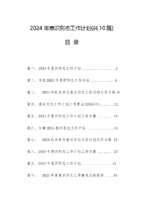 2024 年意识形态工作计划(共10篇)目录篇一、2024年意识形态工作计划 ..2篇二、学校2023年意识形态工作总结 .. 6篇三、2024年机关单位意识形态工作计划工作方案.8篇四、意识形态工作计划工作要点(2024年).12篇五、2024年意识形态工作计划工作方案 . 16篇六、乡镇2024意识形态工作计划 .19篇七、2024机关单位意识形态工作计划工作方案 22篇八、2024年意识形态工作计划工作方案 . 27篇九、2024年意识形态工作计划.31篇十、2023年度意识形态工作情况总结报告 34篇一、 2024年意识形态工作计划2024年是贯彻落实党的XXX精神的关键之年,是中华 人民共和国成立75周年,也是实施十四五规划的攻坚之年,做好意识形态工作意义重大。为全面落实中央、省、 市和县委关于意识形态工作责任制的有关规定和精神,牢牢 掌握意识形态工作的领导权和主动权,根据我办实际制订本计划。一、强化意识形态工作责任制按照分级负责和谁主管谁负责的原则,领导班子对我局 意识形态工作负主体责任,把意识形态工作摆在全办工作的 重要位置,纳入重要议事日程,纳入年度重点工作,纳入办 年度目标绩效考核。党支部书记是第一责任人,带头抓思想 理论建设,带头管阵地把导向强队伍,重要工作亲自部署、 重要问题亲自过问、重大事件亲自处置。领导班子其他成员 根据工作分工,按照一岗双责要求,抓好分管股室的意 识形态工作,对职责范围内的意识形态工作负领导责任。将 履行意识形态工作责任制情况纳入民主生活会对照检查,纳文可居文库——海量学习资料,手机电脑均可下载www.wenkeju.com入班子成员个人述职重要内容,定期向上级汇报。二、强化意识形态工作的主体责任要牢固树立抓党的意识形态工作是本职、不抓是失职、 抓不到是渎职的理念,做到知责明责、守责履责、担责尽责,健全工作机制,严格制度执行,推动意识形态工作责任落实到位,牢牢掌握意识形态工作的领导权主动权。1、 落实党管意识形杰工作原则认真贯彻落实党中央和省委、市委、县委关于意识形态 工作的决策部署和指示精神,牢牢把握正确的政治方向,严 守政治纪律、组织纪律和宣传纪律,坚决维护党中央权威,在思想上政治上行动上同以XXX同志为核心的党中央保持高度一致。2、壮大积极健康主流思想文化(1)坚持把党的思想理论建设作为意识形态工作的根本任务,认真学习贯彻XXXXXX系列重要讲话精神,持续文可居文库——海量学习资料,手机电脑均可下载www.wenkeju.com巩固和深化学习贯彻XXX新时代中国特色社会主义思想主题教育成果,进一步筑牢信仰之基、补足精神之钙、把稳 思想之舵,加强四个全面战略布局的宣传教育,组织好社会主义核心价值观的学习和践行。(2)扎实抓好干部理论学习,每年集中学习不少于8次,其中对意识形态工作相关内容的学习每年不少于2次。3、加强对各类意识形态阵地的管理(1)按照谁组织谁负责、谁审批谁监督的原则,加强 报告会、研讨会、讲座论坛的管理。必须事先经过本单位党 支部批准,报上级备案后,方可组织实施。不得遨请政治倾向有明显偏差的报告人。(2)加强反邪教工作,防范邪教在意识形态领域的渗透。三、强化意识形态工作责任制考核文可居文库——海量学习资料,手机电脑均可下载www.wenkeju.com建立意识形态工作责任制的检查考核制度,健全考核机 制,明确检查考核的内容、方法、程序,推动考核工作规范化、制度化和常态化。1、班子成员要定期向党组专题汇报意识形态工作。对本局意识形态领域出现的重要动向和问题,应主动在党员干部中进行内容通报。2、 把意识形态工作作为向党员大会报告工作的重要内容。3、 意识形态工作要作为领导班子成员民主生活会、领 导班子及其成员述职报告和党支部书记履行党建责任制情况的重要内容。4、 意识形态工作要纳入领导班子、领导干部目标管理和干部任前考察、年度考核的重要内容,作为干部评价使用和奖惩的重要依据。四、强化意识形态工作责任追究严格追查问责是落实领导班子和领导干部意识形态工文可居文库——海量学习资料,手机电脑均可下载www.wenkeju.com作责任的关键。坚持有错必纠、有责必问,强化问责刚性和 硬约束,既查失职、渎职,也查为官不为为官慢为, 对导致意识形态工作出现不良后果的,要严肃追究相关责任 人责任。领导班子、领导干部有下列情形之一,造成不良影 响的,视情节轻重,报请县纪委监委追究责任。情节较轻的, 给予批评教育,书面检查,诫勉谈话;情节较