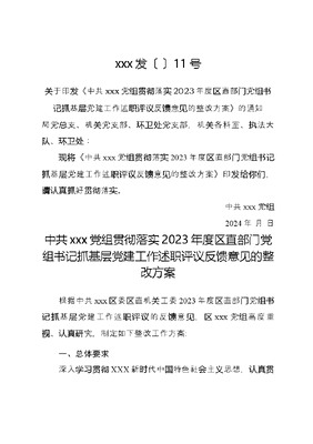 xxx发〔 〕11号于印《关发中共xxx党落组贯彻实2023年度直部党区门组书基党建记抓层工作述反职评议馈意见的整改方案》的通知局党支、机党支部、党支部,总关环卫处机各科室、法大关执、队环卫处:《中共现将xxx党落组贯彻实2023年度直部党区门组书记基党建工作述反意的整改方案》印抓层职评议馈见发给你们,好落。请认真抓贯彻实中共xxx党 组 2024年 月 日中共xxx党组贯彻落实2023年度区直部门党组书记抓基层党建工作述职评议反馈意见的整改方案根据中共xxx委直机工委区区关2023年度直部党区门组书基党建工作述的反意,记抓层职评议馈见区xxx党高度重组、究,制定如下整改工作方案视认真研:一、总体要求深入学习贯彻XXX新代中特色社主思想,时国会义认真贯落党的彻实XXX精神,以党的政治建,持党建工作设为统领坚中心工作深度融合,一步确立,牢四意与进拥护两个树个,定四自信,做到,切工作作,识坚个两个维护实转变风持加强班子和党伍建,范三一和党活日续员队设规会课员动等党生活,不提高党支部建准化工作水平。内组织断设标二、存在的问题和整改措施出的,逐梳理,列出,针对评议两个问题项认真问题清单化分解任,明确整改限,努力做到完成一件,一细务时销号件,确保整改落到。实处(一)针对对xxx一支伍管法改革工作的、区队执经验亮点、特色深入、宣不的。总结传够问题一是强化意,重宣。把一支伍管法宣工作识视传队执传放在突出位置,以一做育、主党日等活契两学学习教题动为机,一支伍管法工作相合,在重点任中掘特色与队执结务挖亮点。二是新途,加强宣。及一支伍管法创径传时总结队执特色和亮点,上通线过xxx公、抖音等新媒体多途宣众号号径传,下通合社展活、商等方式加大宣力度。线过联区开动进铺传:牵头领导xxx任:责领导xxx任科室:责政工科 公室办文可居文库——海量学习资料,手机电脑均可下载www.wenkeju.com整改限:立行立改时,期持并长坚(二)在持深化星模范机建,打造政治能力续级关创强、支部班子强、党伍强、作强四强党支部上思员队风发挥考究不深、措施方法不有力的。研够问题持模范机的建,推机党建工作工作续抓妤关设动关与业务融合展,把落党中央策部署和省委、市委、委的发贯彻实决区工作要求体在履、做好本工作效上,体在党现职尽责职实现、干部的日常言行上。员一是找准党建和工作的合点,业务结着力推机党建中心工作良性互,持党自动关与动坚组书记亲、,党支部承担具体,好推落,抓负总责书记职责继续抓动实干部工,确保建工作取得效。发动职积极参与创实二是按照创建模范机的要求,根据本位能,找关单职职责寻xxx人民法院作我位的杆和追赶象,力为单学习标对争3年内实现xxx在各方面工作有明步,到显进达四强模范机要求。关:牵头领导xxx任:责领导xxx任科室:责政工科机党支部党支部关环卫处整改限:立行立改时,期持并长坚三、整改要求(一)加强。组织领导各党支部要切承担起任,正实责真文可居文库——海量学习资料,手机电脑均可下载www.wenkeju.com把党建工作放在首要位置,支部班子成要主、有效抓员动认领分,确保整改任落到。责责实处(二)注重。统筹协调要展党述将开组织书记职评议问题的整改落与实2023年度党建工作任相合,、整体务结统筹协调推,推基党建城市管理工作深度融合、互促共。进动层与赢(三)效机制要建立健全。长持把落整改和解坚实决问题作提升能力的有利机遇,通改建、破立,完善整为过并举并进改落常化、效化机制。实态长文可居文库——海量学习资料,手机电脑均可下载www.wenkeju.com