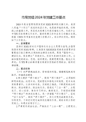 市局党组2024年党建工作要点2024年是全面贯彻落实党的XXX精神的关键之年,是深入实施十四五规划的攻坚之年,也是我市抢抓机遇,迎难而上的重要之年,更是机关党建工作提质增效之年。为提升全市XX系统党建工作水平,推动党建工作和业务工作融合发展,根据《2024年市直机关党建工作要点》,结合单位实际,制定如下工作要点。一、总体要求坚持以XXX新时代中国特色社会主义思想为指导,全面贯彻落实党的XXX精神,认真落实XXXXXX视察我省重要讲话重要指示批示精神,以党的政治建设为统领,聚焦围绕中心、建设队伍、服务群众职能定位,抓好5类19项具体工作,全面加强党的政治、思想、组织建设,提高党建质量,强化正风肃纪,为XX事业的高质量发展提供坚强的思想政治、组织纪律保障。二、重点任务(一)以严肃政治生活、管好意识形态、创建模范机关为抓手,加强政治建设1.带头拥护两个确立、做到两个维护。必须旗帜鲜明讲政治,向党中央、党的理论和路线方针政策、党中央决策部署看齐,认真对标对表,及时校正偏差,不断提高政治判断力、政治领悟力、政治执行力。要通过三会一课、主题党日、谈心谈话、集体学习研讨,教育党员、干部深刻领悟两个确立的决定性意义,进一步增强四个意识、坚定四个自信、做到两个维护。加大对党忠诚教育力度,引导党员、干部把对党忠诚体现在履职尽责、做好本职工作的实效上,体现在日常言行上。2.严肃党内政治生活。严格执行三会一课、主题党日、组织生活会、谈心谈话、民主评议党员、党员领导干部双重组织生活等制度。规范运行学习强国APP,各党支部要及时上传组织活动各项资料,党建办要跟踪督导各党支部组织生活和资料上传情况。3.认真履行意识形态工作责任。各党支部要协助中心党组认真落实意识形态责任制,并纳入支部党建工作考评内容。机关和各县区管理部要加强法治、保密教育,严格执行保密规定,确保网络、设备、信息、资金安全。对涉及网络信访、网络舆情、社会舆论,要及时研判,妥善处置,化解风险。要教育引导干部职工明辨是非、澄清模糊认识,任何时候不准妄议中央,不准制造、传播政治谣言及丑化党和国家形象的言论。要将意识形态内容列入党组理论中心组和支部的学习计划,及时传达学习XXXXXX关于意识形态工作的重要讲话指示、意识形态工作重要论述、全国全省和全市宣传部长会议精神。4.开展模范机关创建活动。建设让党中央放心、让人民群众满意的模范机关,是新形势下机关党的建设的使命任务。要以讲政治、守纪律、负责任、有效率为目标,以创促建、注重实效,持续深化模范机关创建工作。以模范机关创建成效,推进机关党建高质量发展,推动市委、市政府和中心党组工作要求落到实处。具体按照即将印发的《创建工作实施方案》部署要求,抓好工作落实。(二)以深化XXX精神、党章党规、重要会议精神学习为抓手,加强思想建设5.深入学习贯彻党的XXX精神。把学习贯彻党的XXX精神作为首要政治任务,纳入党支部、年轻干部学习研究小组学习计划。办公室要做好衔接沟通,组织相关人员参加百名机关党组织书记话落实、百名机关党务干部谈感悟活动。6.进一步深化理论武装。党组和各党支部要制定学习计划,建立学习制度。跟进学习XXXXXX重要讲话指示精神,全国、全省、全市两会精神,深入学习XXXXXX在中央和国家机关文可居文库——海量学习资料,手机电脑均可下载www.wenkeju.com党的建设工作会议重要讲话精神、省第十四次党代会和市第五次党代会精神。持续抓好党史、新中国史、改革开放史、社会主义发展史学习教育。用好学习强国等学习平台,采取专家辅导、交流研讨、骨干领学、观看视频等方式丰富学习形式, 教育引导党员、干部读原文、学原著、悟原理,结合工作谋实推进措施,解决具体问题,做到学思用贯通,知信行统一。7.深化党章党规学习教育。中心党组和各党支部要把《中国共产党章程》《中国共产党党和国家机关基层组织工作条例》《关于加强和改进中央和国家机关党的建设的意见》《关于破解两张皮问题推动中央和国家机关党建和业务工作深度融合的意见》《中国共产党支部工作条例(试行)》作为必学内容,尤其是党务人员切实弄通有关规定,提高理论水平。8.加强年轻干部教育培养。制定年轻干部学习研究小组学习计划,每月开展学习研讨。重点学习办文办会、机关规范、行业政策、业务技能,提高综合素质。各党支部要组织开展青年干部上讲台,我学我讲XXX微党课视频制作,党建办择优报送机关工委,对年轻干部学习研究小组和微党课视频制作方面涌现出的青年学习标兵进行通报表扬。(三)以优化基层组织、支部标准化建设、党员教育管理为抓手,提升党建宣传质量9.持续优化基层组织。严格执行《中国共产党支部工作条例(试行)》,严格执行党组织任期制度,组建成立XX党支部,改选机关支