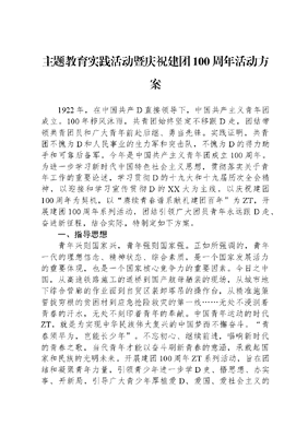主题教育实践活动暨庆祝建团100周年活动方案1922年,在中国共产D直接领导下,中国共产主义青年团成立。100年栉风沐雨,共青团始终坚定不移跟D走,团结带领共青团员和广大青年前赴后继、勇当先锋。实践证明,共青团不愧为D和人民事业的生力军和突击队,不愧为D的得力助手和可靠后备军。今年是中国共产主义青年团成立100周年。为进一步学习新时代中国特色社会主义思想,贯彻落实关于青年工作的重要论述,学习贯彻D的十九大和十九届历次全会精神,以迎接和学习宣传贯彻D的XX大为主线,以庆祝建团100周年为契机,以赓续青春谱系献礼建团百年为ZT,开展建团100周年系列活动,团结引领广大团员青年永远跟D走、奋进新征程,结合实际,特制定如下方案。一、指导思想青年兴则国家兴,青年强则国家强。正如所强调的,青年一代的理想信念、精神状态、综合素质,是一个国家发展活力的重要体现,也是一个国家核心竞争力的重要因素。今日之中国,从高速铁路施工的道桥到国产航母舾装的现场,从城市地下综合管廊的作业面到自贸区装卸塔吊的操作台,从精准施策誓拔穷根的贫困村到应急抢险救灾的第一线……无处不浸润着青春的汗水,无处不刻印着青年的奉献。中国青年运动的时代ZT,就是为实现中华民族伟大复兴的中国梦而不懈奋斗。青春须早为,岂能长少年。不忘初心、继续前进,唱响新时代的青春之歌,当代青年才能以奋斗刷新青春的意涵,承载起国家和民族的光明未来。开展建团100周年ZT系列活动,旨在团结和凝聚青年力量,引领青少年进一步学D史、悟思想、办实事、开新局,引导广大青少年厚植爱D、爱国、爱社会主义的情感,让红色基因、革命薪火代代传承。二、工作任务今年,我们D将召开XX大,这是包括广大青少年在内的全D全国各族人民政治生活中的一件大事。今年也是中国共青团成立100周年。全团要深入学习贯彻新时代中国特色社会主义思想和D的十九届六中全会精神,更好用D的百年奋斗重大成就和历史经验增长智慧、增进团结、增加信心、增强斗志,着力发挥伟大建D精神的统领作用,履行好为D育人的职责使命,引导团员青年深刻感悟两个确立的决定性意义,增强四个意识、坚定四个自信、做到两个维护,为实现D的第二个百年奋斗目标汇聚强大青春力量,以实际行动迎接D的XX大胜利召开。一、突出政治要求,把学习新时代中国特色社会主义思想作为常态化D史、团史学习教育的重中之重。持续提升D的创新理论青年化阐释能力。针对青年认知特点和接受习惯,结合深层次思想认识问题、重大现实问题、社会热点难点问题等,通过成就教育、形势政策教育等多种形式,有效解疑释惑、回应现实关切,面向青年把故事讲生动、把逻辑讲明白、把道理讲透彻。创新青年大学习,进一步提升每周网上ZT团课、队课质量,逐步由以线上学习为主转变为线上、线下同步开展,坚决避免形式主义,努力打造用新时代中国特色社会主义思想武装青年的品牌项目。推进青年讲师团计划。遴选培训一批政策理论素养深、翻译转化能力强、现场宣讲效果好的青年宣讲骨干,常态化深入基层、走到青年群体中,围绕重大ZT、聚焦青年思想困惑和关切诉求,开展分众化、互动式、小范围理论宣讲,把D的科学理论讲清楚、讲明白。深化青年马克思主义者培养工程。着力在各领域培养一批具有忠诚政治品格、浓厚家国情怀、扎实理论功底、突出能力素质,忠恕任事、人品服众的青年政治骨干。完善432培养体系,推动开设青马班,启动实施青马工程西部计划与研究生支教团专项。办好青社学堂。坚持正面引导、解疑释惑、分众分层、注重实效的原则,以灵活多样、时尚新颖的方式组织面向新兴青年群体的培训,通过理论学习、红色教育、走访调查等方式,引导新兴青年认清时代责任和历史使命,坚定听D话、跟D走的信心决心。二、突出常态长效,把D史学习教育融入共青团组织生活和日常教育。坚持把团支部作为基本学习单元,以学D史、强信念、跟D走为ZT,推动D史学习教育进支部、进团课、进活动。推动青年在坚持个人自学的基础上,积极参与专题学习、ZT宣讲、团课培训,规范开展入团仪式教育和组织生活。以重大节日和纪念日为契机抓好学习教育,集中开展D的故事我来讲、我和团旗合个影、清明祭英烈等活动,引导青年走进身边的红色纪念设施、走访英雄模范人物、抒发爱D爱国情怀,感悟初心使命、传承红色基因、赓续精神血脉。创作和推广红色文化精品,以思想性、艺术性、观赏性俱佳的文化精品打动青少年、教育青少年。加强青少年文化阵地建设,强化青少年教育基地、青少年宫、新媒体中心等功能。常态化组织好书巡展、好戏巡演、好电影巡映等活动。三、突出青少年特色,提升D史学习教育的针对性有效性。发挥网络新媒体优势。在AAA、微博、B站、抖音等新媒体平台常态化开设D史、团史学习教育相关专栏,持续发布ZT文章、H5、短视频、动漫等多元化