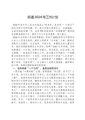 街道2024年工作计划2024年是中华人民共和国成立75周年,是实现 十四五规划目标任务的关键一年,是沂河新区乘势而上、加速崛起、全面突破的关键一年,也是XX街道推进田园新城建设的攻坚提速增效之年。做好今年工作至关重要、意义重大。2024年全街道工作总体思路是:坚持以XXX新时代中国特色社会主义思想为指导,做好主题教育后半篇文章,围绕沂河新区工业强区、生态城市、和美乡村、幸福民生四大重点任务,锚定田园新城建设工作目标,按照1511工作举措,坚持党的建设一个引领,统筹乡村振兴、项目服务、社区治理、民生保障、一排底线五项重点工作,着力强化作风能力一个保障,聚力实现争先进位一个目标,加快东农中工西城三区并进、生产生活生态三生共美。持续推进产城融合、提升品质、强工特农、全面发展,全力提升人民群众满意度,赢得群众好口碑,取得田园新城建设新突破。一、坚持党建一个引领,基层治理再深化一是实施头雁领航工程。紧紧围绕书记抓、抓书记工作主线,细化实化党建工作责任,抓住党组织书记这个关键少数,完善街道村党组织书记专业化管理实施办法,举办党组织书记专题研讨班、廉政家风培训班、书记沙龙等主体班次,分类组织开展信访矛盾化解、拆迁还建、项目招引、社区治理等提升培训班,做好党支部书记系统化培育,培育一批示范书记。用好市区选派驻村第一书记,使其成为建强基层组织、带领群众致富、促进乡村振兴的生力军,全力打造第一书记示范片区。加大对不胜任、不称职村党组织书记调整力度,采取内挖、外引、下派等多种方式结合的方式,重点从本村居致富能手、退役军人、高学历人才、优秀党员等群体中发现、推荐和选配头雁,力争年内实现50周岁以下党组织书记占比提高至58%以上。二是实施凝心铸魂工程。坚持不懈用XXX新时代中国特色社会主义思想凝心铸魂,依托理论中心组、梅家之言大讲堂、星火论坛等载体,加强理论武装,牢牢掌握意识形态的领导权,夯实奋进建设田园新城的思想根基。深化拓展主题教育成果成效,做实主题教育后半篇文章,把学习贯彻新时代中国特色社会主义思想、重要讲话和指示批示精神列为基层党组织书记集中轮训和基层党员全员培训的重要内容,完善述学、评学、践行机制,深化拓展党的创新理论武装刻骨铭心进头脑学原著、强信念、做表率活动,常态开展大学习、大讨论、大落实活动,切实把学习成效转化为建设田园新城的强大动力。三是实施人才育苗工程。补充完善全街道积极分子的存量及年龄比例结构,制定2024年发展党员工作计划,实现两年以上不发展党员行政村、三年以上不发展党员自然村动态清零。强化人才考核机制,将人才工作纳入街道年度考核目标体系,制定街道人才工作目标责任制考核实施方案,进一步强化责任意识,形成上下联动、齐抓共管、协作高效、整体推进的人才工作良好局面。深化实施四雁工程,充分发挥本地人才的作用,支持土专家田秀才乡创客等创新创业,引进新型人才,弥补人才空缺,内外结合,形成人才合力,为特色产业发展助威助力,献计献策。采取能人+合作社+农户等模式,推广新品种,运用新科技,加快会种地向慧种地转变,增强发展优势,提升产业竞争力。四是实施片区融合工程。注重统筹规划,加强产业协同,实行片区党委统筹资源要素服务主导产业,各村党组织立足产业唱主角、挑大梁模式。在培育特色产业的过程中,立足实际,找准特色,注重党建引领,做强示范片区。遵循地理位置相邻,资源禀赋相似,产业结构相近的原则,探索建立甜瓜、葡萄示范片区党委,推动村党组织跨村联建、融合发展。加强干部统筹调配、经费统筹使用、活动统筹开展、工作统筹考核等,统一调配干部人才,协调使用土地、车间等资源,增强片区发展活力,形成共建共治共享的一盘棋格局。五是实施强根固基工程。持续跟进后进班子工作开展,通过走访调研、履职评估等形式,及时掌握后进村发展情况和工作动态,切实巩固好整治成果。完善党建引领村级治理各项制度,严格落实三会一课、谈心谈话、民主评议党员、群众说事等制度,推动村级治理特派员、胡同长、美德积分、重大事项票决制等工作开展。结合新区红网善治工程,深化党建引领城市基层治理,进一步理顺社区党组织引领下的小区党支部、物业服务企业、业委会等主体间的关系,做好统筹协调,发挥楼长、单元长作用,不断提升社区服务质量。进一步规范党员量化积分管理工作,探索符合基层治理实际的党员量化积分实施方案,确保党员量化积分管理工作抓在经常、落在实处、取得实效。借鉴干沟渊、大墩村的成功经验,进一步发挥农村基层党组织在乡村治理过程中的带动作用,力争在每个工作区新推出2-3个具有示范作用的党支部。六是实施清风润梅工程。紧盯新区党工委第一轮巡察反馈问题,切实担负起问题整改的监督责任,举一反三,杜绝边改
