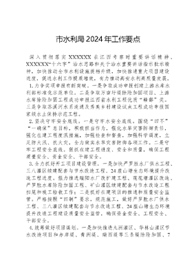 市水利局2024年工作要点深入贯彻落实XXXXXX在江西考察时重要讲话精神、XXXXXX十六字治水思路和关于治水重要讲话指示批示精神,加快推动全市水利设施提档升级,加快推进重大项目建设进度,促进水利工作提质增效,有力推动高安水利高质量发展。1.力争奖项申报有新突破。一是争取成功申报创建上游水库水利部标准化示范单位。二是争取万亩圩堤除险加固项目、上游水库除险加固工程成功申报江西省水利工程优质赣鄱奖。三是争取苏溪河水系连通及秀美乡村建设试点工程成功申报国家级水土保持示范工程。2.坚决守牢安全底线。一是守牢水安全底线。围绕四不一确保总目标,积极担当作为,强化水旱灾害防御责任,强化在建工程度汛措施,加强检查和督查,加强科学调度,立足防大汛、抗大灾,全力做实水旱灾害防御各项工作。二是守牢工程安全底线。狠抓在建工程进度、安全和质量,确保工程质量安全、资金安全、干部安全。3.全力抓好开工项目建设管理。一是加快严罗胜水厂供水工程、三八灌区续建配套与节水改造工程、24座山塘生态环境提升改造工程进度。强力推进瑞阳水厂改扩建工程、莲花塘灌区改造、严罗胜水库除险加固工程、矿山灌区续建配套与节水改造工程扫尾和竣工验收工作;二是抓好在建项目的推进和质量安全监管。严格按照四制要求,规范施工,做好严罗胜水厂供水工程、三八灌区续建配套与节水改造工程、24座山塘生态环境提升改造工程建设质量安全监管,确保资金安全、工程安全、干部安全。4.统筹做好项目谋划。一是加快推进九洲灌区、华林山灌区节水改造项目和赤岸堤、青洲堤、瑞西堤等三条堤除险加固、7座中型水闸除险加固、万安堤除险加固项目以及黄沙港、溪桥水、城陂河等3条流域积200km²以上中小河流治理项目前期工作,争取2024年早日动工建设,确保项目早开工。二是加快已入库的特别国债项目前期工作,多争取中央预算内资金支持。5.持续提升行业监管能力。一是持续强化行业管理,确保全市水事秩序良好;二是强化水土保持监督管理,坚决查处违法违规行为;三是持续强化河湖领域监管,规范涉河建设项目和活动审批;四是加强河湖管理动态监控,保障河湖生态流量;五是持续开展清河行动、河湖清四乱等专项整治行动,严厉打击涉河湖违法违规行为。五是深入推进幸福河湖建设,继续打造连锦河、苏溪河幸福河湖;推进河湖健康评价,建立全市河湖健康档案,开展一河(湖)一策滚动编制;努力建设河湖安澜、生态健康、环境优美、文明彰显、人水和谐的幸福河湖。