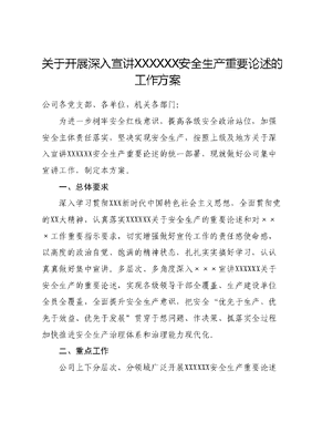 关于开展深入宣讲XXXXXX安全生产重要论述的工作方案公司各党支部、各单位,机关各部门:为进一步树牢安全红线意识,提高各级安全政治站位,加强安全主体责任落实,坚决实现安全生产,按照上级及地方关于深入宣讲XXXXXX安全生产重要论述的统一部署,现就做好公司集中宣讲工作,制定本方案。一、总体要求深入学习贯彻XXX新时代中国特色社会主义思想,全面贯彻党的XX大精神,认真落实XXXXXX关于安全生产的重要论述和对×××工作重要指示要求,切实增强做好宣传工作的责任感使命感,以高度的政治自觉、饱满的精神状态,扎扎实实搞好学习,认认真真做好集中宣讲。多层次、多角度深入×××宣讲XXXXXX关于安全生产的重要论述,实现各级领导干部全覆盖、生产建设单位全员全覆盖,全面提升安全生产意识,把安全优先于生产、优先于效益、优先于发展贯穿于想问题、作决策、抓落实全过程加快推进安全生产治理体系和治理能力现代化。二、重点工作公司上下分层次、分领域广泛开展XXXXXX安全生产重要论述宣讲活动,紧密结合各自工作实际,有针对性地开展宣讲。(一)组织收听收看××××主要负责人开展的专题宣讲责任单位:党群工作部、安全监察部责任人:××××完成时限:1月31日前(二)开展领导干部进单位集中宣讲活动公司主要负责人带头在公司为全体职工开展1次报告会宣讲,深入宣讲XXXXXX关于安全生产的重要论述,指导各级提高思想认识,完善责任体系,加大安全投入,防控重大风险,确保各项整治措施落实到位。责任单位:党群工作部、安全监察部(三)开展专题宣讲活动公司副总工程师、各生产部门负责人发挥带头作用、深入学习、精心备课,以XXXXXX关于安全生产的重要论述、有关法规、上级部署要求以及各单位属地安全生产法规、指示要求为宣讲主要内容,结合分管工作,分别深入基层单位开展1次专题宣讲。责任单位:党群工作部、安全监察部责任人:公司副总工程师、各安全生产部门负责人、完成时限:2月28日前(四)开展形式多样的宣讲活动1.开设网上学习宣讲专题专栏。组织学习×××××公司网站开设的学习贯彻XXX新时代中国特色社会主义思想网上学习宣讲专题专栏,通过公司官微、网上考试APP开设学习贯彻XXX新时代中国特色社会主义思想网上学习宣讲专题专栏,把XXXXXX关于安全生产重要论述纳入专栏重点内容,以及党中央、国务院关于安全生产的指示精神,省委、省政府以及上级集团关于安全生产的部署要求,《安全生产法》《危险化学品安全管理条例》《关于全面加强危险化学品安全生产工作的意见》等法律法规和规定,基层单位经验做法,典型事故案例等内容,组织各级领导干部和职工认真学习。充分发挥网络培训重要作用,组织做好全员学习培训。责任单位:党群工作部、安全监察部、培训中心完成时限:长期开展2.组织专题培训。结合学习贯彻XXX新时代中国特色社会主义思想主题教育,采取线上网上e学平台、线下集中授课和各单位分散自行授课的方式,组织各级领导干部和职工学习《生命重于泰山》《延安8·21瓦斯爆炸事故》等安全警示教育专题片、安委会办公室录制的《加快推进安全生产治理体系和治理能力现代化以高水平安全服务高质量发展》《强化责任落实守牢安全底线》等培训课程。责任单位:培训中心3.开展安全生产创新举措主题宣传。围绕省委、省政府提出的安全生产五十条具体措施进行专题宣传。按照省安委会《关于组织学习观看《安全生产创新措施专题片》的通知》要求认真组织观看学习安委会办公室拍摄的创新举措专题片。统筹运用电视、广播等主流媒体和新媒体,开展专题宣传、安全宣讲、典型引领访谈创新举措大家谈等访谈活动,强化宣传引导,推动创新举措和具体措施落实落地。责任单位:党群工作部、安全监察部、培训中心完成时限:长期开展4.开展安全宣传五进活动。开展安全宣传进企业、进区队、进车间、进班组、进现场五进活动,重点围绕企业安全生产主体责任落实、隐患排查治理等重点,通过典型引领、经验交流等方式,持续开展宣传教育。组织安全监管人员、消防救援人员、安全网格员、安全志愿者等开展安全志愿者在行动进现场送安全等活动,增强全员安全意识和应急处置能力。责任单位:党群工作部、安全监察部、应急管理中心、保卫科(联系驻矿救护中队参与)完成时限:长期开展三、组织保障(一)提高政治站位,思想高度重视。各级管理人员要高度重视,把这次集中宣讲摆上重要位置,充分明确开展宣讲活动的重要意义,切实提高思想认识,各级领导干部要发挥表率作用,带头开展宣传,带头落实各项宣讲任务。(二)加强宣传报道,营造浓厚氛围。公司党群工作部要充分利用电视、广播、微信等新闻媒体平台,及时宣传报道宣讲活动进展情况,宣传典型做法,切实起到示范引领带动作用。(三)注重结合实际,务求工作实效。此次宣讲工作要紧密结合工作实际,运用身边的人