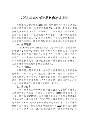 2024年党支部党员教育培训计划为持续深入学习贯彻XXX新时代中国特色社会主义思想,巩固主题教育成果,认真贯彻落实XX大精神,教育引导支部全体党员干部坚决捍卫两个确立,牢固树立四个意识、坚定四个自信、坚决做到两个维护,进一步加强支部党员干部教育培训工作,提升全体党员干部队伍的整体素质,结合支部工作实际,特制定2024年党员教育培训工作计划如下:一、指导思想以XXX新时代中国特色社会主义思想为指导,全面贯彻落实党的XX大精神,教育引导广大党员牢记党的宗旨,坚定理想信念,增强四个意识,坚定四个自信,做到两个维护,努力建设一支政治坚定、纪律严明、作风优良、廉洁务实的城管执法队伍,推动党建工作与城市管理工作相融合,以高质量党建引领城市管理高质量发展。二、工作目标持续巩固主题教育成果,始终坚持以强烈的政治责任感和使命感,对照学思想、强党性、重实践、建新功总要求,以学深悟透、实干笃行、务求实效的理念,立足城市管理工作实际,切实把学习成果转化为民办实事的实际成效,用实打实的举措解难题,推动城市管理再上新台阶。三、培训内容(一)开展XXX新时代中国特色社会主义思想学习教育。坚持读原著、学原文、悟原理,巩固学习《XXX著作选读》第一卷、第二卷《XXX新时代中国特色社会主义思想专题摘编》《党的XX大辅导读本》《党的XX大辅导百问》《论党的自我革命》《XXX关于关于调查研究论述摘编》等,要在学懂弄通做实上下功夫,切实把思想和行动统一到XXX新时代中国特色社会主义思想上来,通过认真研读原文,领会精神实质,理论联系实际,让学习入脑入心,保证党建工作要求的落实。(二)认真学习党章党规。深入学习《中国共产党章程》《党支部工作条例》《党和国家机关基层组织工作条例》,深入学习党章的基本内容,准确把握党章对党的性质、宗旨、指导思想、奋斗纲领作出的明确规定,把党章要求落实到各项工作和党的建设全过程。通过学习,深化宗旨意识,坚定共产党员的理想信念,发挥党员的先锋模范作用,以党员的先进性带领身边的干部群众,形成良好的工作氛围,推动城市管理工作健康有序发展。(三)开展XXX法治思想学习教育培训。深入学习XXX法治思想的基本精神、核心要义,牢牢把握全面依法治国政治方向、重要地位、工作布局、重点任务、重大关系、重要保障,把XXX法治思想贯彻落实到城市管理工作全过程。通过深入学习《宪法》《XXX关于全面依法治国论述摘编》,学习XXX《推进全面依法治国,发挥法治在国家治理体系和治理能力现代化中的积极作用》《充分认识颁布实施民法典重大意义依法更好保障人民合法权益》《论坚持全面依法治国》《法治社会建设实施纲要(2020-2025年)》《中华人民共和国民法典》等内容,强化执法为民理念,以严格规范公正文明执法的实际行动取信于民,让群众有更多、更直接、更实在的获得感、幸福感、安全感。(四)认真学习《关于新形势下党内政治生活若干准则》《中国共产党廉洁自律准则》《中国共产党党内监督条例》《中国共产党纪律处分条例》等党规,以《准则》《条例》的精神严格要求党员领导干部,引导党员干部端正党风学风政风,保守秘密,提高工作能力,勇于创新,积极高效地开展好各项城市管理工作。(五)抓好网络学习、在线学习。利用共产党员网、安徽先锋网、学习强国APP等平台开展网络在线培训,充分运用网络资源充实党员干部教育培训内容,有效弥补干部教育培训局限性。(六)认真完成上级部门调训任务。积极主动配合上级党组织的各级各类培训活动,保质保量完成培训任务,确保培训人数、参训率、学时数等各项内容升级达标。(七)学习城市管理工作相关业务知识和法律法规。四、培训方式(一)抓好党员经常性教育培训。严格坚持三会一课制度、主题党日活动,切实抓好党员日常培训学习,根据阶段性工作撰写学习心得。支部确保做到每季度至少召开1次党员大会、每月召开1次支委会,每季上1次党课。(二)抓好入党积极分子的培训。组织入党积极分子参加支部各项活动,学习党章和党的基本理论、基本路线、基本纲领、基本经验、基本要求等,加深其对党的认识和了解,帮助他们自觉改造主观世界和提升精神境界,为早日加入党组织打好思想和理论基础。(三)组织党员开展爱国主义教育、警示教育、廉政教育在七一前夕表彰一批优秀党员和先进基层党支部,组织新党员宣誓。(四)丰富党日活动。坚持把理论学习作为主题党日活动规定动作,紧扣支部工作实际、传统节日、阶段任务、志愿服务等方面,高标准谋划自选动作。四、工作要求(一)强化组织领导。支部书记要认真履行党员教育培训工作第一责任人职责,要认真组织严格要求,带动学习,发扬学习表率作用,按照党员教育培训计划,加强领导、稳步推进、狠抓落实。(二)坚持常抓不懈。要把党员教育培训工作抓在日常、落在平常,通过经常抓、抓日常,及时