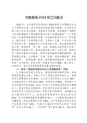 市教育局2024年工作要点2024年,全市教育系统坚持以XXX新时代中国特色社会主义思想为引领,深入贯彻落实党的XX大精神,全面落实市委十届七次全会及国家、省教育工作部署,紧紧围绕12991工作思路【坚持建设教育强市办好人民满意教育一个目标;突出全面提高教育教学质量、加快推进教育现代化两项重点;强力推进党建领航工程、立德树人工程、中小学幼儿园扩容提质工程、基础教育公平优质均衡工程、职业教育提质培优工程、高等教育双一流工程、教师队伍素质提升工程、教育数字化赋能工程、教育治理创新工程九项工程;持续深化新时代教育评价改革、新时代教育督导体制机制改革、教育集团化改革、义务教育双减改革、招生机制改革、课堂教学改革、县管校聘改革、教师激励机制改革、协同共育改革九项改革;努力办好一批教育民生实事】,凝心聚力、务实笃行,奋力开创XX教育高质量发展新局面。 一、坚持建设教育强市办好人民满意教育目标 1.全面完成年度工作任务。围绕建设教育强市目标,加快推进教育事业发展。学前三年毛入园率达到94.5%以上,普惠性幼儿园覆盖率达到89%,公办幼儿园在园幼儿占比达58%。义务教育阶段入学率保持100%、巩固率达到98%,原建档立卡学生巩固率达到100%,随迁子女在公办学校就读比例达到90%以上,特色学校达到250所,农村优质学校达到140所。高中阶段教育毛入学率达到94%,特色学校达到40所,普通高中招生人数达到9.5万人,就读优质普通高中在校生比例达到65%。全市新增特殊教育资源教室30个。义务教育课后服务学校覆盖率、学生有意愿参与率100%。全市中等职业学校办学条件达标率不低于80%。评选认定XX市中等职业学校双师型名师工作室10个、双师型骨干教师100名。推动高等教育内涵发展,评选认定市级高水平专业5个。 2.健全教育发展保障体系。加大财政教育经费投入,严格落实各学段教育生均拨款制度和教育专项投入政策,确保实现两个只增不减,全年教育经费投入达到294.4亿元。落实《河北省内部审计规定》要求,推进内部审计全覆盖,强化审计监督效能。建立完善开放灵活的教师补充机制,新招聘补充教师3000人以上。 3.提升教育系统作风效能。深入开展四下基层活动,充分发挥市、县两级驻校干部作用,指导督促基层薄弱学校有效处置负面舆情,将问题矛盾化解在基层一线,全面提升学校管理水平。结合周末XX专家行活动,持续办好XX教育大讲堂,营造不求所有、但求所用学习氛围。 4.实施精准考核奖惩。修订对县(市、区)、市直学校考核办法,健全完善科学精准考核体系,强化过程性考核,用考核数据引领教育各项工作争第一、创唯一。同时,做好对外宣传、信息公开、议案办理、督查调研工作,加强离退休干部和关心下一代工作,推动保密、档案、后勤、捐资助教、全面深化改革等各项工作。 二、突出两项重点工作 (一)全面提高教育教学质量 5.坚持科学教育质量观。实施课程教学深化行动,开齐开足国家规定课程,引导学校构建多样化有特色课程体系。加强考试命题研究,做好教考衔接。推进教育科研转型,构建研教、研学、研评、研考一体化教研体系。实施1+X学科教研课程,促进学科教研由活动化向课程化转变。深化网络教研,各学段各学科全年网络教研不少于150次。深化与北京海淀区、天津南开区等地互动交流,构建区域教研新样态。 6.加强教育质量监测与发展研究。组织实施国家义务教育质量监测,做好区域内学业质量监测,开展质量评估监测专项培训,争创河北省义务教育质量监测试点单位。建设一批教育发展研究基地,围绕教育高质量发展等重大问题,开展战略性、前瞻性、全局性研究,推动调研成果转化,为科学决策提供支撑。 (二)加快推进教育现代化 7.优质普惠发展学前教育和特殊教育。建立乡(镇)村共同发展机制,每个乡(镇)至少创建1所公办中心园为农村示范性幼儿园。优化普惠性学前教育资源布局与结构,创建游戏教育实验区和游戏教育实验园。创建5所省级示范性幼儿园,10所城市一类幼儿园,15所农村示范性幼儿园。实施特殊教育普惠融合行动,推进普通学校特殊教育资源教室建设。做好适龄残疾儿童少年义务教育阶段教育安置工作,提高送教上门工作质量。 8.优质均衡发展义务教育。优化县域义务教育资源配置,办好一批家门口优质学校。以学校标准化建设为统领,加强乡村小规模学校和乡镇寄宿制学校建设。以推进城乡教育一体化为重点,深入开展优质学校与农村薄弱学校对口帮扶和结对帮扶。评选30所农村优质学校和50所特色学校。 9.优质特色发展普通高中。有序扩大优质高中招生规模,创建10所普通高中特色学校。深入开展省级示范性高中和高等院校对口帮扶县中计划,带动提升全市县中整体办学水平。探索实施县域内普通高中集团化建设,持续扩大优质教育资源供给。