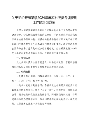 关于组织开展某镇2024年度农村党员冬训春训工作的培训方案为深入学习贯彻习近平新时代中国特色社会主义思想和党的XX大精神,切实加强农村党员队伍建设,不断提升农村基层党组织政治功能和组织功能,根据中共歙县县委组织部《关于组织开展2024年度农村党员冬训春训工作的通知》要求,决定利用农村农闲和外出务工党员集中返乡的有利时机,组织开展某镇2024年度全县农村党员冬训春训工作,现将培训工作安排如下:一、参训人员此次参训人员为全体农村党员,引导流动党员、农村新经济组织和新社会组织中的党员积极参与此次培训活动。二、时间安排一是镇级集中学习:2024年3月6日,为期一天。上午:8:00-11:30;下午:2:00-5:00。二是各村党组织集体学习:各基层党支部要落实抓党员日常教育工作的直接责任,结合三会一课、主题党日、组织生活会等,经常性组织党员开展集体学习。同时围绕组织建设、作风建设和为民办实事等方面,结合2023年群众反映的热点、难点问题,以书面方式开展一次党员公开承诺。同时要注重发挥先锋系列平台作用,利用先锋网、远程教育平台、直播大讲堂等平台载体,扩大教育培训覆盖面。针对少数流动党员以及年老体弱、行动不便、患病失能党员的实际情况,采取送学寄学、结对促学、网络共学等方式开展教育培训,给予关心照顾,提升教育质效。三、课程设置围绕理论学习、政策宣讲、党性教育、普法教育、榜样学习技能培训6个方面科学设置课程,贴合实际、突出实用、注重实效具体课程附后。(一)理论学习方面。深入学习贯彻习近平新时代中国特色社会主义思想、党的XX大精神,认真学习习近平总书记关于三农工作的重要论述和关于安徽工作的重要讲话重要指示精神,学习贯彻省委十一届五次、六次全会精神、省两会精神,进一步统一思想、明确方向、凝聚共识。(二)政策宣讲方面。宣讲实施乡村振兴战略、千村引领万村升级工程、推进农业农村现代化、学习贯彻《中国共产党农村工作条例》等重大政策内容,讲解我县推进党建引领信用村工作的重要意义、惠民举措、相关要求,宣传农村低保、惠农补贴、农村医疗救助等方面惠农政策。(三)党性教育方面。扎实开展党性教育,学习贯彻《中国共产党章程》《中国共产党党员教育管理工作条例》等党内法规巩固拓展主题教育成果,培育良好思想作风、工作作风和生活作风。深入开展革命传统教育,引导党员学习党史、新中国史、改革开放史、社会主义发展史和中华民族发展史,传承红色基因。(四)普法教育方面。助力农村法治建设,解读、宣传宪法民法典等重要法律,宣讲村民自治、土地流转、森林保护、环境整治、维护稳定等与农业农村农民联系紧密的法律法规,开展农村普法教育,增强农民的法制观念,提高农民依法行使权利和履行义务的自觉性。(五)榜样学习方面。结合学习身边榜样系列活动,邀请各级党组织已表彰的先进典型和主题教育开展以来涌现出的先进人物,就近到农村党员中开展理论宣讲和工作经验介绍。引导基层党组织结合三会一课、主题党日等活动,组织党员认真学习身边榜样先进事迹。(六)技能培训方面。围绕推进农业农村现代化,有针对性地开设增收致富培训课程,重点培训农村种植养殖、特色农业开发、产业化经营、农村电子商务、劳务技能等方面的内容,帮助农村党员掌握实用技能,增强发展后劲。四、培训要求教育引导农村党员用习近平新时代中国特色社会主义思想凝心铸魂,真抓实干、开拓奋进,积极投身农村改革、基层治理、乡村振兴的伟大实践,为加快建设高气质现代化文化旅游名城作出贡献。1.强化责任意识。各党(总)支部要落实党员日常教育工作的主体责任,全体党员要认真参加培训,要把参加冬训春训培训作为提升自身综合素质、提高自身服务水平的重要途径。2.注重学用结合。注重整体推进,要将农村党员冬训春训与党员常年培训相结合,与开展党内组织生活相结合;将理论学习与实用技术学习相结合;将党员能力提高与服务群众相结合,强化宗旨意识。3.遵守培训纪律。参训人员要按时达到培训场所,不得迟到早退,严格遵守培训时间,进入培训会场后,不得随意走动,不得擅自离开培训场所。本文密:档编辑码gwsx2024