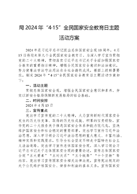 局2024年4·15全民国家安全教育日主题活动方案2024年是习近平总书记提出总体国家安全观10周年,4月15日将迎来第九个全民国家安全教育日。为深入学习宣传贯彻党的二十大精神,贯彻落实习近平总书记关于全面加强国家安全教育的重要指示精神,增强全民国家安全意识和法治意识,努力使尊法学法守法用法在全社会蔚然成风,根据上级部署要求,制定2024年4·15全民国家安全教育日主题活动方案如下:一、活动主题贯彻总体国家安全观,增强全民国家安全意识和素养,夯实以新安全格局保障新发展格局的社会基础。二、时间安排2024年4月15日三、宣传重点突出学习宣传党的二十大精神,大力宣传新时代国家安全发生的历史性变革、取得的历史性成就、积累的宝贵经验,宣传党的二十大报告关于推进国家安全体系和能力现代化、坚决维护国家安全和社会稳定的重要部署。突出学习宣传习近平法治思想,深入学习领会习近平法治思想的重大意义、丰富内涵、精神实质和实践要求,引导全社会坚定不移走中国特色社会主义法治道路。突出学习宣传总体国家安全观,深入学习领会习近平总书记关于总体国家安全观的重要论述,宣传总体国家安全观五大要素五对关系五个统筹十个坚持等内容。突出学习宣传国家安全相关法律法规,宣传宪法规定的关于公民维护祖国安全、荣誉和利益的基本义务,宣传国家安全法、反分裂国家法、国防法、反恐怖主义法、反间谍法、数据安全法、生物安全法、网络安全法等,宣传刑法关于危害国家安全犯罪的规定。四、工作安排(一)组织开展社会面宣传。结合实际,紧紧围绕活动主题和重点内容,组织开展有特色、接地气的普法宣传活动,广泛开展群众性法治文化活动,推动国家安全相关法律法规进农村、进社区、进校园、进机关、进企业、进军营、进网络,筑牢依法维护国家安全的人民防线。(二)组织开展集中宣传。在全民国家安全教育日当天,利用国家安全教育馆等法治宣传教育阵地、各类媒体平台和各级普法讲师团,举办国家安全主题展览、法治讲座、法治文艺汇演等形式多样的集中示范活动,吸引广大群众深度参与,发布国家安全普法宣传片、海报、公益广告等,营造依法维护国家安全的强大声势。(三)组织开展网络宣传。充分利用微信公众号、微博、客户端等,采用短视频、微动漫、网络直播等群众喜闻乐见的方式,宣传普及国家安全相关法律法规。将司法部、全国普法办设计制作的全民国家安全教育日宣传挂图,利用各单位大屏幕进行循环播放宣传,营造依法维护国家安全的浓厚氛围。(四)组织开展重点对象宣传。推动各级领导干部学习掌握国家安全法律知识,通过党委(党组)理论学习中心组学习等形式,提高领导干部法治思维能力、统筹发展和安全的能力。联合教育、共青团等部门,充分发挥中小学法治副校长作用,通过讲授国家安全法治课、举办辩论赛和主题征文等活动,教育引导青少年增强国家安全意识和法治意识。(五)组织开展以案普法。全面落实谁执法谁普法普法责任制,落实法官、检察官、行政复议人员、行政执法人员、律师等以案释法制度和典型案例发布制度,对发布的国家安全相关典型案例进行深入剖析,让社会公众知晓哪些是危害国家安全的行为、应当承担什么样的法律责任、怎样依法维护国家安全,让典型案例公布的过程成为全民普法的公开课。五、工作要求(一)提高政治站位。把组织开展好2024年全民国家安全教育日普法宣传活动作为重点任务,列入重要日程。要牢牢把握正确政治方向和舆论导向,严格落实意识形态工作责任制,全面准确宣传解读国家安全相关法律法规,防止错误思想言论传播。(二)加强组织领导。要组织开展好2024年全民国家安全教育日普法宣传活动,并将其列入重要日程,精心组织,周密策划,全面规范使用全民国家安全教育日活动标识,切实增强普法针对性和实效性,力戒形式主义,确保各项任务落地落实。(三)创新方式手段。在充分利用传统有效的普法方式基础上,注重运用新媒体新技术,强化互动化传播、沉浸式体验,让正能量产生大流量。善于运用群众乐于参与、便于参与的方式,调动广大群众积极性,让老百姓对国家安全法律知识听得懂、记得住、用得上。