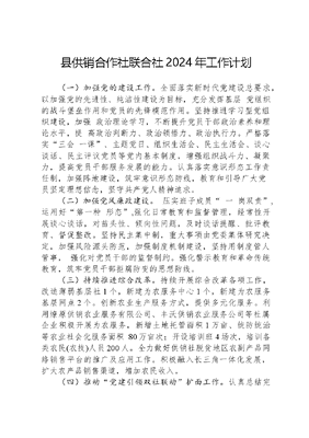 县供销合作社联合社2024年工作计划(一)加强党的建设工作。全面落实新时代党建设总要求,以加强党的先进性、纯洁性建设为目标,充分发挥基层 党组织的战斗堡垒作用和党员的先锋模范作用。坚持推进学习型党组织建设,加强 政治理论学习,不断提升党员干部政治素养和理论水平,提 高政治判断力、政治领悟力、政治执行力。严格落实三会 一课、主题党日、组织生活会、民主生活会、谈心谈话、民主评议党员等党内基本制度,增强组织战斗力、凝聚力,提高党员干部服务发展的能力。认真落实意识形态工作责任制,加强阵地建设,筑牢意识形态防线,教育和引导广大党 员坚定理想信念,坚守共产党人精神追求。(二)加强党风廉政建设。 压实班子成员 一 岗双责,运用好第一种 形态,强化日常教育和监督管理,经常性开展谈心谈话,对苗头性、倾向性问题,及时谈话提醒、批评教育、督促整改。坚持民主集中制,重大事项由党委集体研究决定,加强风险源头防范,加强制度机制建设,坚持用制度管人管事, 强化对党员干部的监督制约。强化警示教育和革命传统教育,筑牢党员干部拒腐防变的思想防线。(三)持续推进综合改革。持续开展综合改革各项工作,改造薄弱基层社1个,新建为农服务中心1个,新建为农服务基层网点2个。创新农业生产服务方式,提供多元化服务。利用燎原供销农业服务有限公司、丰沃供销农业服务公司等社属企业积极开展为农服务,新增土地托管面积1万亩、统防统治等农业社会化服务面积 80万亩次;开设培训班4场次,培训各类农民(农技)人员200人。全力做好供销社脱贫地区农副产品网络销售平台的推广及应用工作。积极融入长三角一体化发展,扩大农产品销售渠道,增加农民收入。(四)推动党建引领双社联动扩面工作。认真总结完善XX县坎山供销合作社有限公司试点工作,严格落实《六安市供销社开展党建引领双社联动试点工作方案》,认真宣传开展党建引领双社联动工作的重要意义、主要目的、方法步骤,加强与各乡镇党委政府沟通协调,做好试点成熟经验复制扩面工作。(五)精心管理社有资产。对县社属企业的资产进行登记,全面摸清供销系统资产基本情况。对社属资产现状、数量、租赁情况、产生的效益等状况进行核实,建立资产管理档案。对闲置资产的产生要分析原因,提出盘活建议,让基层社资产应租尽租,增加基层社收益。(六)主动抓好对口合作工作。主动到金山区考察,推动与金山区供销社签订对口合作框架协议,在金山区设立XX供销特色农产品展馆,组织832平台农产品生产企业到金山区推介产品,组织编制XX县供销社农产品仓储保鲜冷链物流体系建设项目,邀请金山区有关企业到XX实地考察,组织相关企业参加长三角名优特农产品展销会。(七)切实抓好信访稳定。压实信访包保责任,加强与各部门的沟通协调,及时发现涉及本系统的矛盾隐患。抓好常态化信访维稳工作,特别是把重要节日、大型会议及重要活动期间的信访工作作为为重点紧抓不放,严控进京赴省去市、越级上访和群体上访事件的发生。(八)助力乡村振兴工作。继续选派2名机关工作人员到帮扶村参加乡村振兴工作,抽调10名机关干部职工参加帮扶工作;帮助脱贫困村制定年度产业发展规划,安排支持产业发展资金;对脱困户定期开展入户走访,帮助解决实际困难,防患返贫;帮助解决脱困户适龄人员就业,增加收入。