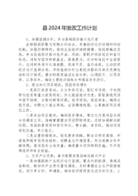 县2024年发改工作计划1、加强监测分析,争当县域经济振兴先行者坚持预测预警与定期分析结合,完善经济运行机制和约谈机制,加强形势研判,推动全县经济持续健康、追赶跨越式发展,争当县域经济振兴先行者。同时,紧盯沪苏浙地区和省内先进,对标宁国市和新昌县,聚焦聚力,在对标追赶中全面提升,在对标先进中认清差距、找准不足、奋力追赶。主动抓好经济运行监测分析,序时监测分析主要经济指标及相关支撑性指标运行情况,重点时段实施日比日分析,以周保月、以月保季、以季保年,确保主要经济指标全市排名争先进位。2、突出加大项目建设,促投资保增长一是紧盯政策导向,全力争取项目。紧盯专项债、中央预算内投资等重大政策利好,加大跑省跑市力度。紧紧围绕项目申报可持续、全面均衡等问题,有序谋划,提前准备,确保应报尽报。对照九个重点领域,全面摸排梳理,认真做好项目谋划工作。二是突出项目载体,确保投资增速。常态化开展项目分级分类调度工作,准确掌握重点项目即时进度,及时协调解决新问题,包保的县领导和责任单位,带头跑、亲自盯,推动项目顺利实施、早日竣工。三是注重协调服务,强化要素保障。配合自然资源局、环保局积极争取用地指标、保障生态环境要素,努力破解占补平衡难题,盘活现有土地存量,确保重大项目顺利实施,尽早发挥经济和社会效益。 3、立足产业优势,着力集聚发展战略性新兴产业一是加强战新产业经济运行监测。重点对新能源、高端装备制造、新材料产业进行量化调度,及时掌握企业生产经营情况,进行早分析、早调度,确保按序时进度完成目标任务。二是继续做好战新企业增量培育工作。及时帮扶指导优质企业申报纳入省统计范畴,推进战略性新兴产业均衡发展,积极与上级部门对接,做好战新企业库调整。4、协调推进融入长三角一体化发展工作一是做好剩余项目推进情况的跟进;积极争取各类资金,做好2024年长三角一体化中央预算内投资项目申报工作。二是持续推动黑扎营大桥等重大基础设施互联互通项目的前期工作,力争早日开工建设,进一步提升功能区的交通互联水平。三是密切关注提请设立顶山-汊河省际毗邻地区新型功能区产业集中区,纳入安徽XX经济开发区规划范围,统一管理事项,及时掌握上级部门批复情况。5、突出绿色低碳,加快能源利用和生产方式转变一是全力做好能耗双控和能源保供工作。加强能耗双控形势监测分析研判,有保有压,坚决遏制两高项目盲目发展,推动我县新能源、绿色低碳等相关产业加快发展。二是加强固定资产项目节能审查。深入开展重点领域能效提升行动,进一步提高能源利用效率。三是加强绿色低碳宣传,组织开展全国低碳日等宣传活动。四是持续做好皖东北天然气管道等项目建设工作,确保项目早日建成投运。五是坚持绿色发展理念,有序推进碳达峰碳中和工作。6、继续加强价格管理,规范收费行为切实落实好法律法规和收费政策,及时落实上级关于取消降低、减免收费的文件,做好水电气不合理收费的清理工作,确保企业有一个良好的价费环境。7、持续强化招投标项目监管,净化公共资源交易营商环境一是加大标后监督检查的力度,联动相关部门做好部门内自查自纠;及时约谈、处理标后发现的问题。400万元及以上工程100%检查,60—400万元项目抽查率不低于30%;开展至少2次联动标后监督检查。二是加强开评标过程管理,提高招标评标质量,维护公共资源交易领域公平公正良好环境,保障招标项目顺利推进实施。8、继续做好粮食流通监督检查、仓储、调控工作积极做好2024年度粮食产、购调查,开展粮食收购指导、服务、监督、协调职能,力争收购最低价粮4万吨、市场粮6万吨;加强地方储备粮日常监管,严格按照县政府储备粮管理办法要求进行管理,保障地方粮食安全;计划完成粮油加工产值34.8亿元,促进XX粮食产业经济再上新台阶;全面完成雷官中心库迁建项目建设,增加全县粮食收储能力。9、突出生产扶持项目建设,促进移民增收致富2024年围绕产业扶持和基础设施两个方面做好移民项目谋划实施。计划2024年全年谋划移民项目26个,生产开发项目5个,生产开发项目投资3170万元,生产开发扶持项目投资比重达到45%。10、持续推进社会信用体系建设健全完善信用工作体制机制;加强信用信息归集和共享、及时准确上报行政处罚、行政许可、行政确认等各类信用信息;加强信用监管、推广信用承诺制;大力推广信用报告代替无违法违规证明;加强诚信宣传教育和诚信结果应用工作。