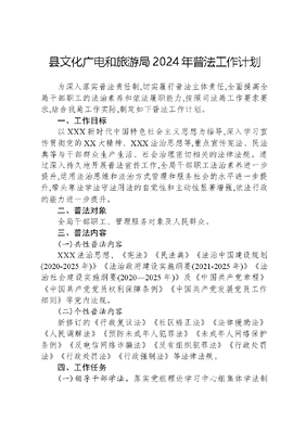 县文化广电和旅游局2024年普法工作计划为深入落实普法责任制,切实履行普法主体责任,全面提高全局干部职工的法治素养和依法履职能力,按照司法局工作要求要求,结合我局工作实际,制定如下普法工作计划。一、工作目标以XXX新时代中国特色社会主义思想为指导,深入学习宣传贯彻党的XX大精神、XXX法治思想等,重点宣传宪法、民法典等与干部群众生产生活、社会治理密切相关的法律法规。通过深入持久地开展普法宣传工作,全局干部职工法治素养进一步提升,运用法治思维和法治方式管理和服务社会的水平进一步提升,带头尊法学法守法用法的自觉性和主动性显著增强,依法行政的能力进一步提升。二、普法对象全局干部职工、管理服务对象及人民群众。三、普法内容(一)共性普法内容XXX法治思想、《宪法》《民法典》《法治中国建设规划(2020-2025年)》《法治政府建设实施纲要(2021-2025年)》《法治社会建设实施纲要(2020—2025年)》及《中国共产党章程》《中国共产党党员权利保障条例》《中国共产党发展党员工作细则》等党内法规。(二)个性普法内容新修订的《行政复议法》《社区矫正法》《法律援助法》《人民调解法》《预防未成年人犯罪法》《未成年人网络保护条例》《反电信网络诈骗法》《反有组织犯罪法》《行政处罚法》《行政处罚法》《行政强制法》等法律法规。四、工作任务(一)领导干部学法。落实党组理论学习中心组集体学法制度,通过中心组学习、会前学法、专题培训班等,组织领导干部深入学习XXX新时代中国特色社会主义思想、XXX法治思想以及中央和省、州关于加强法治建设、推进治理体系和治理能力现代化的重大部署,深入学习宪法、民法典和其他基本法律,学习党章等党内法规、公共法律知识以及分管领域相关法律法规,提高运用法治思维和法治方式深化改革、推动发展、化解矛盾、维护稳定、应对风险的能力。(二)工作人员学法。落实国家工作人员日常学法制度,严格落实会前必学法,通过集体学习、个人自学等形式,组织工作人员深入学习XXX法治思想、宪法、民法典和其他基本法律,学习公共法律知识以及与履行职责相关的法律法规、政策规定等。以党章、准则和条例为重点,深入学习和宣传党内法规,教育引导全体党员尊崇党章、遵守党章、贯彻党章和维护党章,切实把党章各项规定要求落实到行动上体现在工作中。把学习掌握党内法规作为合格党员的基本要求,列入党支部三会一课内容,促进党内法规学习宣传常态化、制度化。(三)面向社会公众普法。结合八五普法工作,广泛宣传宪法,弘扬宪法精神,树立宪法权威;深入宣传与群众生产生活、社会治理密切相关的法律法规,继续落实扫黑除恶、命案防控、反有组织犯罪、未成年人保护等专项宣传,积极引导社会公众尊法学法守法用法,提高法治意识,增强法治观念。(四)抓好节点普法1.开展国家宪法日集中宣传。抓住12·4国家宪法日、宪法宣传周等节点时机,组织开展形式多样的集中宣传活动,在全社会营造尊崇宪法、学习宪法、遵守宪法、维护宪法、运用宪法的浓厚氛围。2.开展民法典宣传月集中宣传。组织普法志愿者开展民法典线下宣讲和辅导。发挥报、网、端、微、屏作用,让民法典宣传天天见、处处见,推动民法典融入日常生活、融入基层治理、融入法治实践,让民法典走到群众身边、走进群众心里。3.开展3·156·26等相关节点集中宣传。利用好各行业领域重大活动、重要法律法规颁布实施及纪念日等节点,局机关各科室结合科室职能职责,落实普法责任制,大力促进普法与服务有机融合。通过主题集中宣传、以案释法、视频展播等形式,加大普法宣传力度,提高相关法律法规社会知晓率,形成大普法格局。(五)创新普法载体。大力开展新媒体普法,充分利用抖音、微信公众号等载体平台,大力宣传与我局工作相关的法律法规和政策知识,营造尊法学法守法用法的良好氛围;五、工作要求(一)提高思想认识。各科室要高度重视学法普法工作,将其作为贯彻落实XXX法治思想、推进法治建设的重要任务,摆上突出位置,与业务工作同部署、同落实,确保各项工作任务落到实处。(二)压实工作责任。各科室要对照本计划,建立工作台账,明确时间进度、重点内容、工作要求和责任分工,分步有序组织实施。(三)注重资料报送。各科室要加强法治宣传教育工作资料的收集、归档,开展工作的图片、简报等相关资料及时报送局办公室。(四)强化督导宣传。局办公室要加强工作督导,要广泛宣传学法普法的先进典型、经验做法,激励引导全局干部职工争当学法普法标兵,营造浓厚法治氛围。