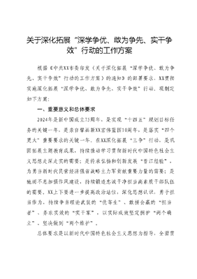 关于深化拓展深学争优、敢为争先、实干争效行动的工作方案根据《中共XX市委印发〈关于深化拓展深学争优、敢为争先、实干争效行动的工作方案〉的通知》的部署要求,XX贯彻实施深化拓展深学争优、敢为争先、实干争效行动。现制定如下方案:一、重要意义和总体要求2024年是新中国成立75周年,是实现十四五规划目标任务的关键一年,是亲自擘画新XX宏伟蓝图10周年,是落实四个更大重要要求的关键一年。在XX深化拓展三争行动,是巩固拓展主题教育成果,持续推动学习贯彻新时代中国特色社会主义思想走深走实的需要;是传承弘扬和创新发展晋江经验,为勇当新时代民营经济强省战略主力军贡献重要力量的需要;是驰而不息加强作风建设,持续锻造忠诚干净担当高素质干部队伍的需要。XX上下要进一步提高政治站位,深化思想认识,勇于担当作为,持续争当理论武装的优等生、敢拼会赢的担当者、务求实效的实干家,以实际成效坚定拥护两个确立、坚决做到两个维护。总体要求是以新时代中国特色社会主义思想为指导,全面贯彻党的XX大、二十届二中全会和中央经济工作会议精神,认真落实省委十一届三次、四次、五次全会和省委经济工作会议部署,按照市委十三届四次、五次、六次全会及市委经济工作会议要求坚持稳中求进、以进促稳、先立后破,完整、准确、全面贯彻新发展理念,围绕推动高质量发展首要任务和构建新发展格局战略任务,传承弘扬、创新发展晋江经验,坚持政治忠诚导向、改革创新导向和求实求效导向相统一,坚持高质量建设XX,融入建设海峡两岸融合发展示范区,大抓产业、大抓招商、大抓项目大抓服务、大抓落实,奋力推进XX高质量发展行稳致远。二、主要内容(一)在深学争优中提升标杆。在巩固拓展主题教育成果的基础上,把学懂弄通做实新时代中国特色社会主义思想贯穿始终筑牢坚定拥护两个确立、坚决做到两个维护的思想根基要持续跟进学,严格落实第一议题制度,及时跟进学习最新重要讲话重要指示批示精神,深刻学习领会对XX、对XX工作重要讲话重要指示精神的明确要求和殷切期望,深挖理论和实践富矿。要融会贯通学,围绕XX等专题,夯实年轻干部业务基础和专业技能,着力锻造一支讲政治、敢担当、精业务、善创新的干部队伍。要结合实际学,深刻领会新思想六个必须坚持的世界观和方法论,运用好贯穿其中的立场观点方法,以更加宽广的眼界谋划发展,以积极主动的精神改革创新,自觉用党的创新理论指导解决实践遇到的新问题、人民群众急难愁盼的问题、党的建设面临的突出问题,切实把学习成果转化为推动工作的实效。(二)在敢为争先中树立典范。大力发扬敢为人先、爱拼会赢的开拓创新精神,高位寻标、精准对标、勇于创标,积极向上争取资源、争取政策、争取条件,力争实现新的更大突破。要敢于攻坚,坚持大拼经济、大抓发展,在突破重点难点堵点上奋力争先。要敢于创新,开拓思维、纵深推进,实现质的有效提升和量的合理增长。(三)在实干争效中深化推进。要大力弘扬四下基层马上就办、真抓实干等优良作风,树立和践行正确政绩观,坚持问题导向、目标导向,在全方位推动高质量发展中真抓实干务求实效。要在构建我市现代化产业体系中当先锋,助力打造先进制造业人才中心和创新高地。要大抓招商,更大力度抢抓高能级项目,打造新质生产力。要大抓项目,持续推进重点项目投产放量,推动XX等签约项目早开工、早投产,进一步提升全市产业能级。要大抓服务,聚焦群众所需、人才所想、企业所急、基层所盼,积极开展政企早午晚餐会,让企业群众获得感、幸福感更加充实。要大抓落实,策划推出一批重点专项工作作为抓手滚动实施、压茬推进,不折不扣抓落实、求真务实抓落实、敢作善为抓落实。三、工作要求(一)强化组织领导,压紧压实责任。建立专班推进机制,成立领导小组具体落实工作。各科室要高效协同、一体联动,班子成员要牵头协调各自分管领域的相关事宜。办公室作为行动实施牵头部门,负责做好统筹推进、综合协调、督促落实等工作;各重点专项工作责任单位要团结协作、密切配合、形成合力,研究制定具体工作落实措施,明确目标成效、重点举措、时间节点和责任分工,加强一体推动、节点推进,倒逼责任落实、落地见效。(二)强化调度考核,严明用人导向。将深化拓展深学争优、敢为争先、实干增效行动与XX高质量发展统筹起来,一体部署、一体推进、一体落实。要加大督导力度,在深化拓展三争行动中加强干部队伍建设,与干部考核评价使用结合起来,把行动开展情况和成效作为评优评先的重要参考,对成绩特别突出的干部给予重用,对工作不力的个人给予通报批评,确保行动取得实实在在成效,真正树立实干导向,弘扬务实作风。(三)强化正面宣传,营造浓厚氛围。要充分发挥公共领域宣传载体作用,利用重点区域、重点地段的LED屏、宣传栏等线下载体,结合微信公众号等线上渠道,积极