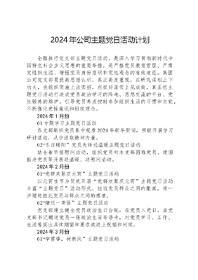 2024年公司主题党日活动计划全面推行党支部主题党日活动,是深入学习贯彻新时代中国特色社会主义思想的重要举措,是严格党员教育管理、严肃党组织生活、增强党员身份意识和党性观念的有效途径。集团公司党支部要提高思想认识,真正高度重视,在研究谋划上下功夫,在组织实施上出实招,在抓好落实上见成效,真正把主题党日活动打造成党员政治学习的阵地、思想交流的平台、党性锻炼的熔炉,引导党员养成按时参加组织生活的习惯和自觉,不断强化党性意识和组织观念。2024年1月份01专题学习主题党日活动各支部组织党员集中观看2024年新年贺词,积极开展学习研讨活动,从中汲取精神力量。02冬日暖阳党员先锋送温暖主题党日活动结合春节前慰问活动,组织党员对本支部困难党员、建国前老党员等开展送温暖、送慰问活动。2024年2月份01党群欢聚庆元宵主题党日活动以元宵佳节为契机开展党群欢聚庆元宵主题党日活动丰富主题党日活动形式,拉近党员群众之间的距离,进一步增进彼此党员与群众之间的感情。02赠送一寄语主题党日活动党支部建立健全党员政治生日台账,在党员入党日,由党支部书记赠送党员一张政治生日寄语卡,对党员学习、工作、生活等提出具体期望和要求或送上祝福和问候。2024年3月份01学雷锋,树新风主题党日活动增设学雷锋志愿服务岗,使每个党员在岗位上都能发挥先锋模范作用,展示良好的党员形象;组织党员走在前线,主动肩负起XX宣传、安全生产等工作;开展邻里互助、家政服务等接地气、顺民意的活动,进一步弘扬学习雷锋,推动学雷锋志愿服务活动常态化发展。02巾帼心向党主题党日活动组织支部巾帼党员重温入党誓词,使巾帼党员在学思践悟中坚守初心,为推动各支部事业高质量发展、助力通北发展贡献巾帼力量!2024年4月份01世界地球日、环保公益行主题党日活动每年的4月22日是世界地球日,是专为世界环境保护而设立的节日,为引导党员树立绿水青山就是金山银山和人与自然和谐共生发展理念,各党组织可广泛开展义务植树、保护水资源、防止空气污染、节能减排等主题活动,深入社区、公园、户外广场等广泛开展环保宣传教育,倡议党员增强节能环保意识,珍惜资源,保护我们共同的地球家园。02四微周末党课主题党日活动在党员中开展党史知识微朗读、微党课、微故事、微分享活动,通过互相交流加深对党的认识2024年5月份01劳动最光荣,党员在行动主题党日活动以五一劳动节为契机开展劳动最光荣,党员在行动主题党日活动,动员党员参与到劳动中,参与到志愿服务中,发挥发扬党组织战斗堡垒作用和党员先锋带头作用,树立榜样意识。02青春心向党,建功新时代主题党日活动五四精神的核心内容为爱国、进步、民主、科学,激励一代又一代青年同志不断努力进取,奉献自我。以新时代中国特色社会主义思想为指导,围绕五四精神,组织开展五四青年节系列主题活动,大力倡导爱国守法、民主科学、探索创新、明礼诚信等行为规范,推动积极的、进步的、自由的、创造的意识,外化于行,营造振人心、有活力、讲道德的浓厚氛围。2024年6月份01品味端午,传承文化主题党日活动通过开展品味端午,传承文化主题党日活动,组织党员把包好的粽子送给困难党员、困难群众、伤残军人或者留守儿童的家庭,让他们在感受到节日氛围的同时也感受到了党组织的关爱和关怀。02七一节前走访慰问主题党日活动开展七一走访慰问主题党日活动,走访慰问生活困难党员、老党员等,借助走访慰问契机,引导党员与走访慰问对象交流互动,回顾奋斗历程、传递组织关怀、凝聚发展合力。2024年7月份01永远跟党走主题党日活动结合七一建党节,以永远跟党走为主题,组织开展形式多样、内容丰富的群众性主题宣传教育活动,主要涉及党旗在基层一线高高飘扬活动入党宣誓活动讲党课和优秀党课展播活动学习体验活动主题宣讲活动青少年心向党教育活动各类群众性文化活动等方面。02参观红色教育基地,传承革命精神主题党日活动结合七一建党节,开展参观红色教育基地,传承革命精神主题党日活动,组织党支部前往通北历史陈列馆红色教育基地参观,接受党史党建教育熏陶和革命传统教育,进一步激发了党员的荣誉感、责任感和使命感。2024年8月份01弘扬八一精神观看红色影片主题党日活动通过观看红色影片,引导广大党员群众了解人民军队的良好品质、铁的纪律和过硬作风,继续学习和传承人民军队优良作风和光荣传统,加强各级党员干部的执行力和工作作风建设。02阅读红色经典主题党日活动组织党员在深入学习学习教育指定学习材料和重要参考材料的基础上,组织阅读马克思主义经典著作、党在不同历史时期的重要文献和党的革命精神谱系相关图书。各党组织针对普通党员不同特点,积极推荐红色读本,开展阅读红色经典读书会活