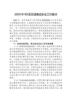 2024年XX区街道食品安全工作要点2024年,各街道要深入学习贯彻XXXXXX关于食品安全工作重要指示精神,认真落实食品安全工作的系列部署要求,落实《区委区政府关于深化改革加强食品安全工作的实施意见》,进一步深化分层分级精准防控末端发力终端见效工作机制,落实食品安全属地管理责任,聚焦创建国家食品安全示范城市目标,深化基层食安办星级建设,做好食品安全各项工作,全面提升区食品安全治理能力和水平,不断提高全区人民的获得感、幸福感、安全感,为建设现代化区域中心城市筑牢食品安全保障。一、坚持党政同责,落实食品安全工作决策部署(一)持续落实党政同责。贯彻《地方党政领导干部食品安全责任制规定》和区委区政府相关工作意见,压实压紧食品安全属地管理责任,完成各项食品安全工作任务,确保不发生重大食品安全事故。对食安委成员单位和社区进行绩效考核,年度综合考核权重不低于3%。将食品安全纳入街道年度重点工作,认真制订并实施街道年度食品安全工作计划。完善更新食品安全责任清单,相关责任人按照责任清单履行食品安全工作责任,研究部署食品安全重大事项,制定具体的贯彻落实措施,听取食品安全工作汇报、开展食品安全工作专题调研或专项检查,解决本街道食品安全实际问题。定期召开食安委会议和食安委成员单位联络员专题工作会议。各街道党工委、办事处要在6月20日及11月20日前向区委、区政府报告食品安全工作情况。(二)完善机制强化保障。对照无锡市地方标准《基层食安办建设等级评价》,完善各项工作机制。进一步加强组织和队伍建设,提升党政主要负责人担任食安委主任比例,及时调整食安委成员,推动辖区基层市场监管分局参与等级评定,增加食安办专兼职工作人员数量、根据常住人口规模配备相应的专兼职人员和足额的食品安全协管员、信息员,高中以上文化程度达85%以上。动态调整人员清单,加强人员培训,培训覆盖率100%,线上培训占比50%以上。定期对人员开展考核与激励,年度考核覆盖率达到100%、合格率达到100%。食品安全工作经费列入街道办事处经费保障范围,确保保障金额按辖区常住人口计算不低于2元/人。(三)完成示范创建任务。全面落实国家食品安全示范城市创建工作要求,完成省级食品安全示范区跟踪评价任务。细化分解目标任务,切实加大投入,强化氛围营造,督促本辖区食品生产经营单位对标自查、根据创建评分要求开展相关类型单位检查,对存在的所有问题,采取针对性措施抓紧整治,确保逐一整改到位。把创建工作作为提升属地食品安全整体工作水平的重要抓手,确保完成创建工作既定目标。全面落实基层食品安全网络建设示范引领行动要求,对照创建评价细则做好基层食安办迎检准备,加强街道食安办星级建设,争取全区街道食安办85%以上达到三星级标准,2个以上街道食安办达到四星级以上标准。二、坚持预防为主,加强食品安全隐患排查整治(一)夯实基础动态管理。辖区食品生产经营单位主体信息在数字食安和食品安全属地管理责任平台中入库率达到100%,并实现动态调整,及时清理本辖区吊销、注销等经营异常市场主体信息,在食品安全属地管理责任平台及时标停相关单位。制定食品安全风险隐患排查计划,应用无锡市数字食安平台协助监管部门开展安全巡查和隐患排查,规范记录、处理现场巡查情况,排查覆盖率达到100%,并努力提高问题隐患发现率、及时督促完成整改。进一步提高街道在全市高质量监测指标食品安全水平中排名。(二)强化联动整治实效。加强无证小作坊及餐饮单位、单位食堂情况摸排,对摸排的未登记单位实施销号管理,确保文可居文库——海量学习资料,手机电脑均可下载www.wenkeju.com闭环处置,及时取缔未备案流动摊贩;协助监管部门开展食品小作坊、小餐饮、食品摊贩和小食杂店管理工作。组织或配合开展食品安全专项整治行动,组织开展联合执法,治理一批辖区食品安全突出问题,并取得成效提供实际案例。(三)深化包保工作落实。街道食安办要持续贯彻落实三清单+一承诺书制度和四项工作制度,规范两员配备,依托无锡市食品安全两个责任网络培训平台对包保干部、食品安全管理人员和食品生产经营主体分别开展落实属地责任培训和主体责任培训,培训覆盖率达100%。各级包保干部照单履职开展督导,每季度对所有的包保主体开展1次包保督导,并对发现问题进行闭环处置。同时,指导企业制定《食品安全风险管控清单》,将日管控、周排查、月调度工作制度机制深度嵌入企业日常管理,实现属地管理责任与企业主体责任两个工作机制相互衔接、贯通运行。三、坚持问题导向,提升食品安全综合治理能力(一)突出重点问题治理。结合国家食品安全示范城市创建,强化相关点位巡查督导和问题闭环整改。深化源头至餐桌全链条食品安全监管,持续开展重点品种食品添加剂超范围、超限量和非食用物质添加问题治理,开展校园食品安全排查整