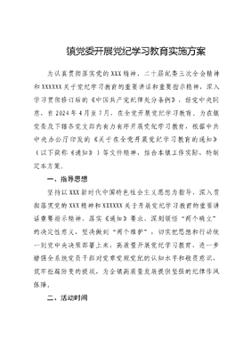 镇党委开展党纪学习教育实施方案为认真贯彻落实党的XXX精神、二十届纪委三次全会精神和XXXXXX关于党纪学习教育的重要讲话和重要指示精神,深入学习贯彻修订后的《中国共产党纪律处分条例》,经党中央同意,自2024年4月至7月,在全党开展党纪学习教育。为在镇党委及下辖各党支部内有力有序开展党纪学习教育,根据中共中央办公厅印发的《关于在全党开展党纪学习教育的通知》(以下简称《通知》)等文件精神,结合本镇工作实际,特制定本方案。一、指导思想坚持以XXX新时代中国特色社会主义思想为指导,深入贯彻落实党的XXX精神和XXXXXX关于开展党纪学习教育的重要讲话重要指示精神,落实《通知》要求,深刻领悟两个确立的决定性意义,坚决做到两个维护,切实把思想和行动统一到党中央决策部署上来,高质量开展党纪学习教育,进一步增强全系统党员干部对党章党规党纪的认知水平和敬畏意识,筑牢拒腐防变的提坝,为全镇高质量发展提供坚强的纪律作风保障。二、活动时间2024年4月~7月三、组织机构成立开展党纪学习教育工作领导小组。组 长:镇党委书记常务副组长:镇党委副书记、镇长副组长:组织委员、纪委书记成员:镇党委其他党政班子成员、各党(总)支部书记领导小组下设办公室,办公室设在镇党建办公室,由*同志兼任办公室主任,并抽调专门人员负责领导小组的日常工作,统筹调度推进。四、主要内容(一)抓好专题研学。要把学习《中国共产党纪律处分条例》纳入党委(党组)理论学习中心组学习内容,把重点发言和集体研讨、专题学习和系统学习结合起来,逐章逐条认真研读,围绕条例的修订背景,将新增修改内容作为学习重点,以新旧对照学用结合的方式,重点对新旧条例进行对比学习,做到学懂弄通、吃透,全面深入领会条例修订的重大意义、主要内容和精神实质。党员干部要联系自身思想实际和工作实际,坚持边学习、边对照、边检视、边整改,加深思考认识,防止问题发生。文可居文库——海量学习资料,手机电脑均可下载www.wenkeju.com(二)抓好以案促学。要用身边事警醒身边人、用案中人点醒梦中人,让党员干部切实感受到纪法就在身边、教训就在眼前,达到查处一人、警示一片、治理一域的效果。要以零距离、面对面的方式,把课堂搬到庭审现场、案发单位,让党员干部感受纪法威严和违纪违法的惨痛代价,真正做到重视、警醒、知止。要坚持分类施策,选取地域相近、层级接近、行业相同、岗位类似的党员干部,针对性地开展警示教育,做到量体裁衣,因人而异、靶向施策。(三)抓好以训助学。要充分发挥党员干部集中教育培训的重要作用,推动纪律教育进党校入课堂。坚持将学习《中国共产党纪律处分条例》与党性教育、纪法教育相结合,纳入各级党员干部集中教育培训班必修课,常态化、制度化安排党风廉政建设研修课程,教育引导党员干部深入学习贯彻XXXXXX关于推进党的自我革命、健全全面从严治党体系、全面加强党的纪律建设重要论述精神,深刻领会修订条例的重点内容和着力方向,强化自我约束,提高免疫能力,凝聚干事创业的精气神。(四)抓好日常融学。要抓实抓细党员干部经常性的党纪学习教育,落实三会一课、主题党日等制度,运用文可居文库——海量学习资料,手机电脑均可下载www.wenkeju.com学习强国、共产党员网等平台,采取课堂讲授、政策解读、案例教学、现场体验等方式,推动党纪学习教育走深走实走心,教育引导党员干部进一步明确日常言行的衡量标尺,用党规党纪校正思想和行动,真正使学习党纪的过程成为增强纪律意识、提高党性修养的过程。五、工作要求这次党纪学习教育时间紧、任务重、要求高,对于保障事业高质量发展意义重大。各级党组织要高度重视,精心组织实施,确保圆满完成党纪学习教育各项任务。(一)强化组织领导。各级党组织要高度重视党纪学习教育工作,加强组织领导,明确责任分工,确保党纪学习教育有序开展。党委党组要压实领导责任,各级领导班子和党员领导干部要带头学习,推动高质量完成党纪学习教育任务。(二)强化宣传引导。要充分利用各种宣传渠道和平台,广泛宣传党纪学习教育的重要意义、目标要求和主要内容,营造浓厚的学习氛围。要力戒形式主义,提高宣传效果,让党纪学习教育深入人心。(三)强化学用结合。要坚持两手抓两促进,把开展党纪学习教育同落实党中央重大决策部署、完成本地区本部门本单位重点工作紧密结合起来,使党纪学习教育每项措施都成为促文可居文库——海量学习资料,手机电脑均可下载www.wenkeju.com进中心工作的有效举措,切实防止两张皮。文可居文库——海量学习资料,手机电脑均可下载www.wenkeju.com