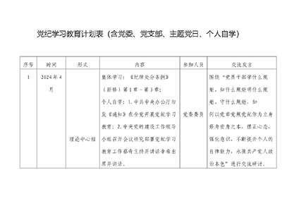 党纪学习教育计划表(含党委、党支部、主题党日、个人自学)序号时间形式内容参加人员交流发言12024年4月理论中心组集体学习:《纪律处分条例》(新修)第1章-第3章;个人自学:1.中共中央办公厅印发《通知》在全党开展党纪学习教育;2.中央党的建设工作领导小组召开会议研究部署党纪学习教育工作蔡奇主持并讲话李希出席并讲话。党委委员围绕党员干部学什么规矩、知什么规矩明什么规矩、守什么规矩,如何以党章党规党纪作为立身修身安身之本,摆正心态,强化意识,不断提升个人的自律能力,永葆共产党人政治本色进行交流研讨。22024年5月集体学习:《纪律处分条例》(新修)第4章-第6章;个人自学:1.A:组织开展好党纪学习教育引导党员学纪知纪明纪守纪2.A在2024年春季学期中央党校(国家行政学院)中青年干部培训班开班之际作出重要指示。围绕我是谁,为了谁,我为什么而奋斗党员干部如何做遵纪守规的模范,以身作则打造风清气正干事创业环境进行交流研讨。32024年6月集体学习:《纪律处分条例》(新修)第7章-第9章个人自学:A在二十届中央纪委围绕自觉把讲政治守纪律守规矩作为行为准则,就应该从内心深处正本三次全会上发表重要讲话强调深入推进党的自我革命坚决打赢反腐败斗争攻坚战持久战。清源,做到心有所属、心有所止、心有所戒进行交流研讨。42024年7月集体学习:《纪律处分条例》(新修)第10章-第11章;个人自学:1.A:时刻保持解决大党独有难题的清醒和坚定,把党的伟大自我革命进行到底;2.A:严守党的政治纪律政治规矩说老实话办老实事做老实人。围绕用党规党纪校正思想和行动,真正使学习党纪的过程成为增强纪律意识、提高党性修养的过程,推动党纪学习教育走深走实、见行见效进行交流研讨。12024年4月支部党员大会集体学习:《纪律处分条例》(新修)第一章-第六章;观看视频:一起学《条例》坚持党性党风党纪一起抓支部全体党员支部自行安排22024年5月支部党员大会集体学习:《纪律处分条例》(新修)第七章-第十一章;典型案例警示教育。32024年6月专题党课党委书记上党纪学习教育专题党课,围绕新修订《纪律处分条例》进行深度解读.42024年7专题党课各支部书记上专题党课,邀请挂月钩党委委员参加。12024年4月主题党日活动学条例守党纪明底线知敬畏党纪学习教育主题党日活动:1.《条例》原原本本学2.结合案例警示学;3.政治体检反思学。支部全体党员支部自行安排22024年5月学党纪党规·筑清廉防线主题党日活动:1.政治领廉促纪法意识强化;2.警示明廉,促纪法底线牢固;3.整治铸廉,促纪法案件遏制;4.教育润廉,促廉洁初心坚定;5.家书倡廉,促廉洁家风养成;6.阵地育廉,促廉洁文化创新。32024年6月运用好红色教育资源、党性教育基地开展党纪学习警示教育,重温入党誓词,进一步化纪律意识、加强自我约束、提高免疫能力,增强政治定力、纪律定力、道德定力、抵腐定力,始终做到忠诚干净担当。42024年7月运用现场教学点、主题教室等开展党纪学习警示教育,深刻剖析违纪典型案例,注重用身边事教育身边人,引导党员干部受警醒、明底线、知敬畏。12024年4月个人自学个人自学:1.中共中央办公厅印发《通知》在全党开展党纪学习教育2.中央党的建设工作领导小组召开会议研究部署党纪学习教育工作蔡奇主持并讲话李希出席并讲全体党员话22024年5月个人自学:1.A:组织开展好党纪学习教育引导党员学纪知纪明纪守纪2.A在2024年春季学期中央党校(国家行政学院)中青年干部培训班开班之际作出重要指示32024年6月个人自学:A在二十届中央纪委三次全会上发表重要讲话强调深入推进党的自我革命坚决打赢反腐败斗争攻坚战持久战2024年7月个人自学:1.A:时刻保持解决大党独有难题的清醒和坚定,把党的伟大自我革命进行到底2.A:严守党的政治纪律政治规矩说老实话办老实事做老实人42024年4月下旬—2024年7月带动好退休党支部党员学习,确保学习全覆盖。退休党支部党员