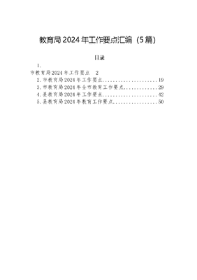 教育局2024年工作要点汇编(5篇)目录1.市教育局2024年工作要点22.市教育局2024年工作要点193.市教育局2024年全市教育工作要点.294.县教育局2024年工作要点425.县教育局2024年教育工作要点..50市教育局2024年工作要点2024年,全市教育系统坚持以新时代中国特色社会主义思想为引领,深入贯彻落实党的精神,全面落实市委十届七次全会及国家、省教育工作部署,紧紧围绕12991工作思路【坚持建设教育强市办好人民满意教育一个目标;突出全面提高教育教学质量、加快推进教育现代化两项重点;强力推进党建领航工程、立德树人工程、中小学幼儿园扩容提质工程、基础教育公平优质均衡工程、职业教育提质培优工程、高等教育双一流工程、教师队伍素质提升工程、教育数字化赋能工程、教育治理创新工程九项工程;持续深化新时代教育评价改革、新时代教育督导体制机制改革、教育集团化改革、义务教育双减改革、招生机制改革、课堂教学改革、县管校聘改革、教师激励机制改革、协同共育改革九项改革;努力办好一批教育民生实事】,凝心聚力、务实笃行,奋力开创XX教育高质量发展新局面。 一、坚持建设教育强市办好人民满意教育目标 1.全面完成年度工作任务。围绕建设教育强市目标,加快推进教育事业发展。学前三年毛入园率达到94.5%以上,普惠性幼儿园覆盖率达到89%,公办幼儿园在园幼儿占比达58%。义务教育阶段入学率保持100%、巩固率达到98%,原建档立卡学生巩固率达到100%,随迁子女在公办学校就读比例达到90%以上,特色学校达到250所,农村优质学校达到140所。高中阶段教育毛入学率达到94%,特色学校达到40所,普通高中招生人数达到9.5万人,就读优质普通高中在校生比例达到65%。全市新增特殊教育资源教室30个。义务教育课后服务学校覆盖率、学生有意愿参与率100%。全市中等职业学校办学条件达标率不低于80%。评选认定XX市中等职业学校双师型名师工作室10个、双师型骨干教师100名。推动高等教育内涵发展,评选认定市级高水平专业5个。 2.健全教育发展保障体系。加大财政教育经费投入,严格落实各学段教育生均拨款制度和教育专项投入政策,确保实现两个只增不减,全年教育经费投入达到294.4亿元。落实《河北省内部审计规定》要求,推进内部审计全覆盖,强化审计监督效能。建立完善开放灵活的教师补充机制,新招聘补充教师3000人以上。 3.提升教育系统作风效能。深入开展四下基层活动,充分发挥市、县两级驻校干部作用,指导督促基层薄弱学校有效处置负面舆情,将问题矛盾化解在基层一线,全面提升学校管理水平。结合周末XX专家行活动,持续办好XX教育大讲堂,营造不求所有、但求所用学习氛围。 4.实施精准考核奖惩。修订对县(市、区)、市直学校考核办法,健全完善科学精准考核体系,强化过程性考核,用考核数据引领教育各项工作争第一、创唯一。同时,做好对外宣传、信息公开、议案办理、督查调研工作,加强离退休干部和关心下一代工作,推动保密、档案、后勤、捐资助教、全面深化改革等各项工作。 二、突出两项重点工作 (一)全面提高教育教学质量 5.坚持科学教育质量观。实施课程教学深化行动,开齐开足国家规定课程,引导学校构建多样化有特色课程体系。加强考试命题研究,做好教考衔接。推进教育科研转型,构建研教、研学、研评、研考一体化教研体系。实施1+X学科教研课程,促进学科教研由活动化向课程化转变。深化网络教研,各学段各学科全年网络教研不少于150次。深化与北京海淀区、天津南开区等地互动交流,构建区域教研新样态。 6.加强教育质量监测与发展研究。组织实施国家义务教育质量监测,做好区域内学业质量监测,开展质量评估监测专项培训,争创河北省义务教育质量监测试点单位。建设一批教育发展研究基地,围绕教育高质量发展等重大问题,开展战略性、前瞻性、全局性研究,推动调研成果转化,为科学决策提供支撑。 (二)加快推进教育现代化 7.优质普惠发展学前教育和特殊教育。建立乡(镇)村共同发展机制,每个乡(镇)至少创建1所公办中心园为农村示范性幼儿园。优化普惠性学前教育资源布局与结构,创建游戏教育实验区和游戏教育实验园。创建5所省级示范性幼儿园,10所城市一类幼儿园,15所农村示范性幼儿园。实施特殊教育普惠融合行动,推进普通学校特殊教育资源教室建设。做好适龄残疾儿童少年义务教育阶段教育安置工作,提高送教上门工作质量。 8.优质均衡发展义务教育。优化县域义务教育资源配置,办好一批家门口优质学校。以学校标准化建设为统领,加强乡村小规模学校和乡镇寄宿制