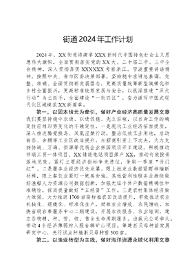 街道2024年工作计划2024年,XX街道将高举XXX新时代中国特色社会主义思想伟大旗帜,全面贯彻落实党的XX大、二十届二中、三中全会精神,深入贯彻落实XXXXXX考察浙江、宁波重要讲话精神,按照中央、省市区委决策部署,坚持稳中求进总基调,完整、准确、全面贯彻新发展理念,更高质量统筹新型城镇化和乡村全面振兴,更高标准统筹发展与安全,以纵深推进五大行动为主抓手,全面建设一街四区,奋力谱写中国式现代化区域模范XX新篇章。第一,以固本培元为牵引,做好产业经济高质量发展文章我们要坚持稳中求进、以进促稳、先立后破,以自身工作的确定性应对形势变化的不确定性。一是现代工业经济拓面提质。深入推进腾笼换鸟、凤凰涅槃行动,整治低效工业用地,启动翁岙、舍辋等工业区改造提升。在招商引资上下功夫,大力支持协诚、万海、恒源等优质企业拓园项目开工建设,积极推动祥瑞工贸一体项目、XX储能电站项目落户XX,推动有效投资落地见效。紧盯主要经济指标争先进位,争取一季度开门红。二是服务业经济优先发展。限上批发业数据紧盯祥瑞新材料,限上餐饮业紧盯一帆美食城,其他营利性服务业持续做好渔船人力资源公司数据创新,加强无证个体户数据精确性和准确性,保质提量做好五经普工作。三是农村集体经济做大做强。大力推进1700亩高标准农田改造提升,有效推进农业机械化、规模化、标准化生产,助推农业增效、农民增收。加快省级农事服务中心二期建设,开展农技服务、农业培训,建立谷物耕、种、管、收、售全生命周期服务。由莼元公司牵头,带动4个经济薄弱村入股舍辋矿山项目。筹建浙贝母种苗发展研究中心,先行试点种植浙贝母种苗500亩。第二,以渔业转型为主线,做好海洋资源永续化利用文章我们要科学引导渔业转型升级,推动渔民往岸上走、渔船往深海走、渔业往高附加值走,努力实现蓝色经济可持续发展。一是推进减船转产。以渔港有效避风容量为基准,优先淘汰病老危渔船,确保高风险渔船、船龄15年以上渔船应减尽减。继续做好一打三整治工作,加大清网和清港两大专项执法行动力度,稳步推进象山港渔业资源修复。二是推进结构调整。依托长三角互联网水产商贸中心项目,改善冷链加工、数字交易等现代化渔业基础设施,优化调整渔业产业结构和比重,将涉渔劳动力从一产向二三产转移,加快渔业水产品加工业和新兴销售业发展。三是推进渔港建设。加快桐照中心渔港建设项目,新建桐照港西侧、栖凤港北侧两处避风锚地,新建翡翠湾休闲渔业码头、栖凤港小船码头、缪家村养殖船码头,满足各类作业渔船锚泊需求,消除安全隐患。推动EOD项目落地落实,利用现有船厂既有用地和周边新征用地完成现有船舶修造企业整合,满足渔业产业后勤保障需要。四是推进特色品牌。迭代升级蓝海红帆党建品牌,动态调整编组网格结构,积极挖掘海上经典故事,形成一批可借鉴、可复制、可推广的海上治理模式。第三,以宜业宜居为目标,做好产城融合一体化建设文章我们必须要超前谋划、超前布局,利用3-5年时间打造具有XX辨识度、标志性建筑、城市天际线的城乡新面貌。一是路网格局重构。产城融合规划成果中已经明确,近期城市休闲文旅核建设主要包括2233项目,第一个2就是东环线南延、滨海观光大道北延2条主要道路,其中东环线南延工程得到了吴家埠村的大力支持,目前已经动工建设。二是城镇空间重塑。近期建设重点还包括2个重点项目综合体建设,涵盖了商业零售、商务办公、酒店餐饮、公寓住宅、综合娱乐等多样化功能,满足人民日益增长的物质需求、精神需求、文化需求。稳步推进塘头周、尹家、碶头3个村庄整村拆迁,为产城融合发展预留空间。分批推进3个住宅项目建设,用于安置拆迁人口、吸引内部转移人口和外来新增人口。三是民生配套重建。谋划XX市场迁建选址工作,充分预留周边配套设施空间,改变当前市场脏乱差现状,推动人流跟着配套走。开展XX卫生院迁建项目前期工作,初步意向于振兴路南侧地块新建公立综合性滨海医院,占地约30亩,覆盖辐射沿海三镇和经济开发区,满足滨海区块医疗卫生服务需求。第四,以人本思想为核心,做好人居环境全年龄友好文章我们要着力加强公共服务、生态环境、人文素养,真正吸引人、留住人,形成滚雪球式的正向循环,进一步抬升城市的发展高度。一是加快农房改造。有序推进村庄整治,持续推进袁岙、金地、漂溪、鸿峙、朱家店等村农房梳理式改造,建成宜居宜业和美乡村。加快推进XX街道东谢村旧村改造安置小区一期项目,确保项目如期完工。二是守住绿水青山。推进污水零直排区建设示范街道创建工作,谋划启动XX污水厂扩容项目,推进章胡、漂溪等村农污终端纳厂改造项目和污水终端(楼隘1#终端、杨桥等)提升改造项目。加强生态资源保护修复,对下陈江上游马夹岙至陈三村段2公里河道进行全面整治,完成下陈江河口600亩湿地生态修复。三是关注一老一小。充分
