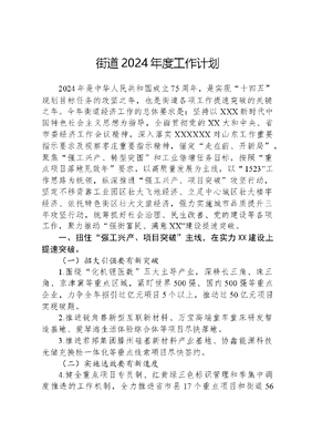 街道2024年度工作计划2024年是中华人民共和国成立75周年,是实现十四五规划目标任务的攻坚之年,也是街道各项工作提速突破的关键之年。今年街道经济工作的总体要求是:坚持以XXX新时代中国特色社会主义思想为指导,全面贯彻党的XX大和中央、省市委经济工作会议精神,深入落实XXXXXX对山东工作重要指示要求及视察枣庄重要指示精神,锚定走在前、开新局,聚焦强工兴产、转型突围和工业倍增任务目标,按照重点项目落地见效年要求,以高质量发展为主线,以1523工作思路为统领,纵深推进强工兴产、项目突破攻坚行动,坚定不移背靠工业园区壮大飞地经济、立足中心城区壮大楼宇经济、依托特色街区壮大文旅经济,强力实施城市品质提升三年攻坚行动,统筹抓好社会治理、民生改善、党的建设等各项工作,聚力推动强街富民、满意XX建设提速突破。一、扭住强工兴产、项目突破主线,在实力XX建设上提速突破。(一)招大引强要有新突破1.围绕化机锂医数五大主导产业,深耕长三角、珠三角、京津冀等重点区域,紧盯世界500强、国内500强等重点企业,力争全年招引过亿元项目5个以上,推动过50亿元项目实现破题。2.推进锐角兽新型互联新材料、万宝高端童车童床研发智造基地、爱琴海生活体验综合体等项目尽快落地。3.推进君邦集团滕州硅基新材料产业基地、协鑫能源科技光储充换检一体化等重点线索项目尽快签约。(二)实施达效要有新速度4.健全重点项目专员制、红黄绿三色标识管理和季集中调度推进的工作机制,全力推进省市县17个重点项目和街道56个投资过500万元项目,确保全年新纳统项目不少于12个。5.推进沃达智能精密伺服液压冲床产业园、凯瑞墨凡军工装备和鑫宏天高端输配电系统项目尽快开工。6.综合运用法律、行政、金融等方式,力争盘活低效工业用地200亩以上。7.依托商会,建立银企常态化对接机制,全力破解融资难、融资贵问题。(三)企业培育要有新成效8.推进企业对标登高,强化生态主导型企业培育,助力龙头企业膨胀规模,力争新增营收过10亿元工业企业1家、过亿元贸易业企业2家。9.推进四上企业培育,健全职能部门协调联动机制,建好种子准四上和四上三个企业库,用好各类奖补政策,确保全年四上企业新增40家以上。10.推进专精特新企业培育,确保新增省级以上专精特新企业4家、高新技术企业5家,打造数字化车间、智能工厂及智能制造示范企业2个。11.强化相关政策宣传引导,增强企业上市挂牌积极性,全面加快山森数控、飞华美妆等企业上市进程。二、激发改革开放、消费升级动能,在活力XX建设上提速突破。(一)增强改革动力12.大力发展楼宇经济,优化商务楼宇产业规划布局,量身打造优惠政策,强化内部空间整合,用好楼宇中小企业服务平台,招引软件服务、工业互联网等高端服务业,特别是生产性服务业头部企业入驻经营。13.发展壮大国有企业,完善东诚集团资产和财务管理、质量安全、风险防范等内控机制。14.深入推进财源综合治理,突出抓好网络直播、电子商务等新业态税源的培育和涵养。(二)激发创新活力15.支持企业同高校院所开展产学研合作,同行业头部企业开展关键核心技术协同攻关和创新产品推广应用。16.全力抓好招才引智,健全完善人才飞地、科技飞地、离岸孵化器等柔性引才措施体系,完善人才需求信息库、领军人才目标库,确保柔性引进高层次人才2人以上。17.推进万宝童车生产线、联华印刷八色高速凹印机组等6个重点技改项目快实施、快达效。18.鼓励支持各行各业、各个领域开展标准化创建活动,积极争创国家级、省级标准化试点示范项目,努力以高标准引领高质量。(三)提升外贸实力19.高效运营普利跨境电商产业园,支持引导三维钢构、泰源电力等企业扩大出口。20.用好我市药食同源商品进口通关试点机遇,突出抓好香辛料深加工贸易产业园等项目建设。(四)深挖消费潜力21.推进鲁南美食城墨子文化民俗街提升项目实施,坚持整治提升和业态招商两手抓,推动墨子科技文化城5A级景区和国家文化旅游夜间消费集聚区创建提速。22.顺应沉浸式体验、年轻化消费的新趋势,规范升级万达广场、人和广场、美铭广场等重点商圈,大力发展国潮消费、体验消费、网红消费等新业态新场景。23.加快推进深圳华强集团美铭科教谷等项目落地建设,构建青年发展友好型生态圈。三、突出拆改并举、有机更新导向,在品质XX建设上提速突破。(一)推进重点区域搬迁改造24.强力推进后洪棚改项目。启动贺庄赵楼片区城市更新项目。25.高标准实施好滨江花苑小区一期老旧小区和19条背街小巷改造工程,切实做到顺民意、暖民心。(二)强化基础设施配套建设26.抓好滕国路东延、墨子大道南延、府前东路、新华东路、至善路、南滨河路、安居北路等7条道路建设,以及通盛路等3条道路改造提升。