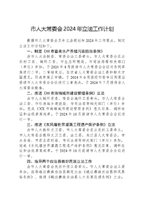 市人大常委会2024年立法工作计划根据市人大常委会五年立法规划和2024年工作要点,制定立法工作计划如下。一、制定《XX市畜禽水产养殖污染防治条例》由市人大法制委、常委会法工委牵头,市人大常委会农业农村工委、城环工委、市生态环境局、市司法局等相关部门(单位)参加,于2024年4月提请市人大常委会会议对条例草案进行二审。二审结束后,征求省人大常委会法工委和相关方面意见,形成草案三审稿,于2024年6月报经市委审议同意后提请市人大常委会会议进行三审表决,于2024年7月报请省人大常委会批准。二、推进《XX市海绵城市建设管理条例》立法由市人大城环资委、常委会城环工委牵头,市人大常委会法工委、市住房城乡建设局、市司法局等相关部门(单位)参加,完成《XX市海绵城市建设管理条例》意见征集、调研论证和法规草案起草,于2024年10月提请市人大常委会会议进行一审。三、推进《东风堰世界灌溉工程遗产保护条例》立法由市人大教科文卫委、市人大常委会农业农村工委牵头,市人大常委会教科文卫工委、法工委,夹江县人大常委会,市水务局、市农业农村局、市司法局等相关部门(单位)参加,完成《东风堰世界灌溉工程遗产保护条例》意见征集、调研论证和法规草案起草,于2024年10月提请市人大常委会会议进行一审。四、指导两个自治县做好民族立法工作由市人大常委会民宗外侨工委牵头,市人大常委会法工委参加,指导峨边彝族自治县制定出台《峨边彝族自治县移风易俗条例》、推进《峨边彝族自治县人才发展促进条例》立法;指导马边彝族自治县废止《马边彝族自治县施行〈四川省《中华人民共和国土地管理法》实施办法〉的变通规定》。 五、推进备案审查和立法后评估工作由市人大常委会法工委牵头,市人大各专门委员会、常委会其他办事工作机构参加,加强备案审查制度和信息化建设,做到有件必备、有备必审、有错必纠,维护法治统一和政令畅通。认真做好党内规范性文件出台前的合法性审查工作。推进立法后评估,不断提高立法质量,促进地方性法规更好服务XX发展。