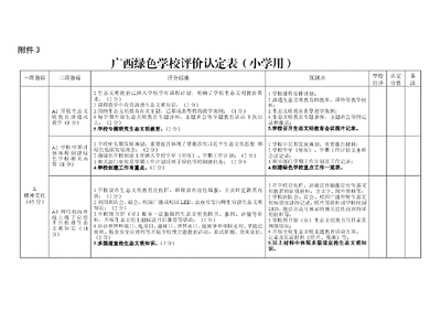 附件3广西绿色学校评价认定表(小学用)一级指标二级指标评分标准观测点学校自评认定分值备注A精神文化(45 分)A1 开展生态文明教育渗透式教学(9 分)1.生态文明教育已纳入学校学年课程计划,明确了学校生态文明教育要求;(2 分)2.课程教学中有效渗透生态文明知识;(2 分)3.围绕生态文明教育有关主题,已形成典型性的教学案例;(1 分)4.每学期开展生态文明教育专题讲座、主题班会等专题教育活动 3 次以上;(2 分)5.学校专题研究生态文明教育。(2 分)1.学校课程安排计划;2.渗透生态文明教育的教案、课件等教学材料;3.生态文明教育典型教学案例;4.生态文明教育专题讲座、主题班会等的记录和报道;5.学校召开生态文明教育会议图片记录。A2 学校学期计划体现创建绿色学校相关内容(8 分)1.学校中长期发展规划、重要报告体现了贯彻落实习近平生态文明思想和绿色低碳发展理念;(2 分)2.将绿色学校创建工作纳入学校学年(年度)、学期工作计划;(2 分)3.相关部门年度及学期工作计划反映了绿色学校创建任务;(2 分)4.学校创建工作有重点。(2 分)1.学校中长期发展规划、重要报告材料;2.学校学年(年度)、学期工作计划文本和会议记录;3.相关部门学期工作计划及工作记录;4.创建绿色学校重点工作一览表。A3 利用校内外线上线下宣传平台传播生态文明知识(10分)1.学校设有生态文明教育宣传栏,班级设有宣传墙报,并及时更新其内容;(2 分)2.利用班队会、晨会、校园广播或校园 LED、公众号等向师生宣讲生态文明知识;(2 分)3.学校图书馆(室)配备一定数量的生态文明类图书、报刊、音像等资料,开展生态文明主题阅读书目推荐等活动;(2 分)4.结合世界环境日、地球日、森林日、世界水日、植树节和中国水周、节能宣传周、粮食安全宣传周等开展全校性主题教育活动,形式新颖、效果良好;(2 分)5.多渠道宣传生态文明知识。(2 分)1.在学校宣传栏、班级宣传墙报宣传生态文明教育的证明材料,含文字、图片资料等;2.学校班队会、晨会、校园广播开展生态文明知识宣讲的记录、照片等资料或学校校园LED、微信公众号展示的相关宣传内容的证明材料等;3.学校图书馆(室)生态文明类书刊目录及利用情况;4.开展全校生态文明主题教育活动方案、记录及佐证材料(照片、视频)等;5.以上材料中体现多渠道宣传生态文明知识。一级指标二级指标评分标准观测点学校自评认定分值备注A精神文化(45 分)A4 组织师生参与节约能源、环境保护等绿色实践活动(8分)1.学校有生态环境保护类兴趣小组等,且积极开展生态环保实践活动;(1 分)2.按班级划分绿化责任区,组织学生参与净化、绿化、美化校园劳动;(1 分)3.学校组织师生开展义务植树活动;(2 分)4.学校组织师生开展节约用粮活动;(2 分)5.学校倡导师生履行绿色生活方式,如绿色出行、减少使用一次性生活用品、旧书分享等;(1 分)6.学校组织师生走进周边社区开展环境保护宣传和实践活动;(1 分)1.学校生态环境保护类兴趣小组的设立情况及其开展相关绿色实践活动的方案、记录、相片等资料;2.班级绿色责任区的划分资料及学生参与绿化的相关记录、照片等;3.师生开展义务植树活动方案及图片记录等材料;4.师生开展节约用粮活动方案及图片记录等材料;5.师生履行绿色生活方式的相关实例及效果资料;6.师生走进周边社区开展环境保护宣传和实践活动方案及图片记录等材料。A5 鼓励师生进行绿色科技发 明创造(10 分)1.学校每年组织开展 1 次以上绿色科技科普活动或绿色科技发明创造竞赛等;(2 分)2.学校鼓励师生参加绿色科技发明创造活动,在设备设施、场所、经费等方面提供支持;(2 分)3.教师积极指导学生参与绿色科技发明创造,包括环保发明、制作创作、科技竞赛等;(2 分)4.学校建立了激励机制,对在绿色科技发明创造方面取得较好成绩的师生给予奖励、表彰;(2 分)5.开展师生利用废旧物改造再利用成果展示。(2 分)1.学校绿色科技科普活动或绿色科技发明创造竞赛的方案、相关活动记录、照片、总结等材料;2.学校支持师生参加绿色科技发明活动的政策文件;3.教师指导学生开展绿色科技发明创造活动的过程性记录、照片等材料;4.相关激励机制文件,相关奖励、表彰材料;5.开展师生利用废旧物改造再利用成果展示图片。一级指标二级指标评分标准观测点学校自评认定分值备注B物质条件(25 分)B1 合理设置绿化用地,增加校园绿化面积(8分)1.校园应绿尽绿,无抛荒闲置用地;(1 分)2.学校布局美观,功能区划合理,与学校文化相协调,符合环境保护和 师生身心健康的需要;(2 分)3.校园环境干净优美,校园绿化用地面积占学校总面积控制在 20%-30%;(2 分)4.校园植物配置遵循物种