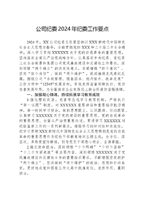 公司纪委2024年纪委工作要点2024年,XX公司纪委工作要坚持以XXX新时代中国特色社会主义思想为指导,全面贯彻党的XXX和二十届二中全会精神,深入学习贯彻XXXXXX关于党的自我革命的重要思想,坚决落实全面从严治党战略方针,认真落实中央纪委、省纪委三次全会部署和集团公司党风廉政建设和反腐败工作要求,深刻领悟两个确立的决定性意义,自觉增强四个意识、坚定四个自信、做到两个维护,纵深推进正风肃纪反腐,围绕公司合规管理、强基固本、稳内拓外、改革发展工作方针和12345发展目标,有效发挥监督保障执行、促进完善发展作用,为全面推进企业发展迈上新台阶提供坚强保障。一、加强凝心铸魂,持续拓展学习教育成效1.强化理论武装。完善常态化学习教育机制,严格执行第一议题制度,对XXXXXX重要讲话和重要指示批示精神,第一时间学习领会,做到思想跟上、认识跟进、行动跟紧。认真学习XXXXXX关于党的建设的重要思想、党的自我革命的重要思想、全面从严治党重要论述,贯通学习XXXXXX对纪检监察工作的一系列新要求,增强学习的针对性和实效性。把学习贯彻XXX新时代中国特色社会主义思想特别是党的自我革命的重要思想作为纪检干部教育培训主题主线,全方位、深层次、多角度宣传解读,引导党员干部悉心领会、全面掌握。2.强化使命担当。深刻领悟十个明确十四个坚持十三个方面成就等主要内容,深刻领悟XXXXXX关于党风廉政建设和反腐败斗争的重要指示要求,不断增强坚定拥护两个确立、坚决做到两个维护的政治、思想和行动自觉,更好地在党和国家工作大局中找准定位、发挥作用、履职担当。3.强化实干成效。用好深学习、实调研、抓落实机制,把理论和实践、学习和运用统一起来、贯通融合,推动学习从量变向质变飞跃,用以武装头脑、指导实践、推动工作,切实把学习成果体现为正风肃纪反腐的实际成效。二、加强政治监督,保障决策部署落地见效4.聚焦两个维护加强监督。把两个维护作为根本任务、履职之要,在督促学深悟透XXX新时代中国特色社会主义思想上持续用力,推动公司两级党组织保持政治忠诚、落实政治责任、站稳政治立场、强化政治担当。坚持从政治上看、从政治上抓,善于透过业务看政治,着力查找和纠正政治偏差,严肃查处政策落实不力、不担当不作为、做选择搞变通打折扣等问题,抓住典型,通报曝光,形成震慑。破潜规则,立明规矩,坚决防止搞小圈子拜码头搭天线,有力打击政治骗子,严格防止把商品交换原则带到党内。强化选人用人上的监督,推动形成清清爽爽的同志关系、规规矩矩的上下级关系。5.严明政治纪律和政治规矩。坚决纠正和严肃查处违反政治纪律和政治规矩的行为,突出对党忠诚的监督,重点督促公司两级党组织和党员干部坚持党的领导、贯彻执行党的理论和路线方针政策、严守党的政治纪律和政治规矩、坚决查处七个有之两面人问题,坚决查处低级红高级黑,坚决查处搞政治团伙、小圈子、利益集团等问题,消除政治隐患,维护政治安全。6.聚焦国之大者加强监督。紧盯党的XXX战略部署,紧盯XXXXXX、党中央因时因势作出的重大决策,紧盯五位一体总体布局、四个全面战略布局、三新一高、现代化产业体系建设、扩大国内需求、防范化解风险、落实意识形态责任制等重要工作,主动监督,精准监督,督促各级时刻对标对表、不折不扣落实。紧盯XXXXXX重要指示批示特别是对甘肃重要指示精神加强监督,督促落地生根。文可居文库——海量学习资料,手机电脑下载www.wenkeju.com7.聚焦省之要者加强监督。围绕构建一核三带区域发展格局、实施四强行动等重点任务加强监督,健全落实机制,完善协同监督机制,落实台账管理、督查问责、回头看、整改落实、检查评估等制度,确保执行不偏向、不变通、不走样。8.构建风清气正政治生态。严肃党内政治生活,督促公司两级党组织和各部门严格落实民主集中制,中央八项规定精神、新时代党的组织路线、理想信念和党风党纪教育、推动党内政治文化建设等情况,进一步增强政治功能和组织功能。加强政治生态分析研判,重点分析一把手和领导班子政治素质和政治品行。动态完善领导干部廉洁档案,为监督对象精准画像,督促企业领导干部严于律己、严负其责、严管所辖,大力营造风清气正的政治生态。9.加强问题整改监督。紧盯巡视巡察、环保督察、审计和相关专项检查督察等反馈问题整改工作跟进监督,推动问题整改到位。对照十四届省委第三轮巡视组向集团公司反馈问题,督促做好反馈问题的认领工作,会同有关部门认真履行巡视整改监督责任,将督促巡视整改作为日常监督的重要抓手,压实党组织整改主体责任、党组织书记第一责任人的责任,聚焦重点问题,盯住具体人、具体事,强化实地检查,掌握真实情况;对敷衍应付、虚