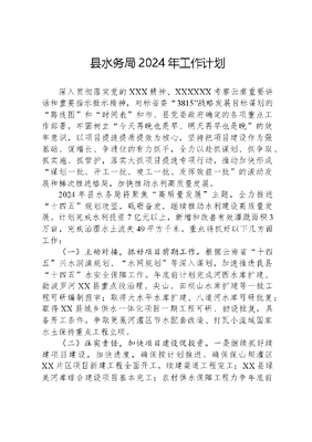 县水务局2024年工作计划深入贯彻落实党的XXX精神、XXXXXX考察云南重要讲话和重要指示批示精神,对标省委3815战略发展目标谋划的路线图和时间表和市、县党委政府确定的各项重点工作部署,牢固树立今天再晚也是早、明天再早也是晚的效率意识,以项目提速提质提效为核心,坚持把项目建设作为强基础、促增长、争进位的有力抓手,全力以赴抓谋划、抓争取、抓实施、抓管护,落实大抓项目提速专项行动,推动加快形成谋划一批、开工一批、竣工一批、发挥效益一批的滚动发展和梯次推进格局,加快推动水利高质量发展。2024年县水务局将聚焦高质量发展主题,全力推进十四五规划攻坚,砥砺奋发,继续推动水利建设高质量发展。计划完成水利投资7亿元以上,新增和改善有效灌溉面积3万亩,完成治理水土流失49平方千米。重点将抓好以下几方面工作:(一)主动对接,抓好项目前期工作。根据云南省十四五兴水润滇规划、水网规划等深入谋划,加速推进我县十四五水安全保障工作。年底前计划完成河西水库扩建、勐波罗河XX县重点段治理、尖山、田坝山水库扩建等一批工程可研编制报审;取得大水平水库扩建、八道河水库可研批复;取得XX县城乡供水一体化项目一期工程可研、初设批复,具备开工条件。争取更戛河灌区节水配套改造、打瓦小流域国家水土保持重点工程立项。(二)压实责任,加快项目建设促投资。一是继续抓好续建项目建设,加快进度,确保按计划推进。确保保山坝灌区XX片区项目新建工程全面开工,续建渠道工程完工;XX县绿美河库综合建设项目基本完工;农村供水保障工程力争年底前完成主体工程建设,确保项目尽快发挥效益;大勐统河XX重点段治理工程建设稳步推进。二是积极筹措资金、协调用地,加快各项重点工程开工建设。通过争取上级财政补助和引入社会资本等方式促进新项目开工,年内争取开工XX县城乡供水一体化一期工程、打瓦小流域治理、更戛河中型灌区节水配套改造、勐波罗河XX县重点段治理、大水平水库扩建等一批重点项目建设。进一步压实工作责任,细化措施,明确时序进度,认真抓好项目组织实施,做到应开尽开,力争早开多开,为完成水利投资任务奠定坚实的基础。(三)统筹兼顾,抓防灾减灾促水利安全。密切关注雨情、汛情、工情,认真贯彻落实XXXXXX关于防汛减灾工作的重要指示批示精神,立足防大汛、抗大险、救大灾,牢固树立责任意识,切实把水库、河道防汛减灾责任牢牢扛在肩上,注重山洪灾害的事前预防,将防汛减灾工作由被动抢险救灾转变为主动防范。树牢不垮一库一坝的思想,进一步加大应急值守和水库工程巡查、安全隐患排查检查力度,做到组织领导、思想认识、检查排查和整改落实四到位,认真落实全县水库定点、定人、定时监测制度,提高洪涝灾害监测预报水平。确保防洪安全、供水安全和群众生命财产安全。(四)统筹推进,加快建设幸福河湖。一是深化开展清河行动清四乱和碍洪排查整治专项行动,深入巩固水域岸线保护和开展河道保洁。二是持续开展第一次水普名录以外河流管理范围划定和河湖健康评价工作,为水域岸线保护和水生态、水环境保护治理提供强有力的基础保障。三是滚动修编县级河长责任河库一河一策滚动修编工作。四是进一步强化河长履职尽责,巩固部门协调联动成效,深入开展三治一改善工作。(五)改进作风,强化水利建设保障。全面深入学习贯彻党的XXX精神,深刻领悟两个确立的决定性意义,增强四个意识、坚定四个自信、做到两个维护,全面、文可居文库——海量学习资料,手机电脑下载www.wenkeju.com精准落实县委、县政府决策部署,压实压紧一把手第一责任人责任和班子成员一岗双责,以党的政治建设为统领,强化党风廉政建设,持之以恒正风肃纪,调动全局干部职工的工作积极性,激发干事创业热情,解放思想,大干水利建设。文可居文库——海量学习资料,手机电脑下载www.wenkeju.com