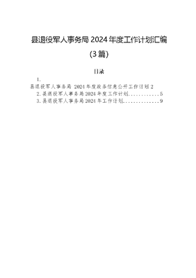 县退役军人事务局2024年度工作计划汇编(3篇)目录1.县退役军人事务局 2024年度政务信息公开工作计划22.县退役军人事务局2024年度工作计划53.县退役军人事务局2024年工作计划..9县退役军人事务局 2024年度政务信息公开工作计划为认真贯彻《中华人民共和国政府信息公开条例》,进一步推进政务信息公开工作,增强我局工作透明度、促进依法行政、提高办事效率、更有效地服务退役军人,结合我局实际,制定2024年度政务信息公开工作计划如下。一、指导思想以XXX新时代中国特色社会主义思想和党的XXX精神为指导,以《中华人民共和国政府信息公开条例》和省、市、县关于政务公开工作的文件要求为依据,紧紧围绕退役军人事务工作,突出重点、讲求实效、注重规范,扎实推进全局政务公开政府信息公开工作规范化、制度化。二、工作原则坚持依法公开、真实公开、注重实效、有利监督的原则,正确处理好信息公开与法治、保密的关系,对退役军人事务工作重点领域、关键环节进行公开公示,保障群众知情权,便利广大退役军人办实事,自觉接受各级群众监督,使政务公开真正成为党和广大退役军人的连心桥。坚持保密原则,对确定为国家秘密的政府信息,法律、行政法规禁止公开的政府信息,以及公开后可能危及国家安全的政府信息和涉及商业秘密、个人隐私等危害第三方合法权益的信息不予公开。三、主动公开内容(一)机构职能、领导班子。公开县本级行政机关内设机构及其职能,领导班子基本情况。(二)政策法规。全面梳理现行有效应予公开的法律、法规、规范性文件、政策解读信息。(三)工作动态和通知公告。及时向社会公布退役军人事务系统日常工作情况,对重要文件、人事信息、就业创业信息、退役军人(军属、军烈属)优待政策等内容向社会予以公开,接受群众监督。(四)财务信息。按照财务公开要求,及时公开本单位位文可居文库——海量学习资料,手机电脑下载www.wenkeju.com年度财务预、决算,重大工程建设、第三方技术支持服务、大(中)型设备招投标和采购等信息。(五)年度报告。及时公布退役军人事务系统本年度政府公开信息年度报告。(六)权力清单。根据退役军人事务系统市级层面行政权力、公共服务事项清单,行政确认、行政给付等不涉密行权事项予以对外公开,接受群众监督。(七)行政执法信息。全面公开执法事项清单、服务指南、人员清单、办理流程、年度报告等要件信息。四、切实做好依申请公开政府信息工作依法做好政府信息依申请公开工作,完善工作流程。依法办理涉及政府信息公开的行政复议和行政应讼工作,认真受理、办理群众举报、投诉。五、措施保障(一)加大工作力度,确保信息报送及时、全面、准确。及时发布和更新依法应主动公开的政府信息。不断建立健全工乍机制,维护政府信息公开工作的正常秩序。(二)进一步提高政府信息公开质量。通过学习、培训等方式,继续提高有关信息报送员的写作能力,确保信息质量,为领导决策提供科学参考。(三)抓好信息公开的规范运作。进一步规范政府信息公开的内容、方式、程序和监督保障措施,应当在相关公开渠道上公开本单位开展政府信息公开工作的相关受理地点、联系方式、受理条件、审查资格和办理程序、答复规定等内容形式形成的依申请公开受理办理机制和指南。(四)做好重要基础工作。做好主动公开信息的保密审查工作;公布本行政机关的上一年度政府信息公开工作报告,并故好当年政府信息公开年度计划公开,按时按规定报送需公开的各项材料。(五)强化责任追究。将信息公开工作落实到个人,明确文可居文库——海量学习资料,手机电脑下载www.wenkeju.com责任,使政府信息公开的监督经常化、制度化、信息化,不断提高人民群众对政府的满意度,为全县经济社会的持续、快健康发展提供良好的政务环境。县退役军人事务局2024年度工作计划 2024年,XX县退役军人事务工作坚持以XXX新时代中国特色社会主义思想为指导,深入贯彻落实党的XXX精神和XXXXXX关于退役军人工作重要论述,继续推动退役军人工作按照十四五规划目标任务,按照省市县开局即决战、起步即冲刺和三个务必的要求推动退役军人工作守正创新、开拓进取。基本思路是两条腿走路,一是努力抓好政策制度规范高效运行,二是服务(部队和退役军人)更加精细精准,努力让军人成为全社会尊崇的职业这一目标在XX大地形成稳定的社会思想基础。基本目标是在县委县政府领导下,在上级业务部门的具体指导下,着力实现历史问题妥善解决、广大退役军人生活更加美好、军政军民团结更加巩固、军民融合发展迈上新台阶、基层退役军人工作在新的发展阶段迈入高质量发展进程。持之以恒做好以下几项工作:(一)努力涵养高度重视退役军人工作的思想自觉、政治自觉和行动自觉。持续系统学习XXX新时代中国特色社