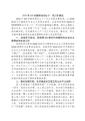 2024年XX市教育局关心下一代工作要点2024年XX市教育局关心下一代工作的总要求是:以XXX新时代中国特色社会主义思想为指导,全面贯彻党的XXX和XXXXXX关于关心下一代工作的重要指示精神,紧扣立德树人根本任务,充分发挥五老优势,大力推动关工委优质化建设均衡发展,扎实推进关心下一代工作走在前、做示范,努力为培养德智体美劳全面发展的时代新人作出新贡献。一、加强学习培训,坚持用XXX新时代中国特色社会主义思想统领各项工作坚持把学习贯彻XXX新时代中国特色社会主义思想和党的XXX精神作为首要政治任务,自觉运用XXX新时代中国特色社会主义思想武装头脑、指导实践、推动工作,坚定捍卫两个确立、坚决做到两个维护,切实把党的XXX作出的战略部署落实到推动新时代关心下一代事业发展的全过程各方面。坚持把学习XXXXXX对关心下一代工作、青少年工作和江苏工作的重要讲话指示精神作为学习培训的重中之重,把国家、省、市关于关心下一代工作最新部署和要求纳入培训内容,对全市各级教育关工委工作人员和五老骨干分期分批开展轮训,促进关工委工作人员准确把握新时代关工委工作的重大意义、总体要求和主要任务,切实增强关工委在推动教育高质量发展中的政治责任感和崇高使命感。二、强化党建引领,扎实推进关工委工作上水平上台阶深入贯彻落实党建带关建工作机制,努力形成党委统一领导、党政齐抓共管、关工委主动作为、有关部门积极配合、社会各界广泛参与的关心下一代工作格局,将关工委工作纳入教育党建,融入五育并举和大思政格局。各地各校要安排关工委工作人员和五老代表参加党组织开展的学习培训,配齐配强关工委领导班子,落实好单位党政主要负责人担任关工委主任、分管领导和老同志担任常务副主任、常务副主任和秘书长双配置的要求。执行好党组织定期听取关工委工作汇报、关工委在职领导年度述职、关工委成员部门议事制度。保证关工委工作经费纳入各级教育行政部门和学校的年度预算,做到关工委有专门办公场所,配备相应办公条件,保障驻会老同志有工作补贴。加强五老队伍建设,着力在五老接续机制建设、优质资源共享、先进典型宣传上下功夫,鼓励和支持更多五老特别是退休党员干部、优秀教师积极参与关心下一代工作,全面打造各级教育关工委坚强有力的带头人队伍、奋发有为的骨干者队伍、热心参与的志愿者队伍。三、坚持立德树人,持续深化青少年理想信念教育坚持把党的创新理论武装作为铸魂之本,建好建强以五老为主体的讲师团,创新宣讲形式,深入开展面向青少年的学习宣传工作,增强青少年与党同心、跟党奋斗的坚定意志,自觉担负请党放心、强国有我的时代使命。坚持把理想信念教育作为青少年思想建设的战略任务,以庆祝中华人民共和国成立75周年为契机,广泛发动、扎实开展老少同声爱国情同心奋进新征程和读懂中国等系列教育活动。抓好科技强国,担当有我我以祖国为荣文化塑造未来,读书点亮人生和祖国在我心中 爱国从我做起等主题读书征文活动。全面实施文化塑造未来铸魂工程,充分挖掘XX本地优秀历史文化资源,用好《红色云溪》《逐梦云溪》《菁华云溪》等青少年修身读本,持续开展XX三杰作引领,红色基因入我心主题教育,全力打造教育关工委行走的思政课工作新品牌。四、夯实工作基础,积极推进关工委建设优质均衡发展根据省教育系统关工委的统一部署,进一步优化完善优质化建设均衡发展实施方案,切实加强对学校关工委优质化建设的指导和督查。列入第三批关工委优质化建设创建的学校,要对照全省关工委优质化建设均衡发展基本要求,找差距、补缺口,年内力争全市近60%的中小学、幼儿园基本达到关工委优质化建设标准。积极开展关工委优质化建设均衡发展调查研究,文可居文库——海量学习资料,手机电脑均可下载www.wenkeju.com重点围绕党建带关建基层关工委优质化建设长效机制的建立等主题撰写优秀工作论文和调研报告。五、拓展平台载体,不断提高青少年精准关爱工作实效各级教育关工委根据青少年学生的实际需求,搭建好能为青少年提供精准服务的关爱工作平台,引导青少年学生形成自尊自信、理性平和、积极向上的人生态度。重点关注青少年心理健康,协同相关职能部门,加强生命教育、挫折教育,及时做好情感关怀、心理疏导、情绪引导、危机干预。进一步做优做强各地各校关工委多年来形成的结对帮教爱心助学家教讲坛四点钟课堂青蓝工程等工作品牌。围绕双减后中小学生的新需求和增长点,运用多种方式,协同多方力量,发挥教育系统关工委五老师资力量丰富等优势,助力课后服务。拓展代理家长制爱心结对等工作品牌新内涵,用心用情帮助困难学生,关爱留守儿童,坚持不懈地为青少年做好事、办实事、解难事。六、深化协同共育,助力创设优良育人环境深入落实《