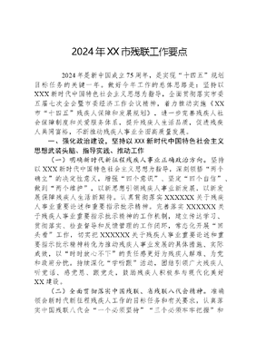 2024年XX市残联工作要点 2024年是新中国成立75周年,是实现十四五规划目标任务的关键一年。做好今年工作的总体思路是:坚持以XXX新时代中国特色社会主义思想为指导,全面贯彻落实市委五届七次全会暨市委经济工作会议精神,着力推动实施《XX市十四五残疾人保障和发展规划》,进一步完善残疾人社会保障制度和关爱服务体系,提升残疾人生活品质,促进残疾人共同富裕,不断推动残疾人事业全面高质量发展。一、强化政治建设,坚持以XXX新时代中国特色社会主义思想武装头脑、指导实践、推动工作(一)明确新时代新征程残疾人事业正确政治方向。坚持以XXX新时代中国特色社会主义思想为指导,深刻领悟两个确立的决定性意义,增强四个意识、坚定四个自信、做到两个维护,以新思想引领残疾人事业新发展,以新发展保障残疾人生活新期待。认真贯彻落实XXXXXX关于残疾人事业重要论述和重要指示批示精神。完善落实XXXXXX关于残疾人事业重要指示批示精神的工作机制,建立传达学习、贯彻落实、检查督导和反馈管理的工作闭环,常态化开展回头看工作,切实把XXXXXX关于残疾人事业重要论述和重要指示批示精神转化为推动残疾人事业发展的具体措施、实际成效,以时时放心不下的责任感更好为残疾人解难、为党和政府分忧。持续深化学听跟活动,团结引领广大残疾人听党话、感党恩、跟党走,鼓励残疾人积极参与现代化美好XX建设。(二)全面贯彻落实中国残联、省残联八代会精神。准确领会新时代新征程残疾人工作的目标任务和有关要求,认真落实中国残联八代会一个必须坚持三个必须牢牢把握和省残联八代会四个必须四个增强基本要求,围绕残疾人事业全面发展、高质量发展,着力在补短板、强弱项、固底板、扬优势上下功夫,完善残疾人社会保障制度和关爱服务体系,强化残疾人事业的创新驱动、法治保障和风险防范,与深入实施《XX市十四五残疾人保障和发展规划》相结合,与聚焦补齐基本公共服务短板和实施残疾人民生实事等重点工作相结合,与巩固拓展主题教育成果和残疾人脱贫攻坚成果相结合,持续深化改革,细化工作措施,加大工作力度,推动会议精神落实落细。以高质量实施残疾人民生实事为抓手,坚持尽力而为、量力而行,兜住、兜准、兜牢残疾人民生底线。二、聚焦重点工作,进一步完善残疾人社会保障制度和关爱服务体系(一)聚焦残疾人关切,推动民生保障更加稳定、更高水平1.巩固拓展残疾人脱贫攻坚成果。做好防止返贫致贫监测数据与残疾人数据比对和信息共享,精准掌握残疾人监测对象在康复、教育、就业、社保、家庭无障碍改造等方面的困难需求,加大帮扶力度,确保残疾人不发生规模性返贫。贯彻落实《关于加大对农村残疾人就业帮扶工作力度的通知》,为有需求的特别是农村困难残疾人开展职业技能培训、创业培训和实用技术培训。宣传金融助残政策,助力残疾人就业增收。做好定点帮扶工作。2.加强残疾人社会救助和社会保障。贯彻落实《关于加强低收入人口动态监测做好分层分类社会救助工作的意见》,推动符合条件的残疾人纳入社会救助范围。动态掌握各类困难残疾人及家庭真实需求,巩固特殊困难残疾人单独申请纳入低保政策成果。全面提升残疾人两项补贴精准管理水平,配合民政部门推进数据共享和复核督导工作。实施阳光家园计划托养服务项目,开展就业年龄段智力、精神和重度肢体残疾人托养服务不少于700人,稳步提升托养服务能力。指导相关县区文可居文库——海量学习资料,手机电脑均可下载www.wenkeju.com实施好残疾人商业保险试点工作。配合做好残疾人相关老龄工作。(二)聚焦残疾人需求,推动公共服务更加优质、更为可及1.提升残疾人康复服务质效(1)推深做实残疾人康复民生实事。继续开展困难残疾人康复工程,做好残疾儿童康复救助、困难精神残疾人药费补助和残疾人基本型辅具适配补贴项目,确保0-6岁有康复需求的残疾儿童应救尽救。制定残疾人康复自助互助方案,贯彻《残疾儿童康复基本公共服务规范》,推进残疾儿童定点康复机构规范化建设,落实《XX市残疾儿童康复救助定点机构康复服务协议管理实施细则(试行)》,加强康复定点机构规范化评估与监管,规范实施定点服务机构监督。开展肢体残疾儿童、孤独症儿童早期干预服务项目,推动残疾儿童医疗、教育、康复等工作的深度融合。(2)巩固提升残疾人康复服务能力。持续加强康复专业人才队伍建设,认真开展各类康复专业人才规范化培训,积极推荐国培参训教师,建立稳定的专业人才队伍,将培训向基层不断推进,打通残疾人康复服务最后一公里。开展残疾人自助互助康复服务工作,持续推进残疾人家庭医生签约服务应签尽签,总结提炼残疾人家庭医生签约服务重点联系点试点暨康复之家建设工作经验,不断提高残疾人康复服务质量。推进互联网+辅助器具服务,全面实施《XX市残疾人基本